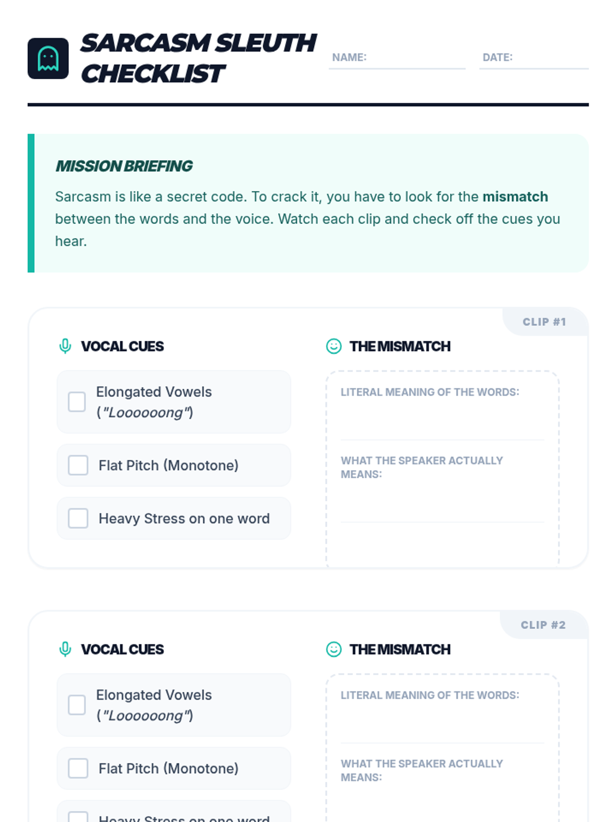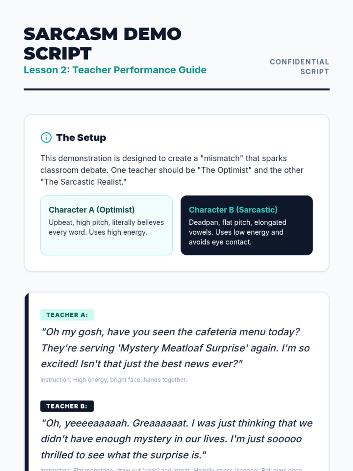 This lesson focuses specifically on the mismatch between words and tone that creates sarcasm. Students watch sitcom clips to identify the specific vocal cues (elongated vowels, flat affect) that signal sarcasm.