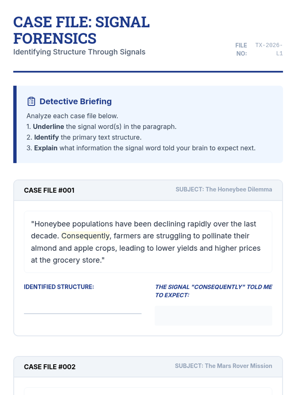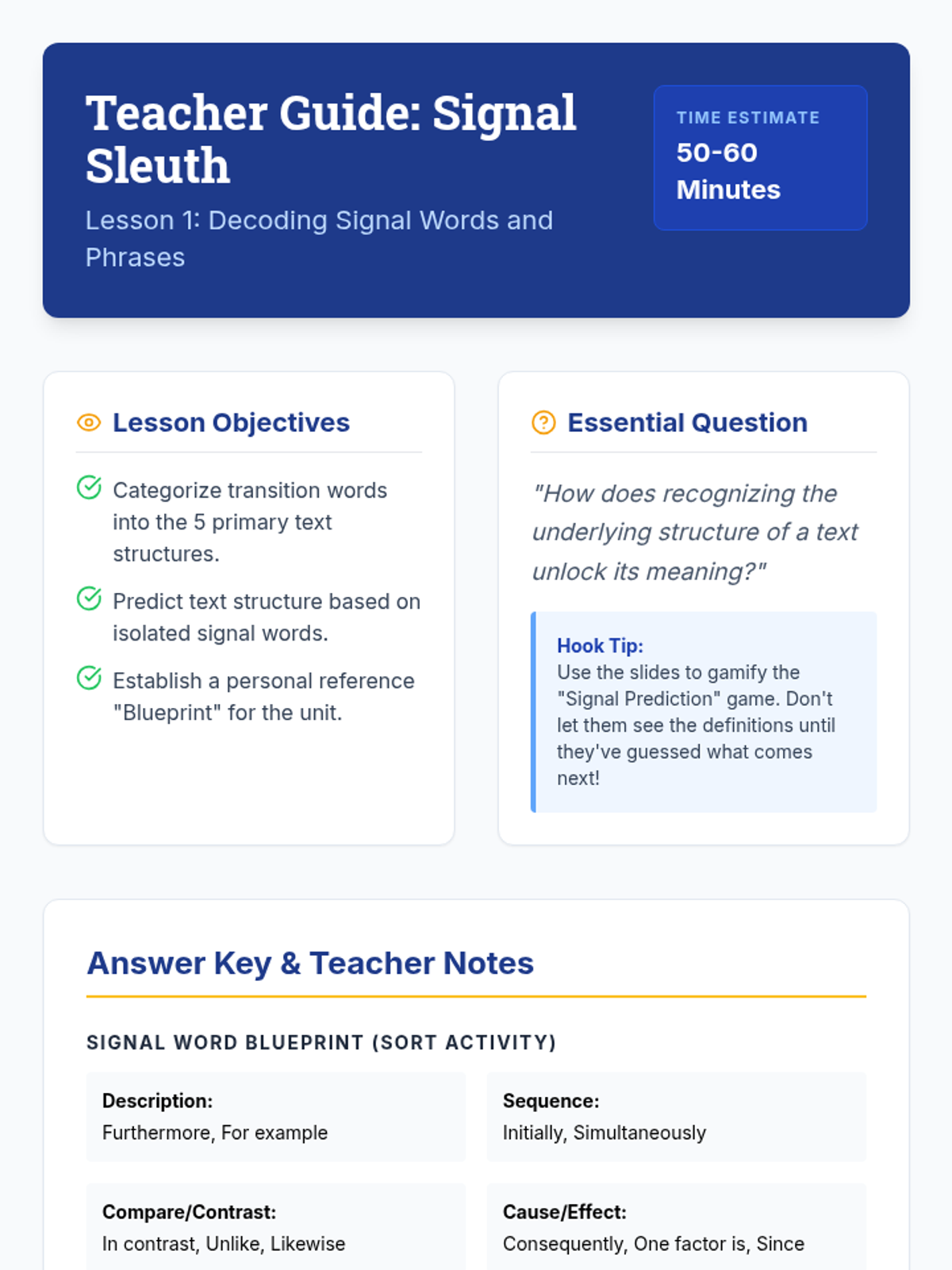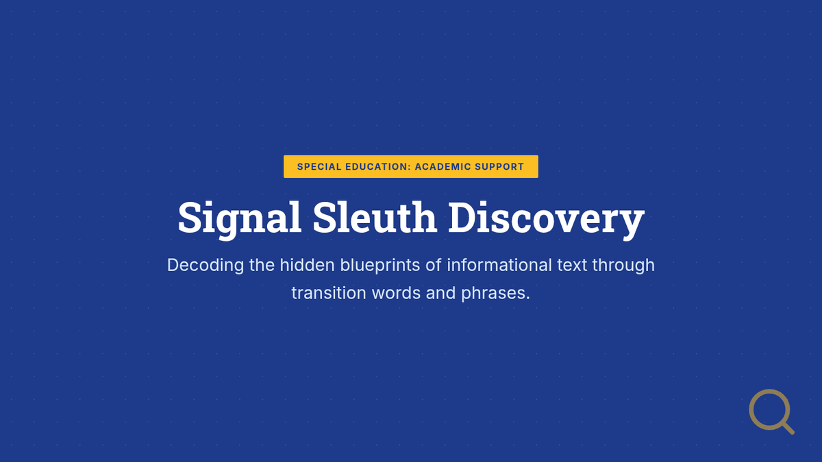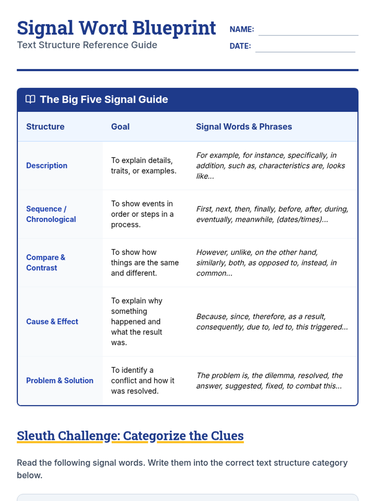 Students act as 'Signal Sleuths' to categorize transition words and phrases that indicate specific text structures, creating a personal reference blueprint.