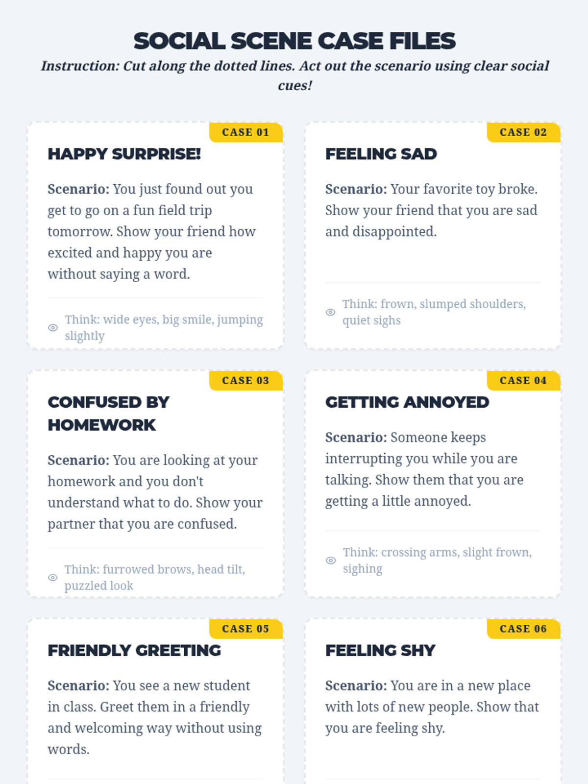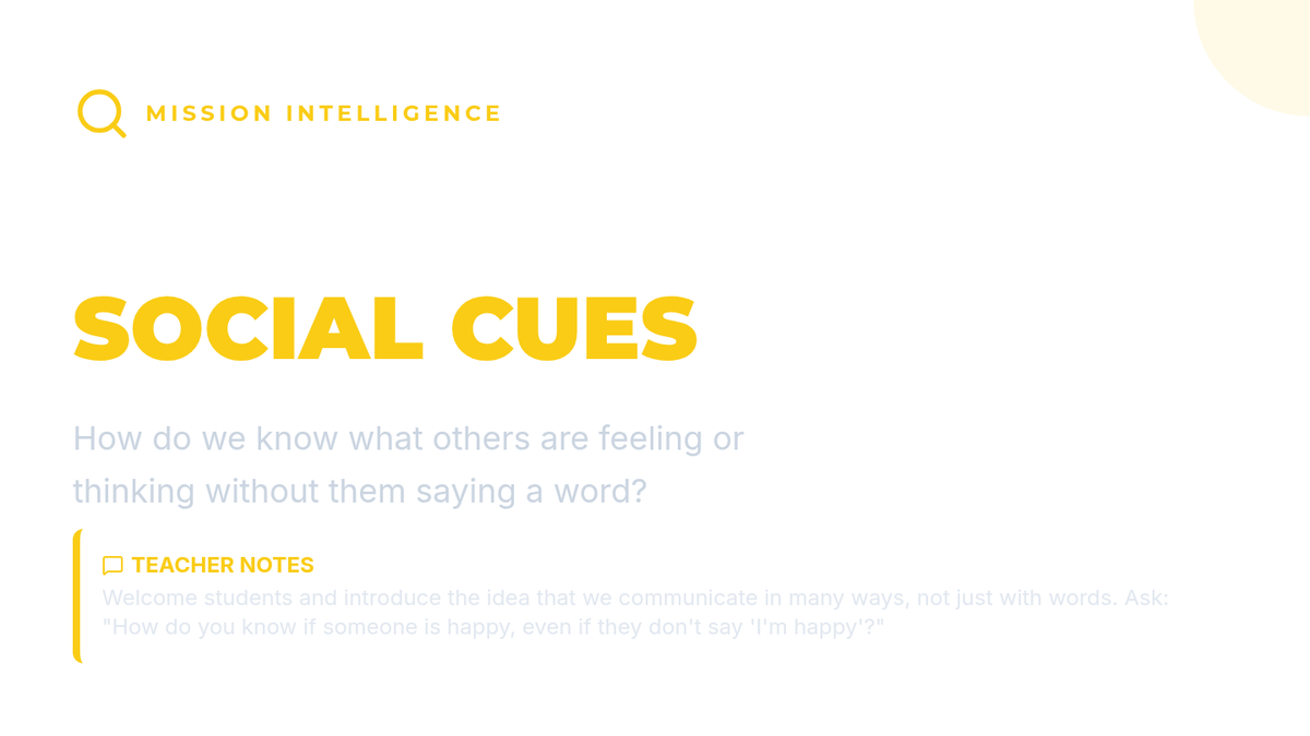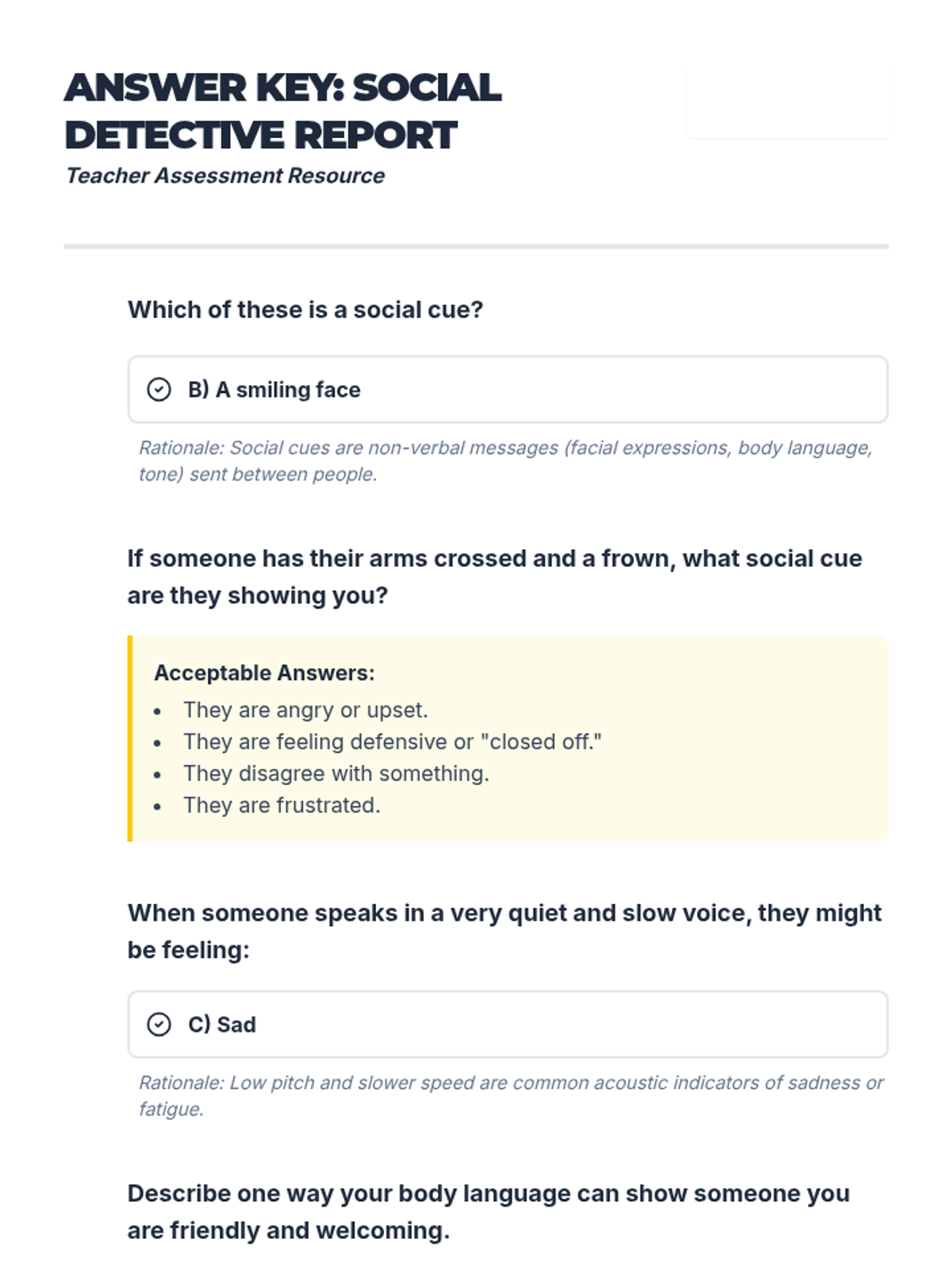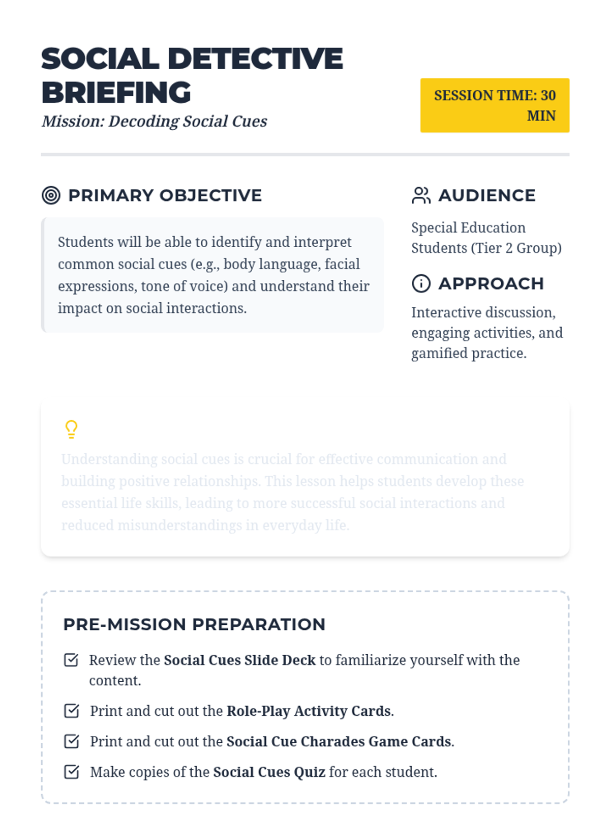 A 30-minute Tier 2 social skills lesson focused on identifying and interpreting facial expressions, body language, and tone of voice. Students engage in interactive discussion, role-play scenarios, and a charades game to practice their social detective skills.