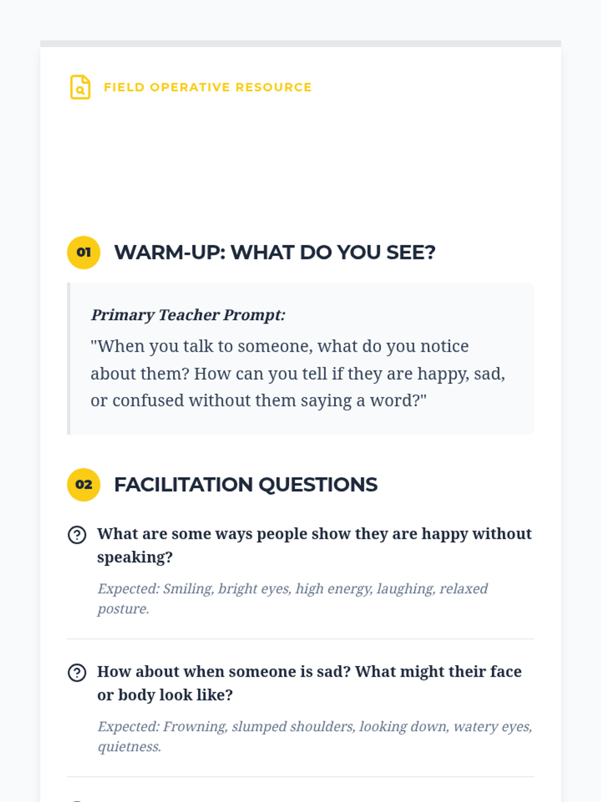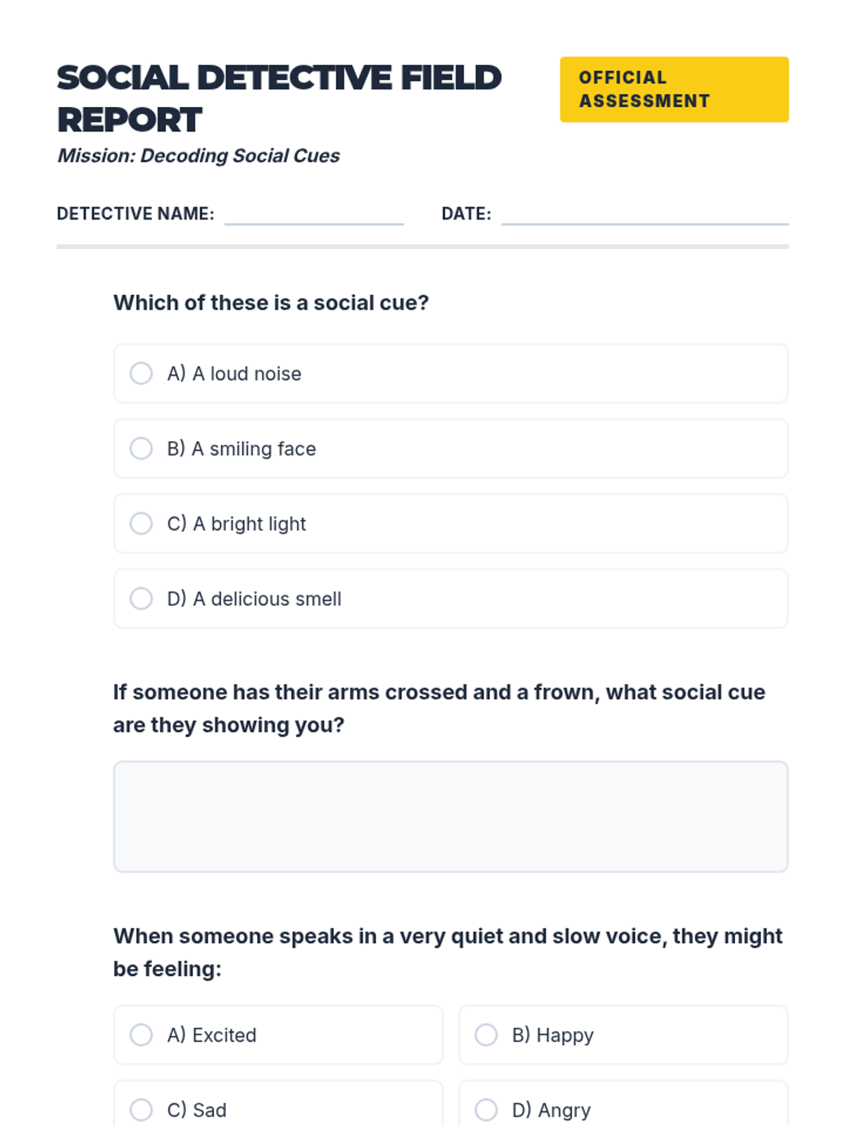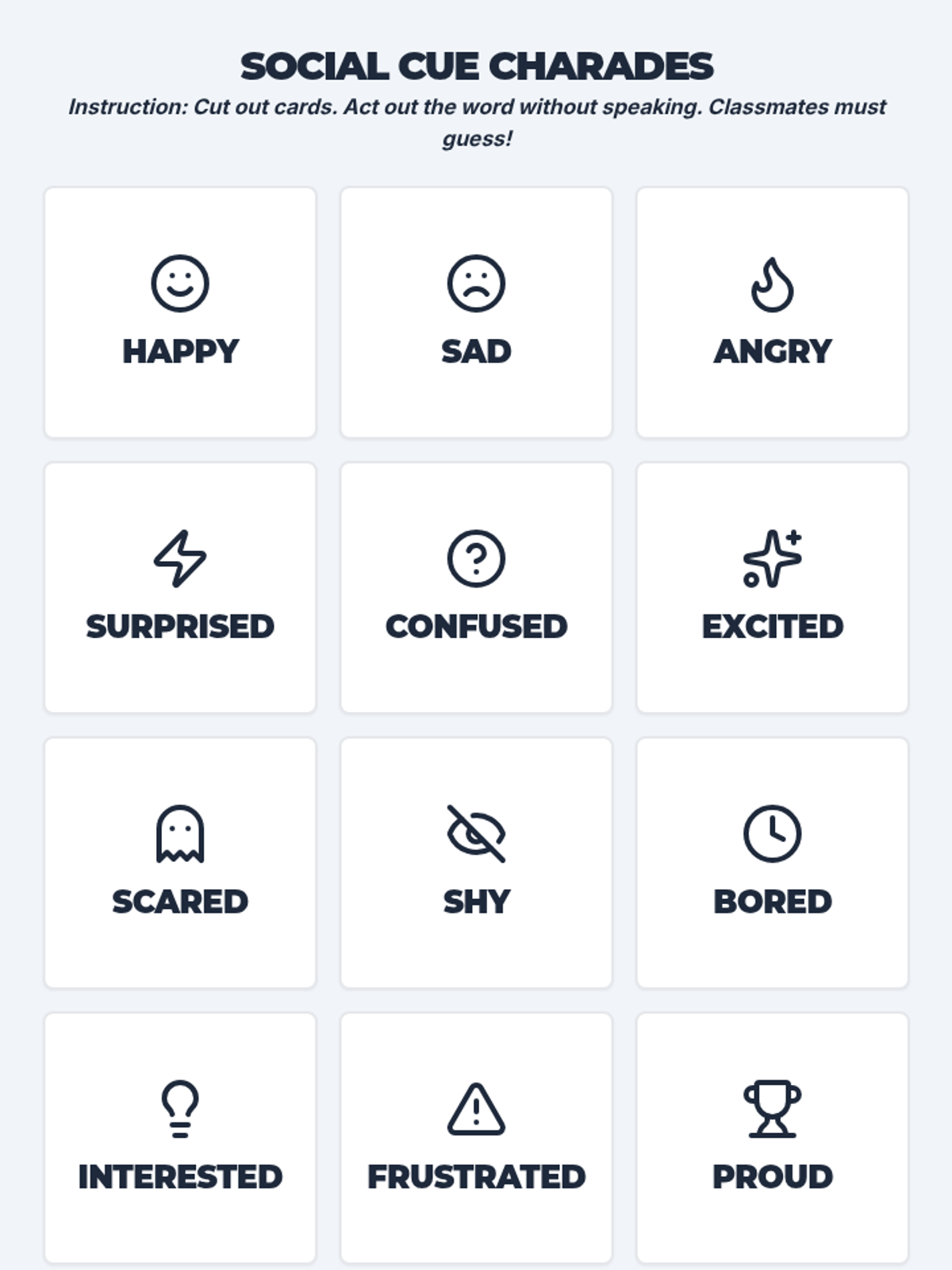 A 30-minute Tier 2 social skills lesson focused on identifying and interpreting facial expressions, body language, and tone of voice. Students engage in interactive discussion, role-play scenarios, and a charades game to practice their social detective skills.