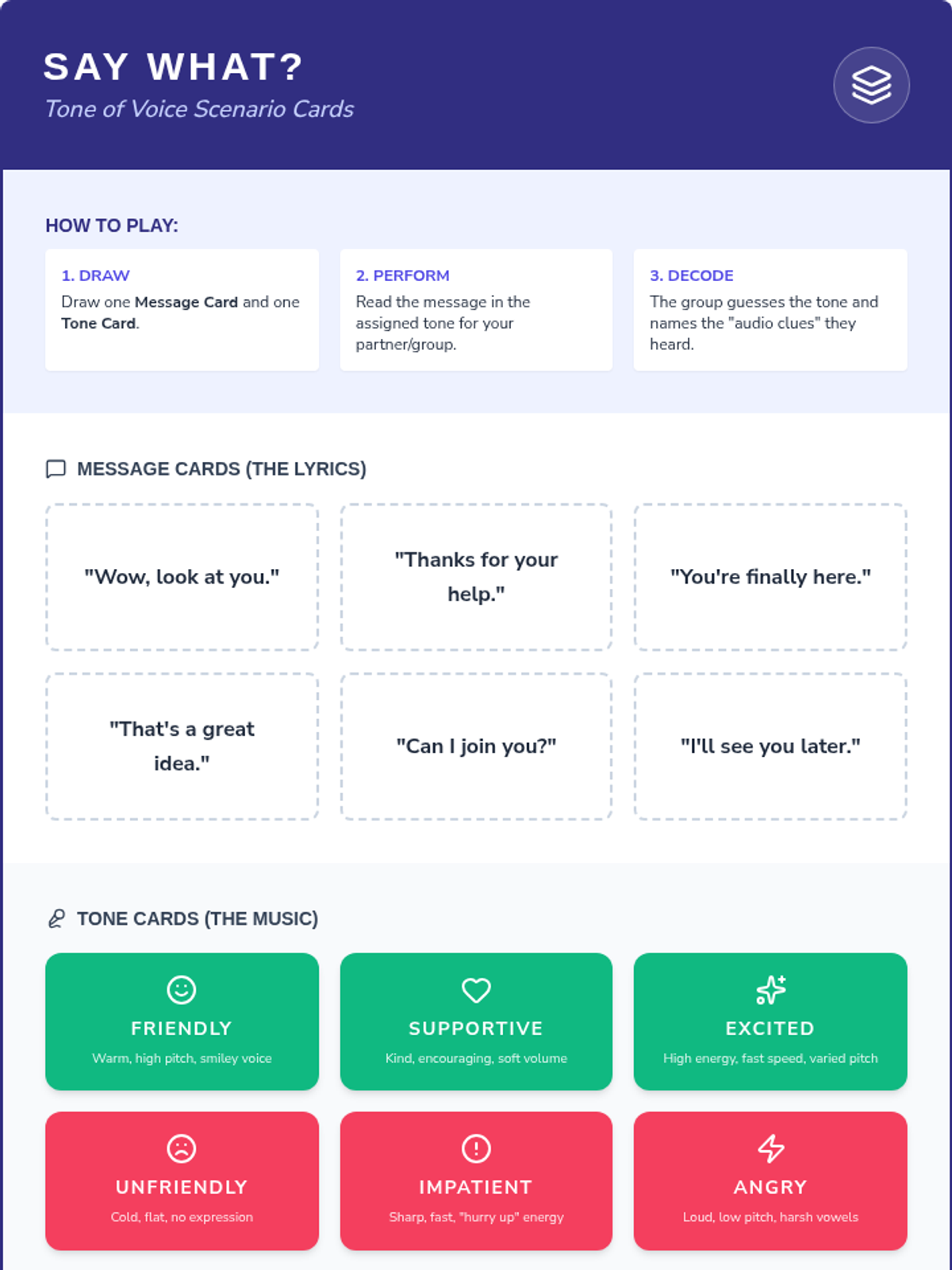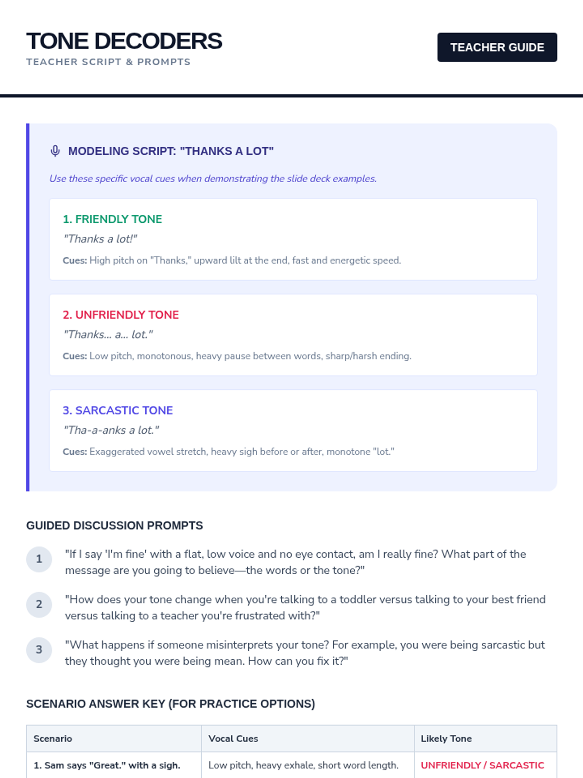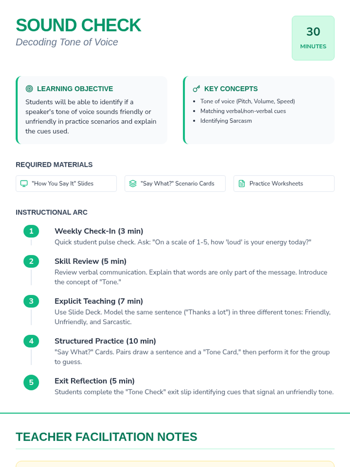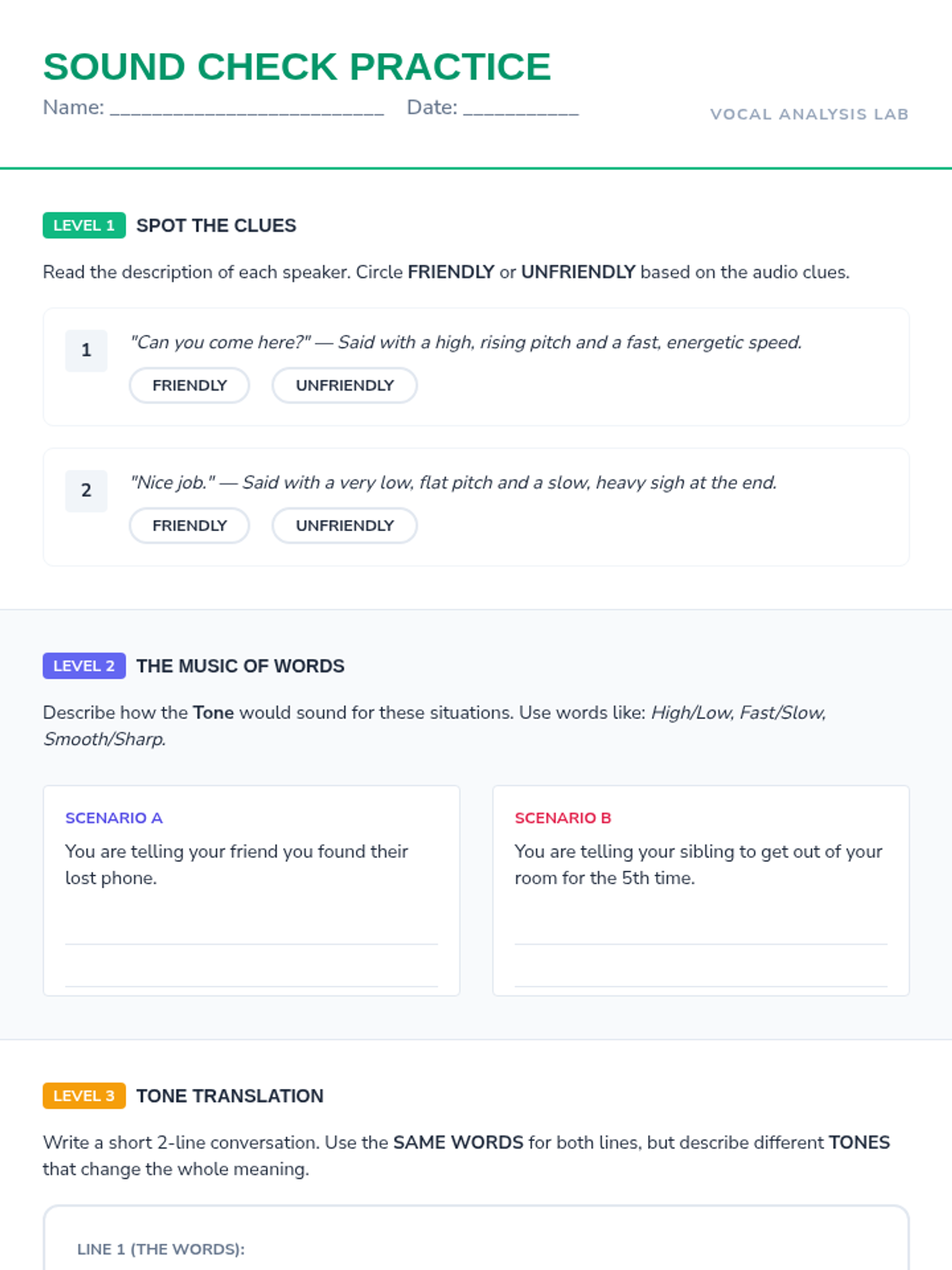Students learn to distinguish between friendly and unfriendly tones of voice by analyzing verbal and non-verbal cues, exploring sarcasm, and practicing auditory decoding in various social scenarios.
