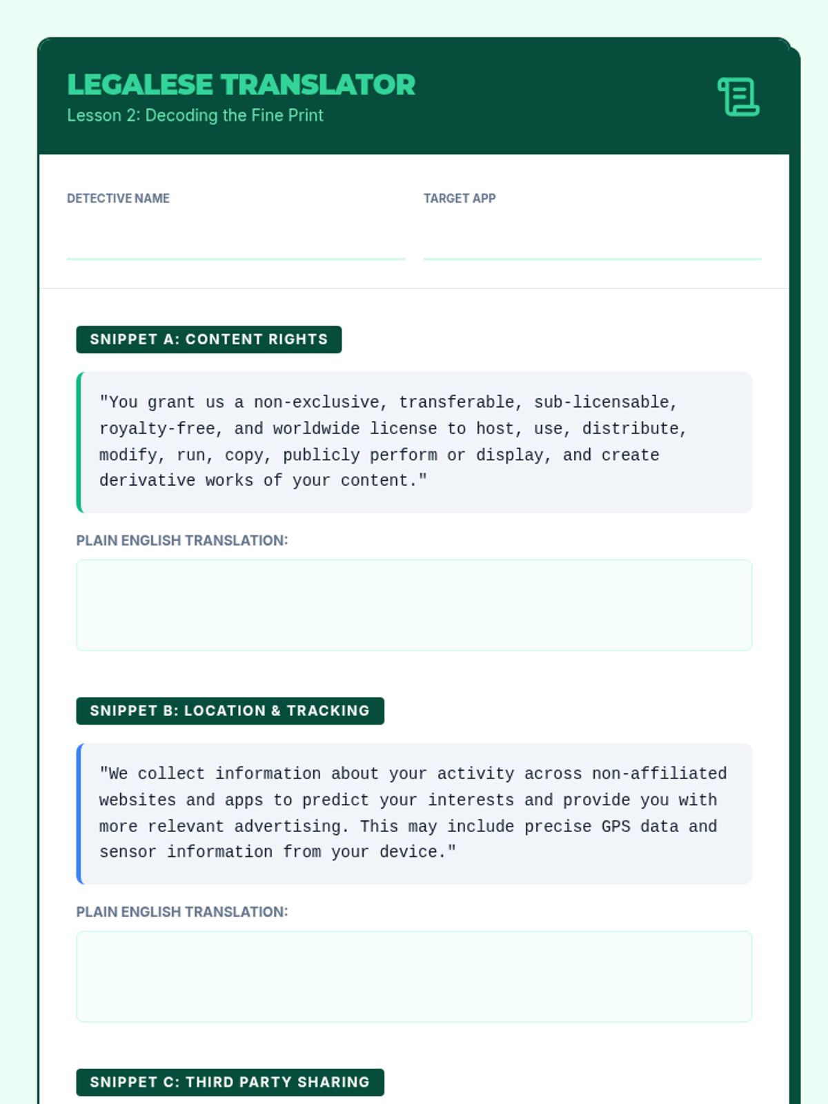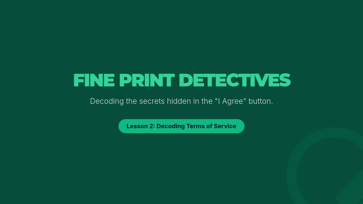A hands-on workshop where students decode complex 'Terms of Service' agreements to uncover the hidden permissions and rights they grant to technology companies.