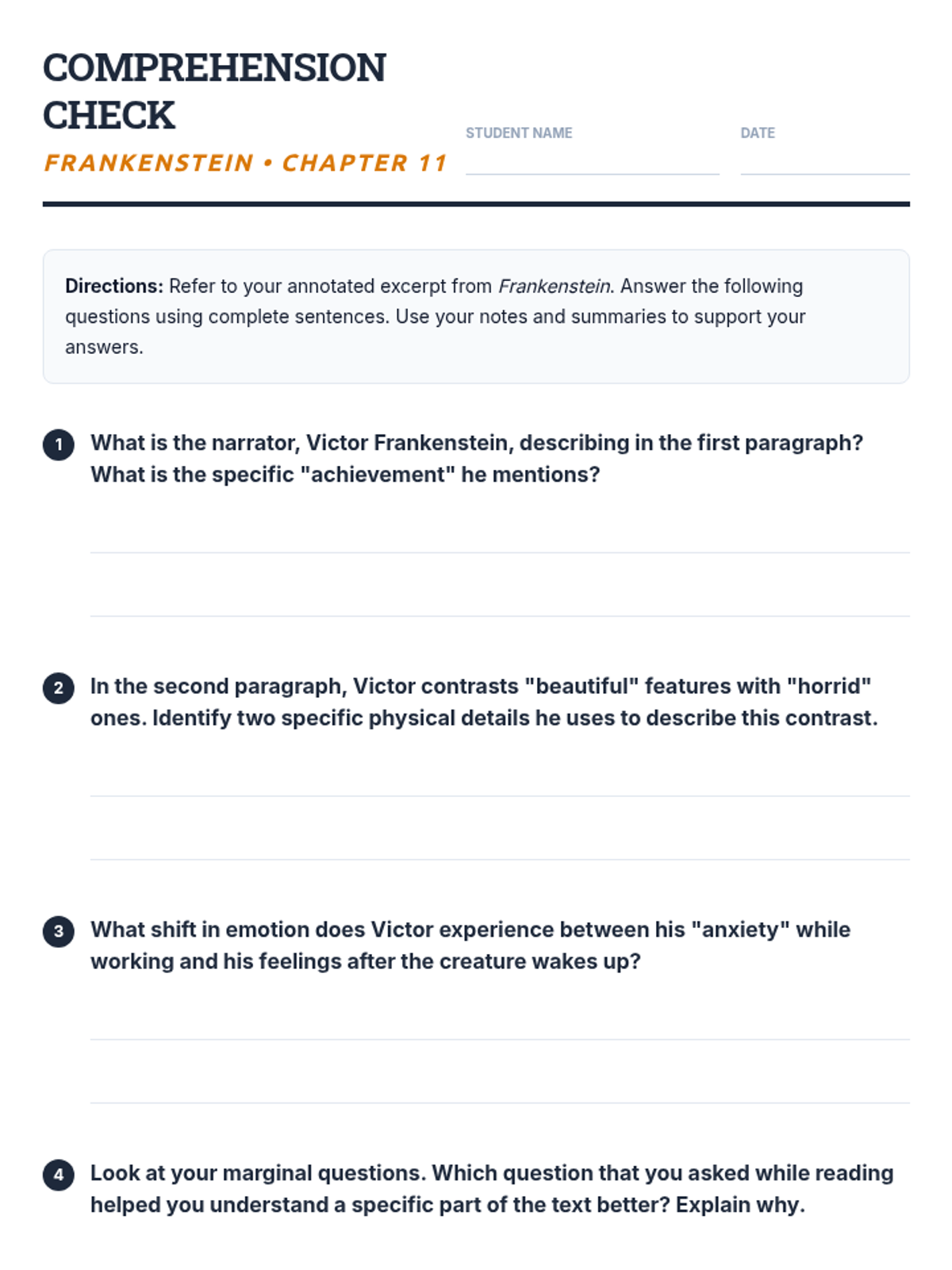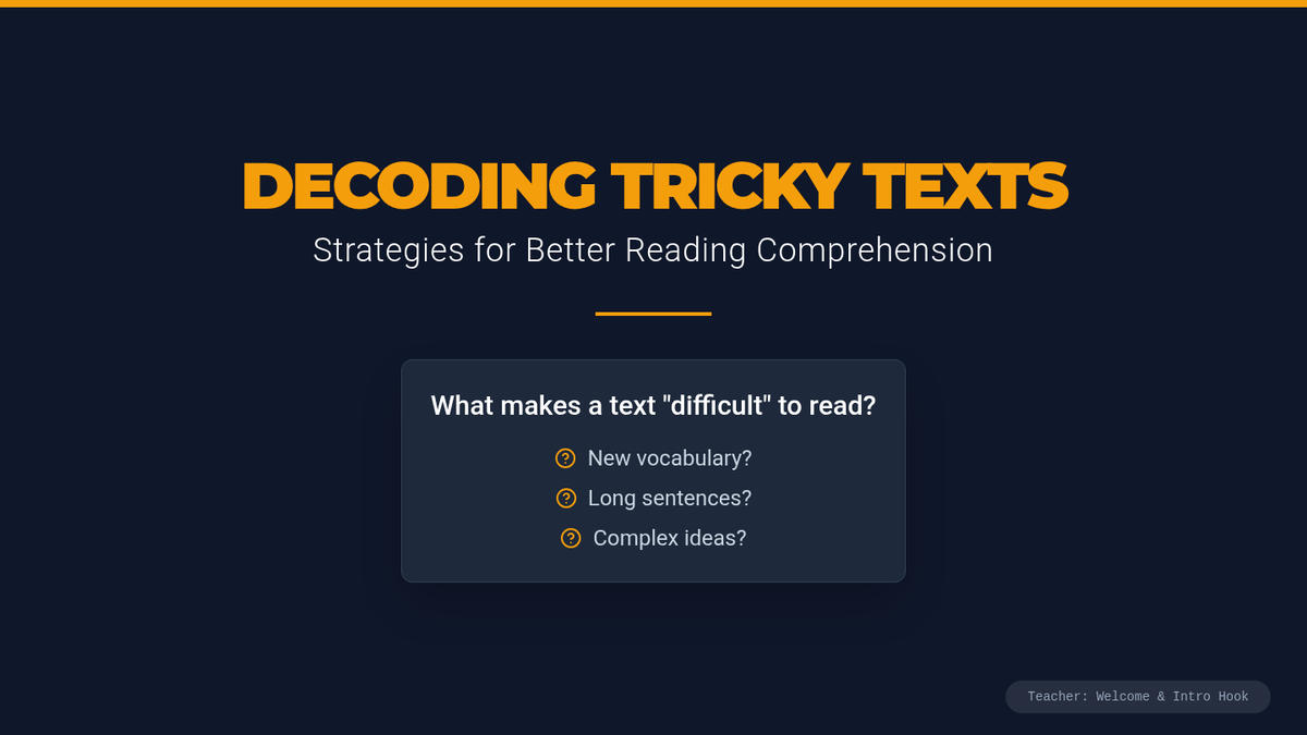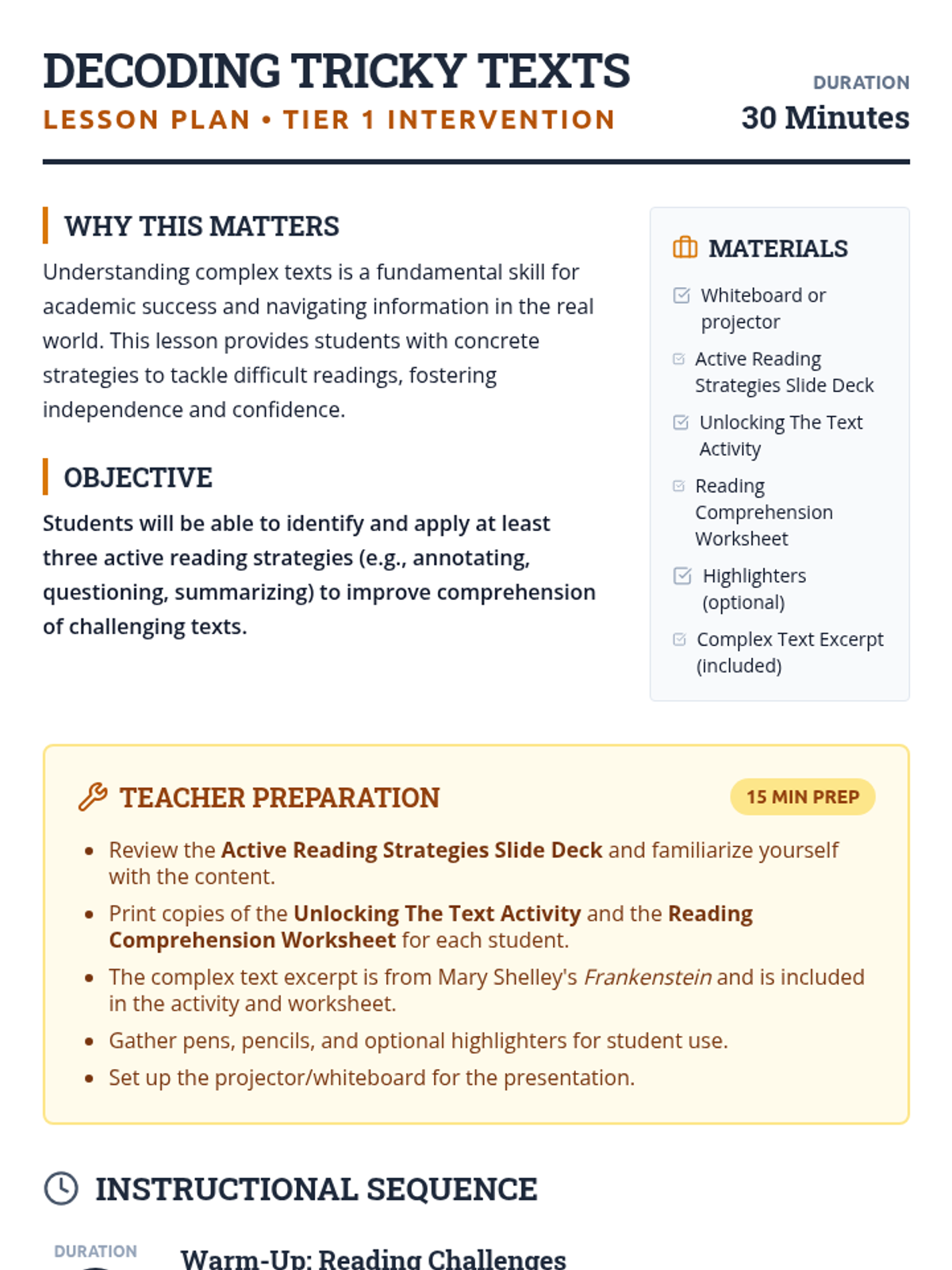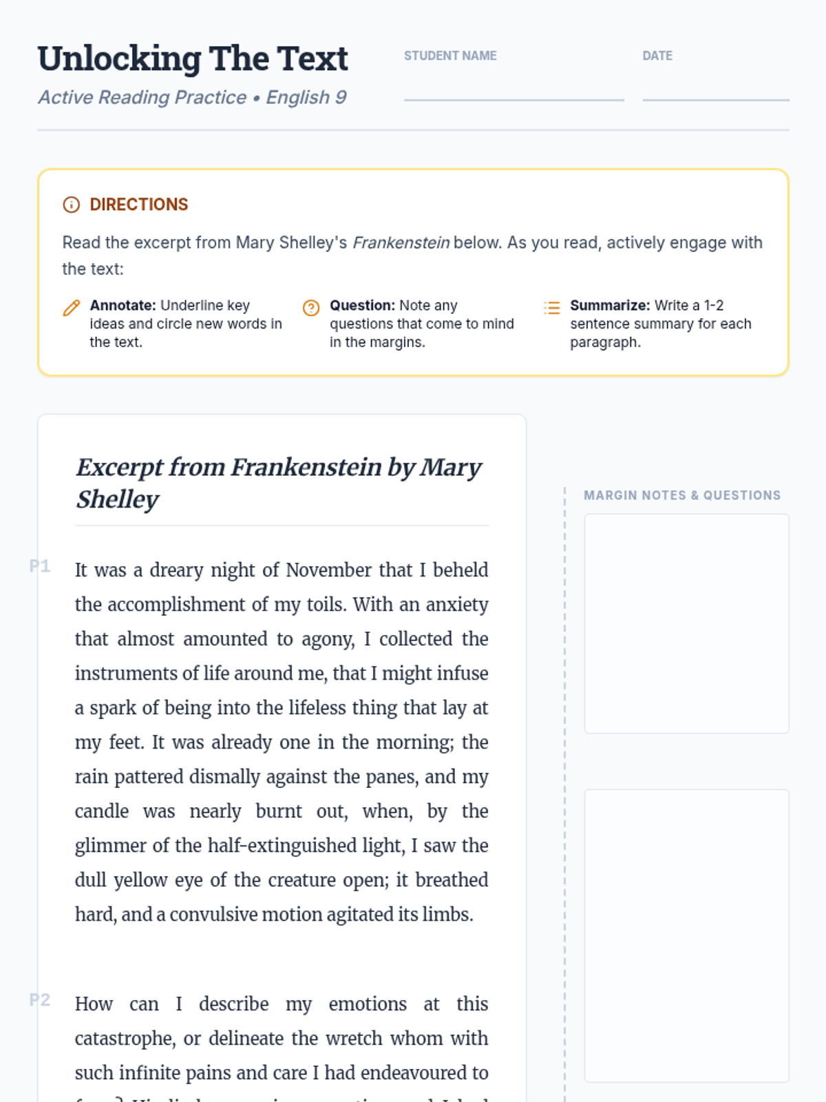 A 30-minute lesson for 9th-grade English students focused on active reading strategies (annotating, questioning, and summarizing) to improve comprehension of complex texts. Students practice these strategies using a classic excerpt from Mary Shelley's Frankenstein.