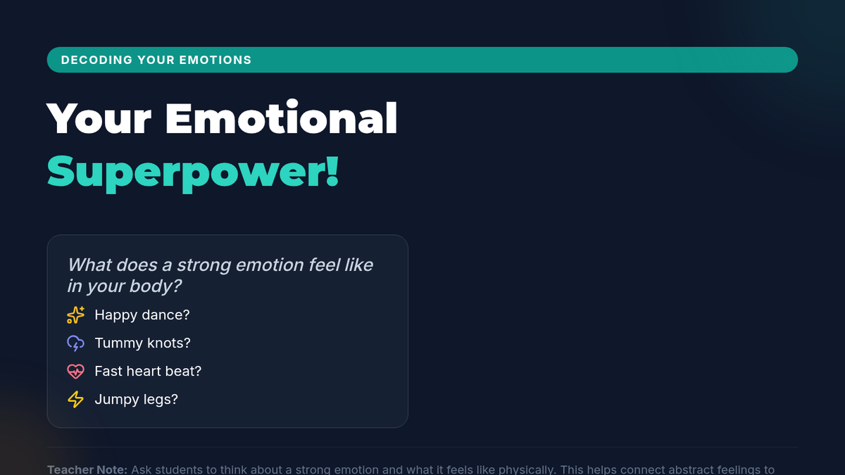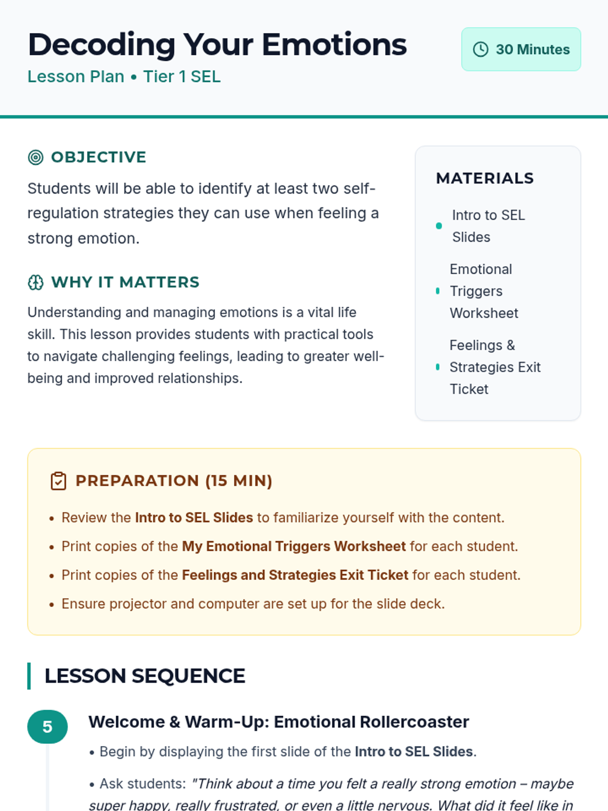 A 30-minute SEL lesson for middle schoolers focusing on identifying emotional triggers and developing self-regulation strategies to navigate strong feelings.