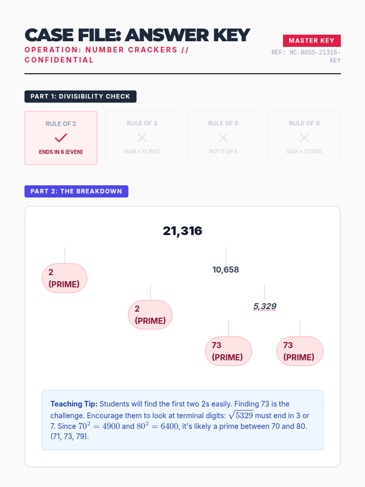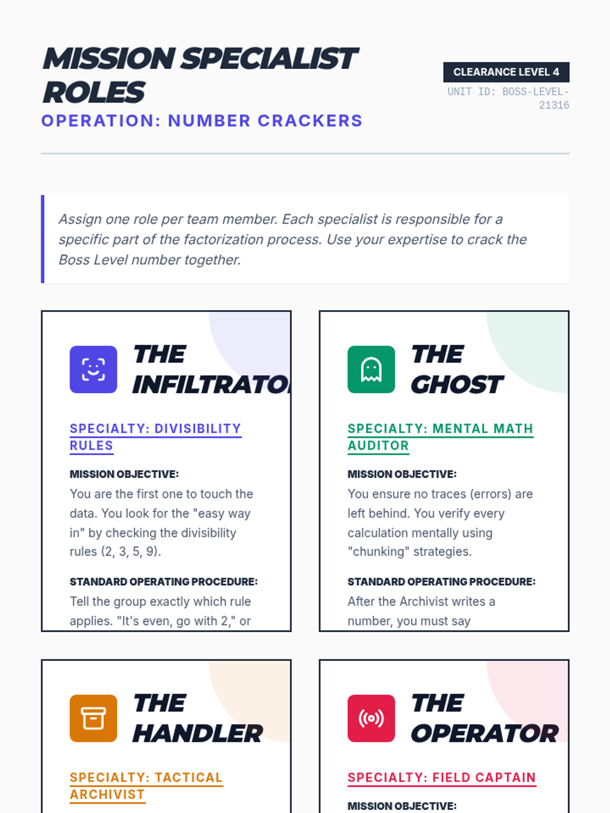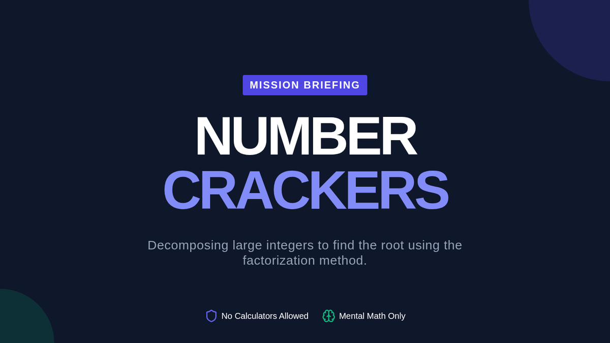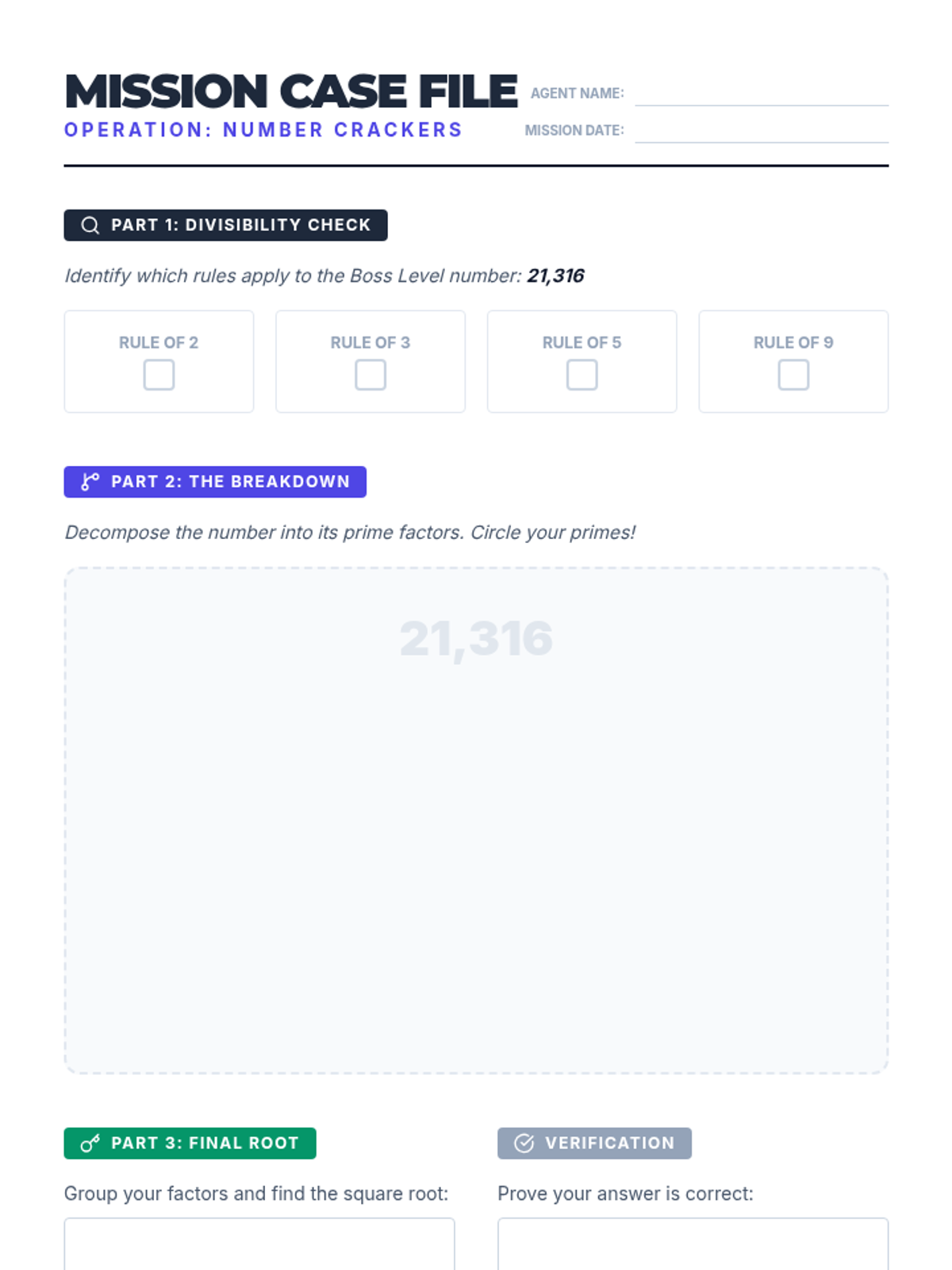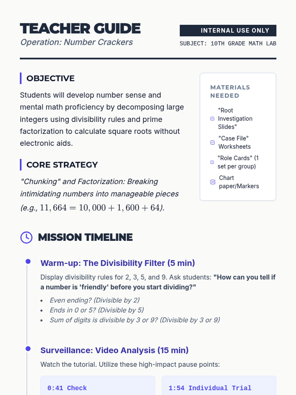A remedial 10th-grade math lesson focused on decomposing large integers through prime factorization to find square roots without a calculator. Students use mental math strategies and divisibility rules to solve 'Boss Level' numerical challenges.