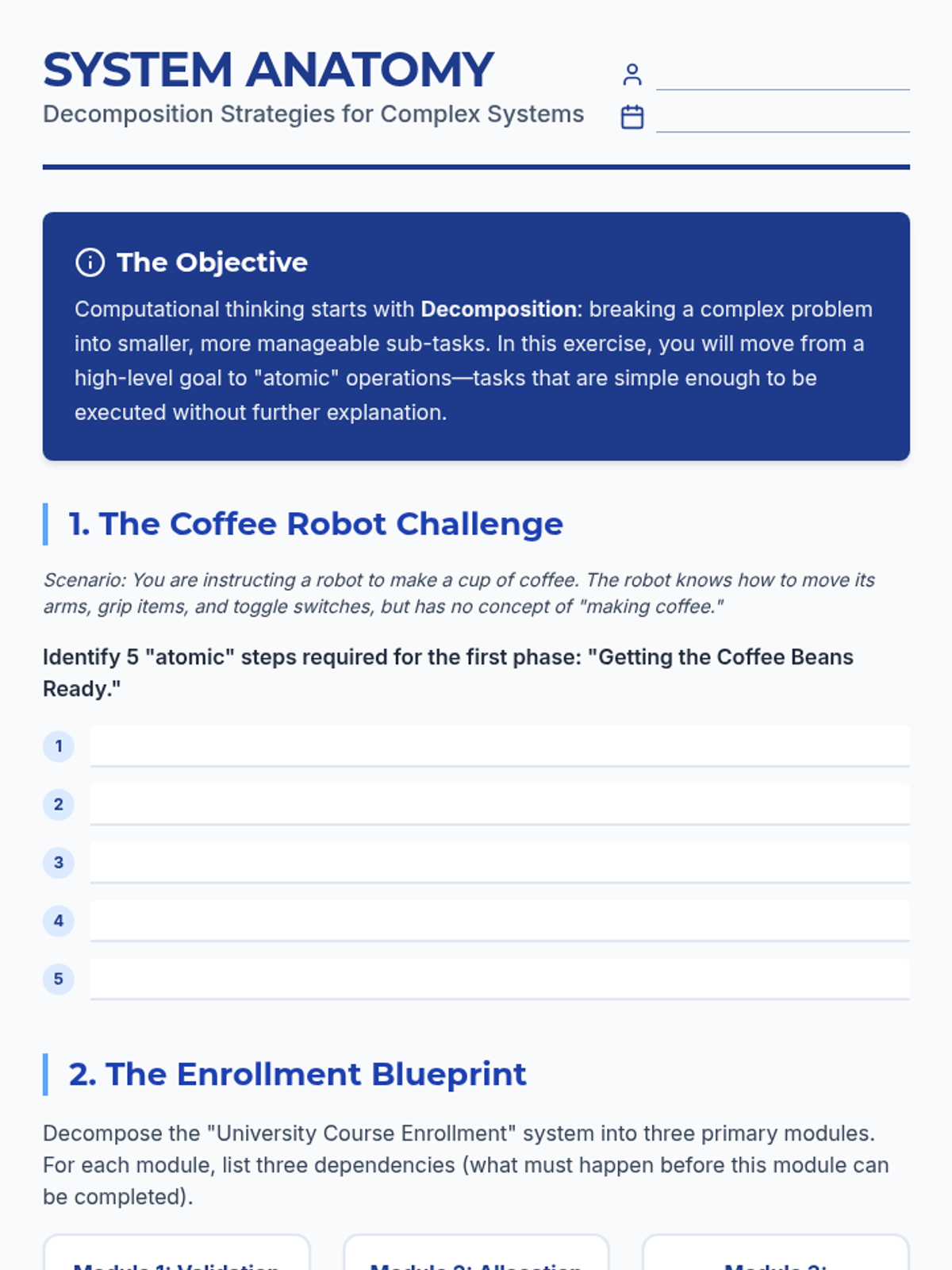 Students analyze complex non-digital systems to practice breaking them down into atomic sub-tasks and mapping dependencies.