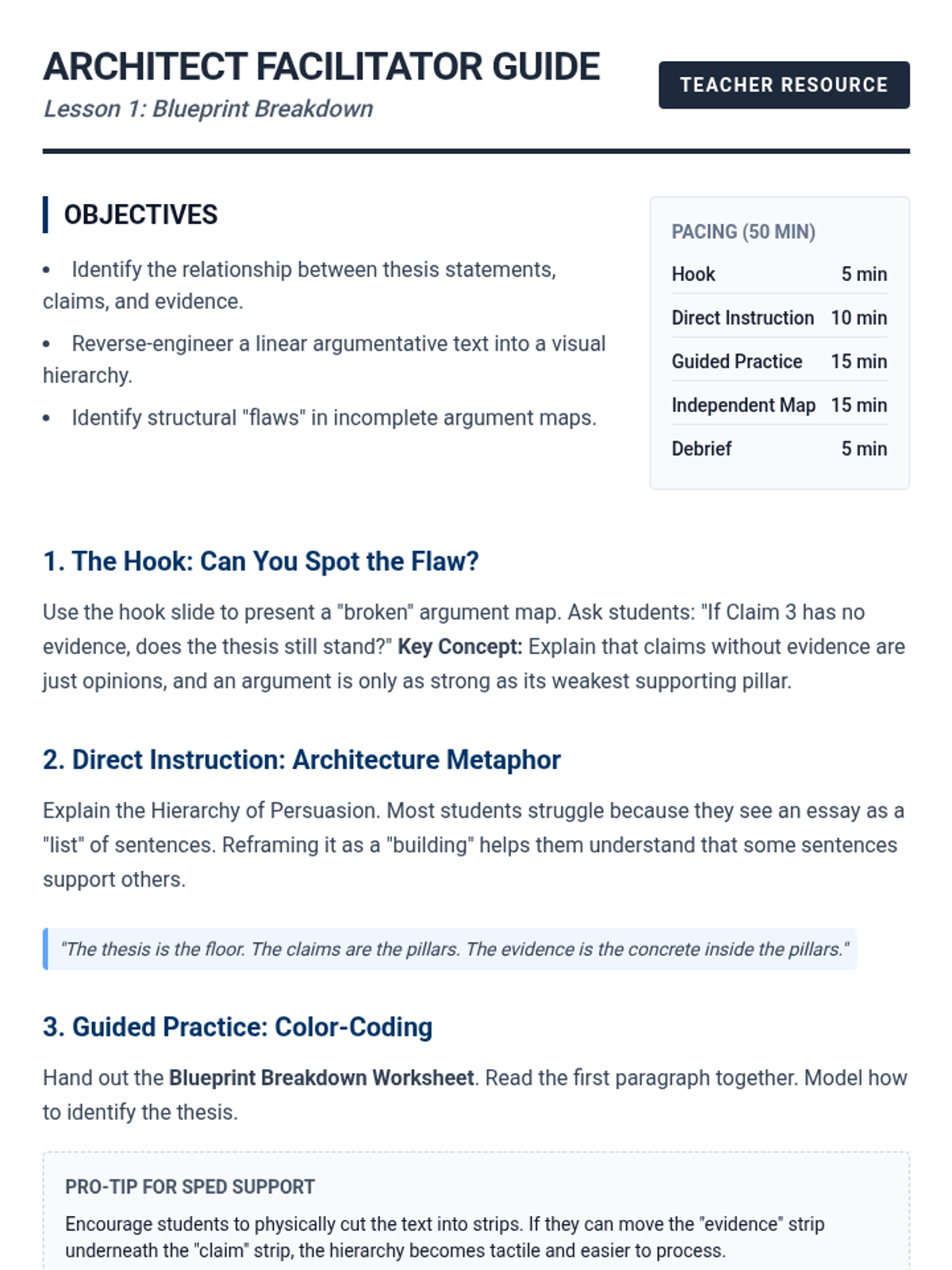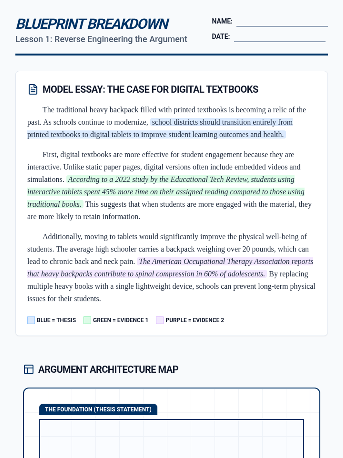 Students analyze a model argumentative essay by reverse-engineering it into a graphic organizer, identifying how linear text maps to visual hierarchies.