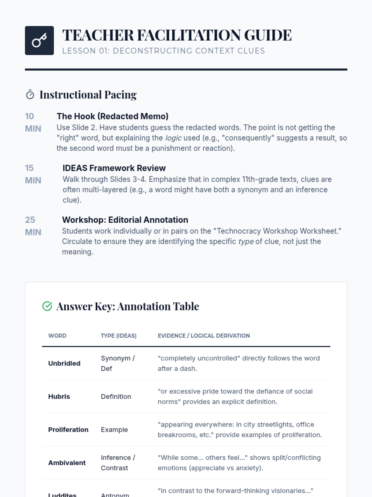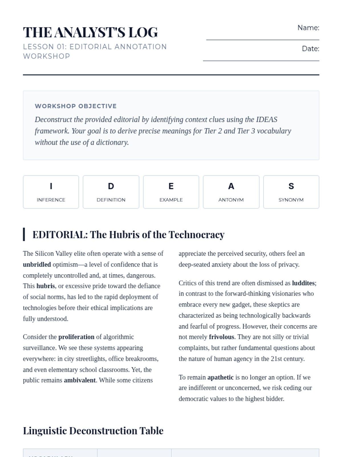 Students review and expand their understanding of the IDEAS acronym (Inference, Definition, Example, Antonym, Synonym) applied to high-level texts like editorials.