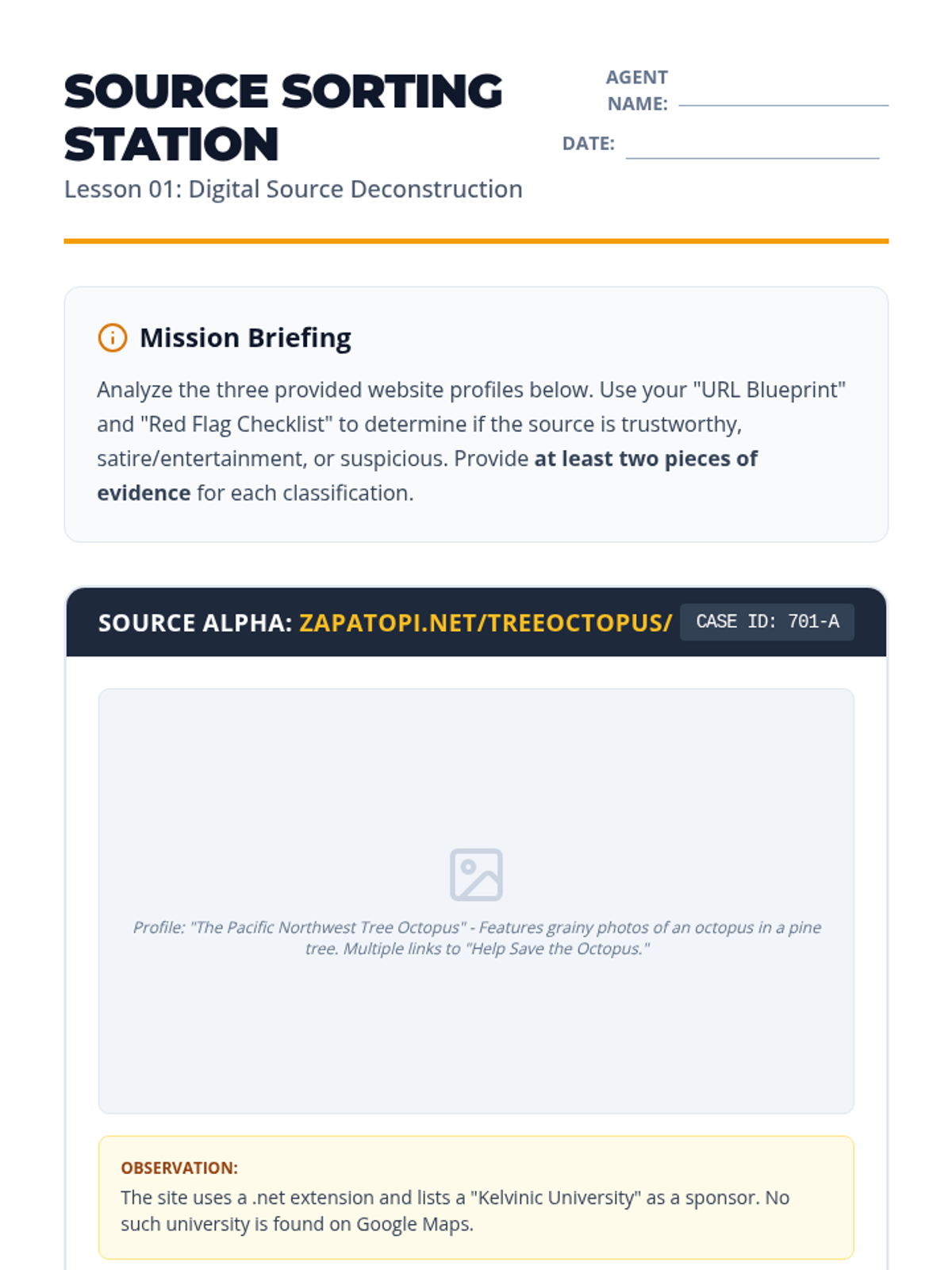 Students explore surface-level indicators of trustworthiness by comparing credible news sites, satire, and biased blogs, focusing on domain extensions and site design vs. content.