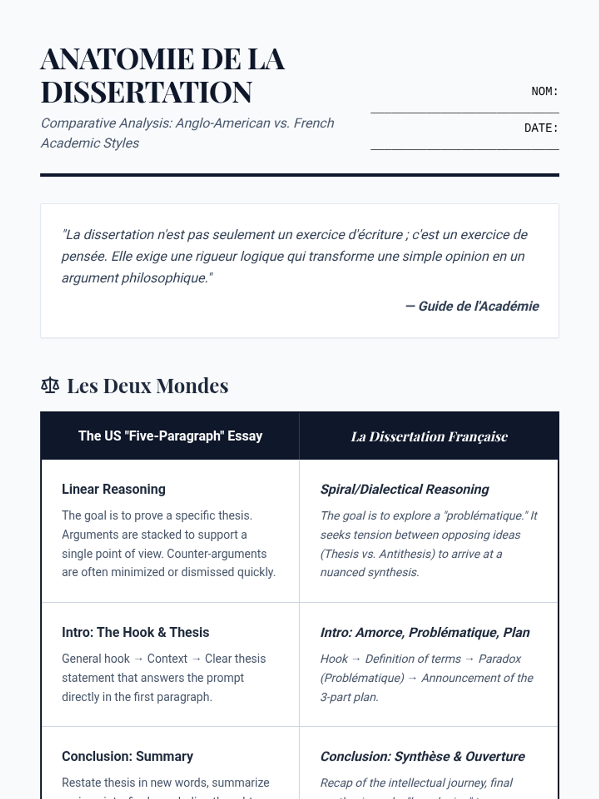 Students analyze model dissertations to identify structural requirements and contrast them with Anglo-American essay styles.