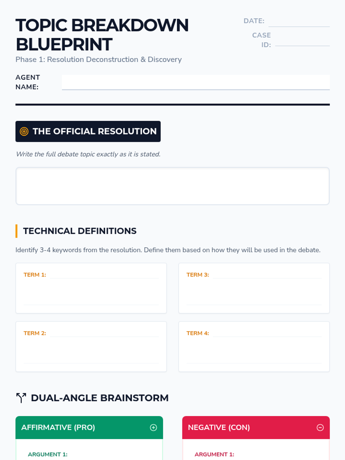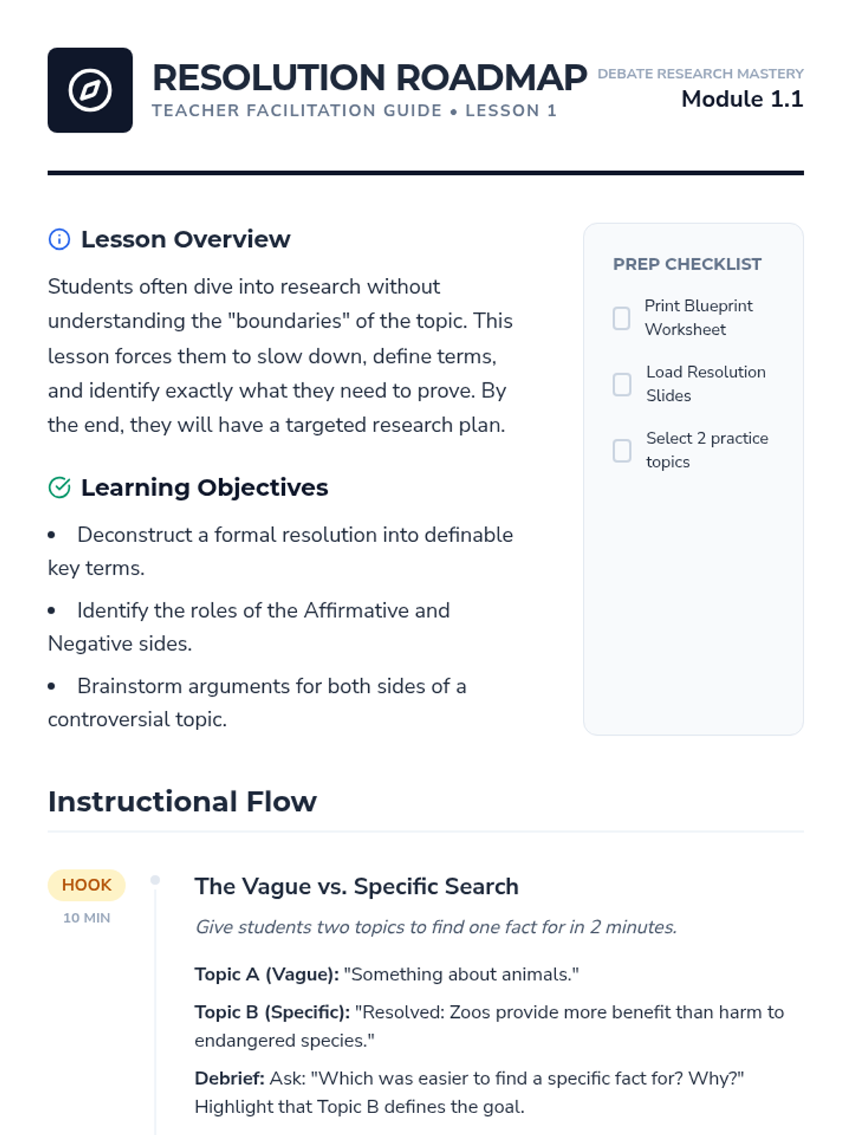 Students learn to break down a debate topic into key terms and definable scopes to target their research efforts effectively.
