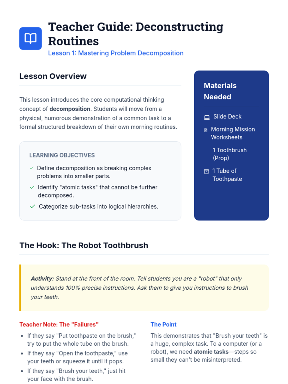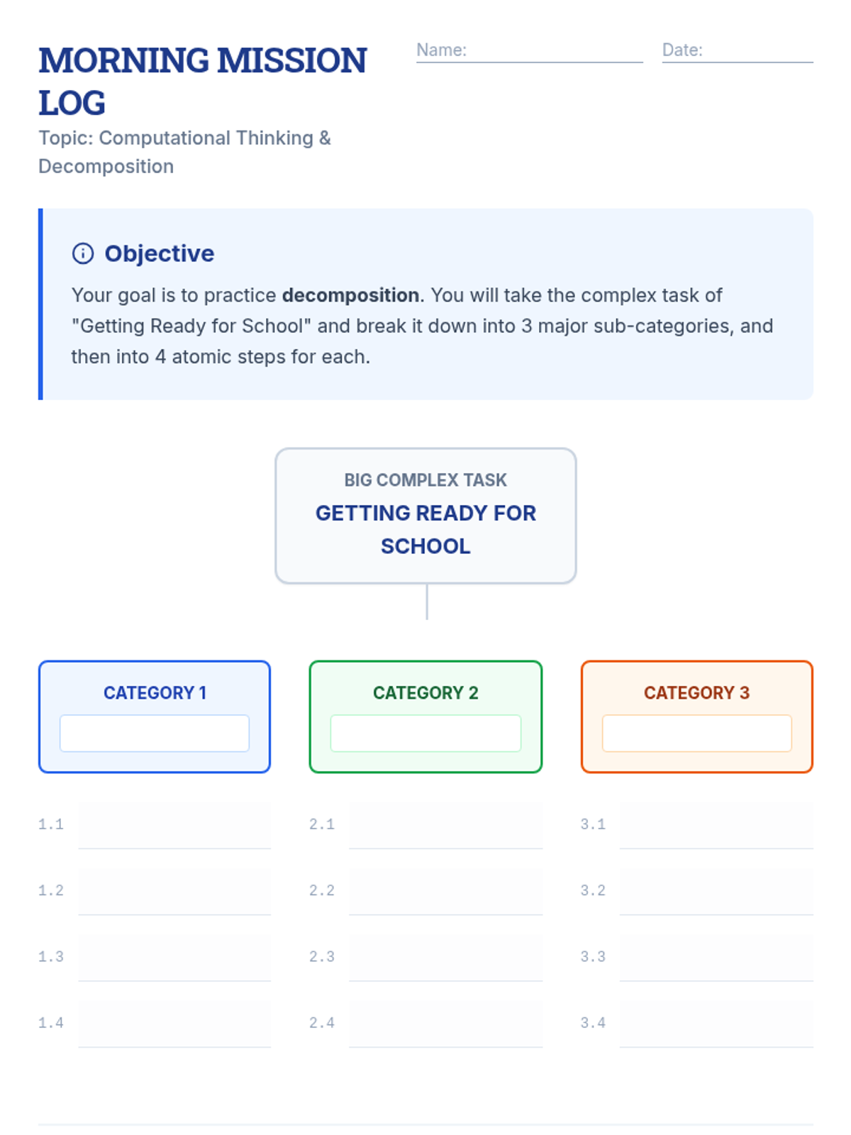 Students analyze familiar complex tasks, like 'Getting Ready for School,' and break them down into high-level categories and specific atomic actions. They visually map these hierarchies to understand the structure of tasks.