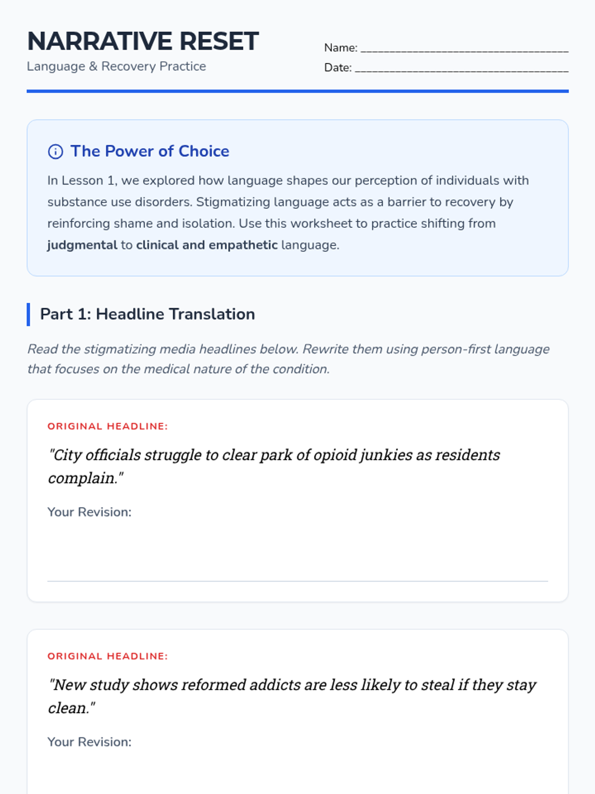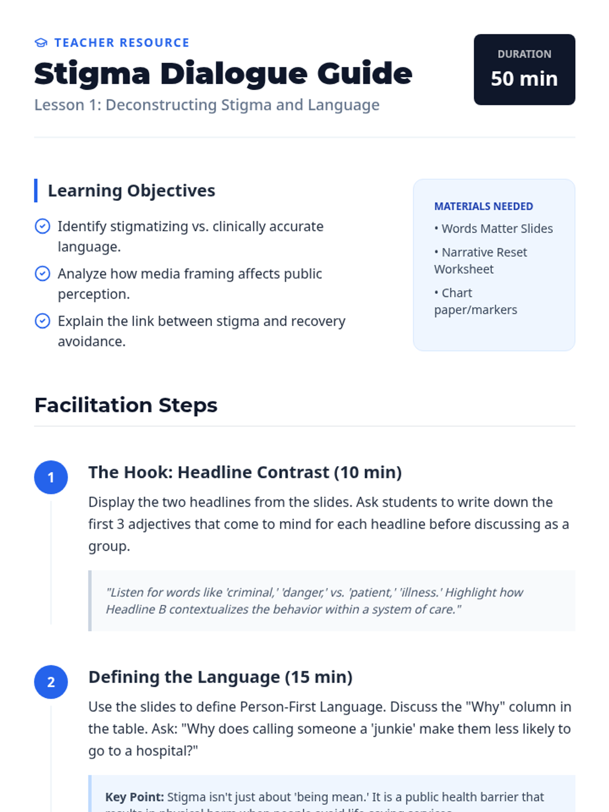 Students analyze media headlines and common phrases to identify stigmatizing language and discuss how it creates barriers to seeking help. They practice rewriting narratives using person-first, clinically accurate language.