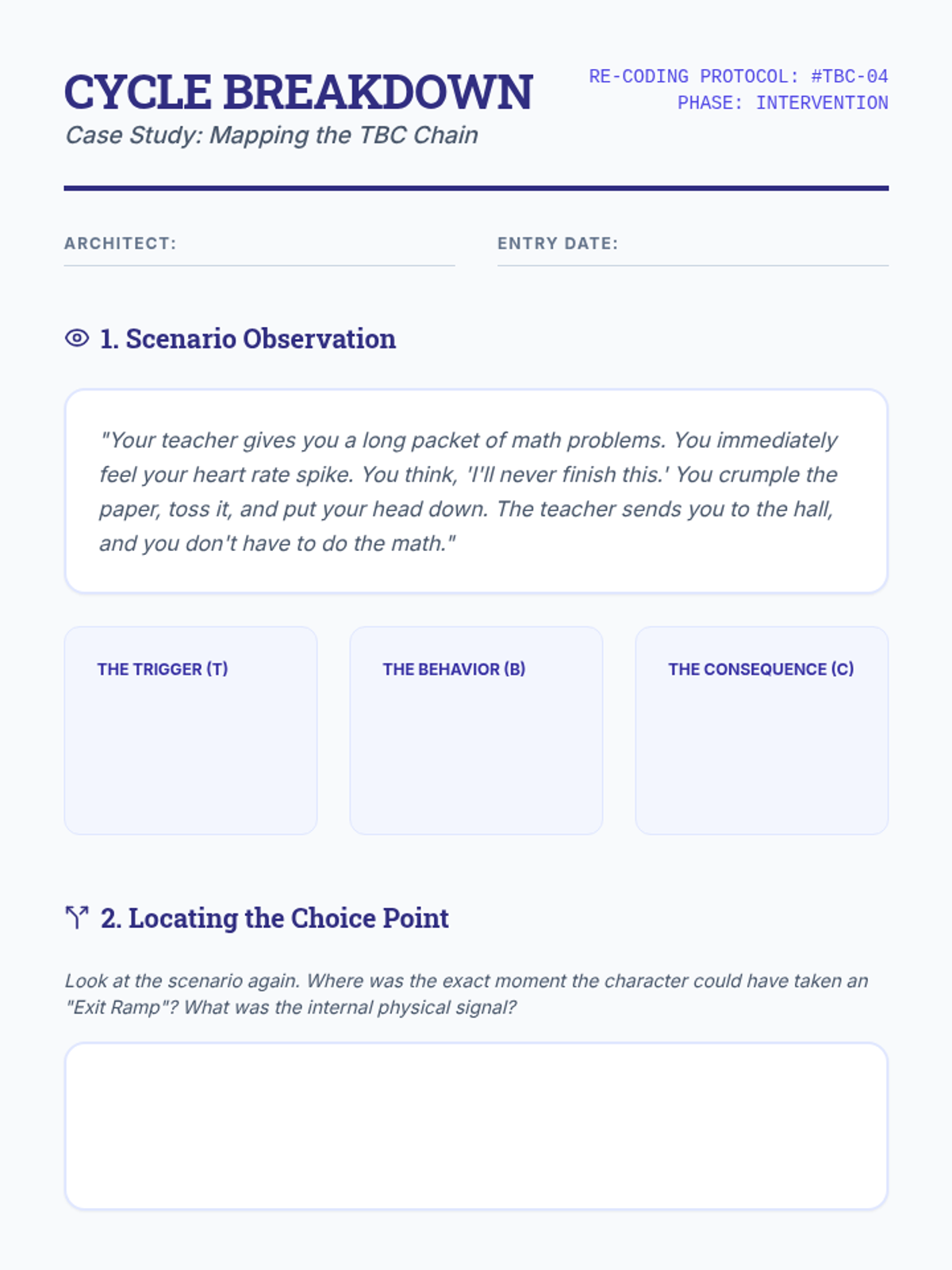 Students analyze the 'Trigger-Behavior-Consequence' cycle to identify intervention points. They use case studies to determine how a different choice at the 'moment of truth' could have changed the outcome.