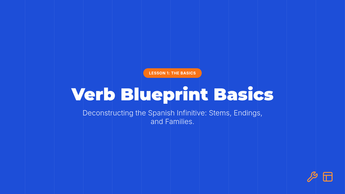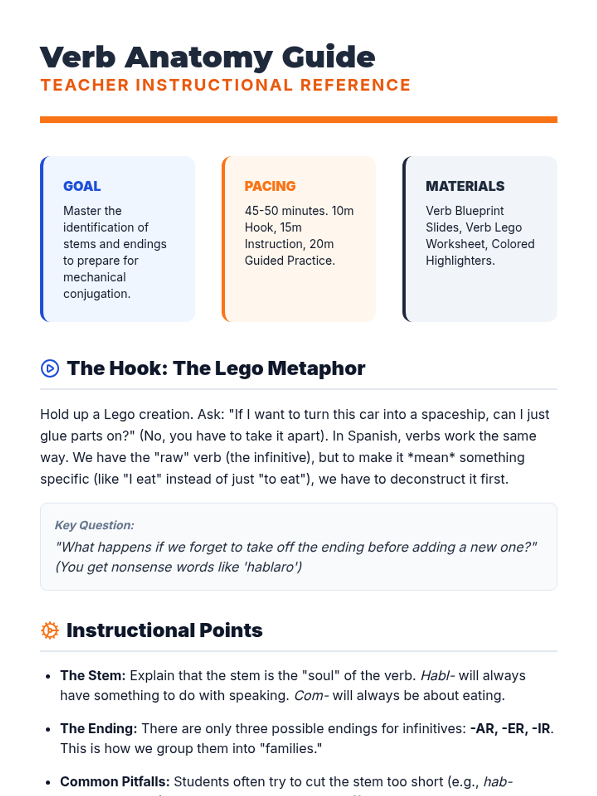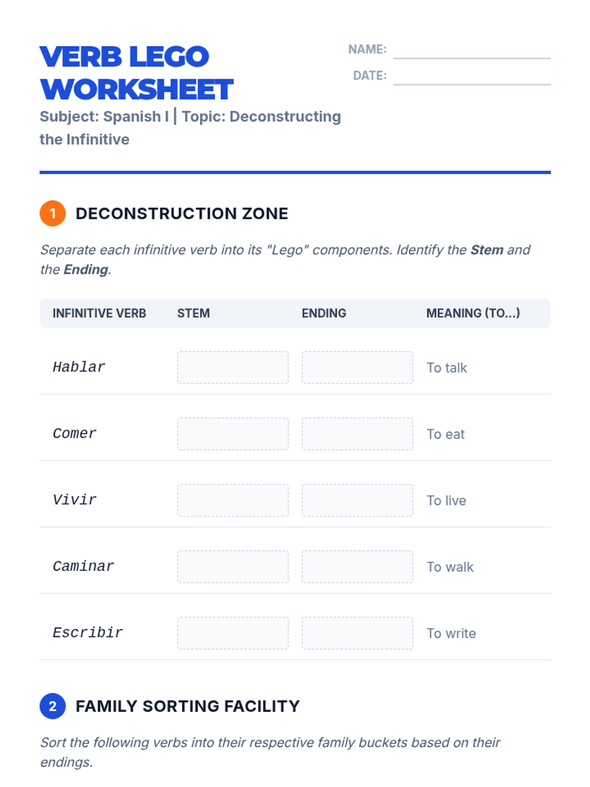 Students learn to identify the stem and the ending of infinitive verbs, categorizing them into the three main Spanish verb families. The lesson uses a 'Lego' analogy to treat verbs as modular components.
