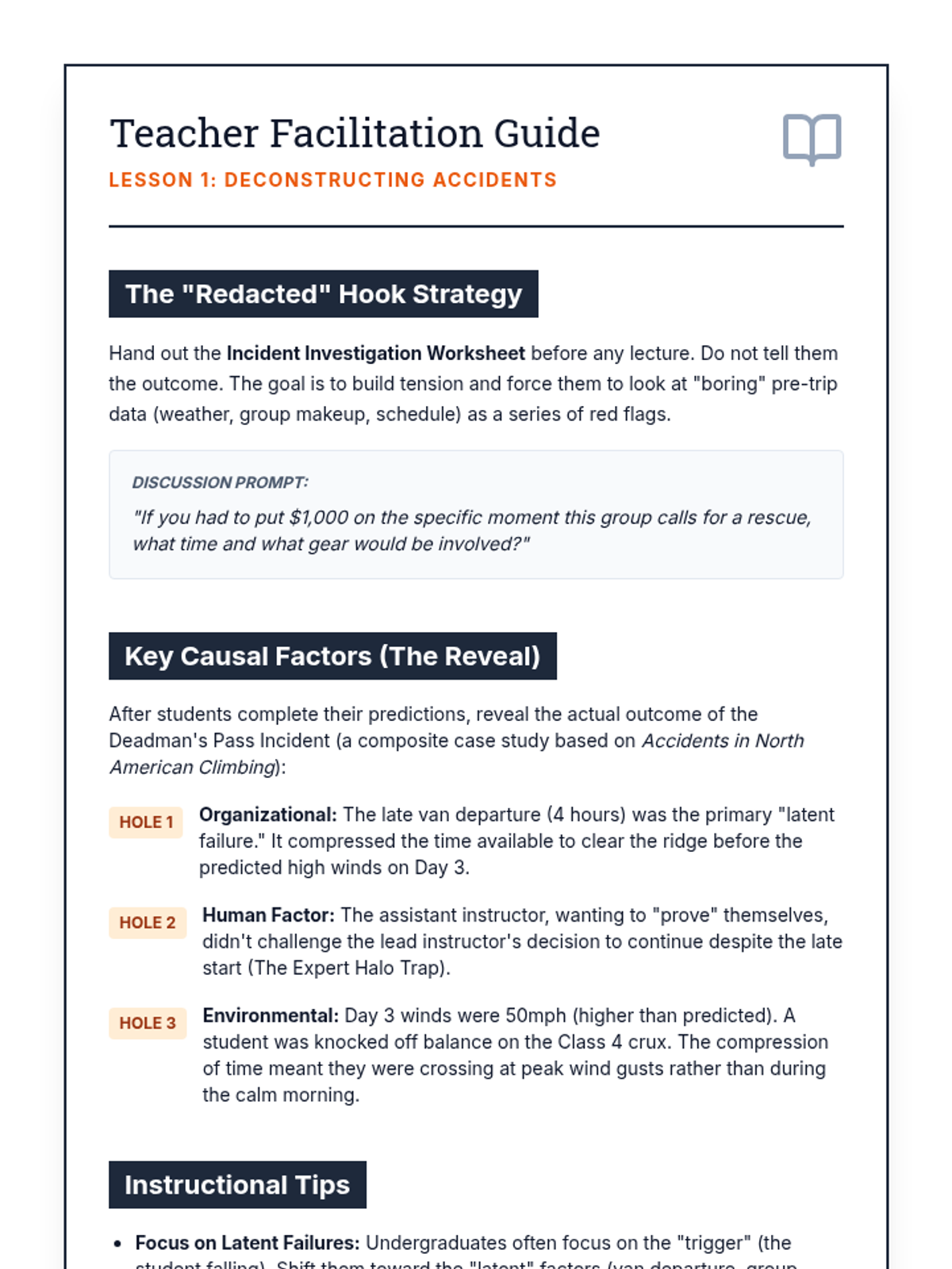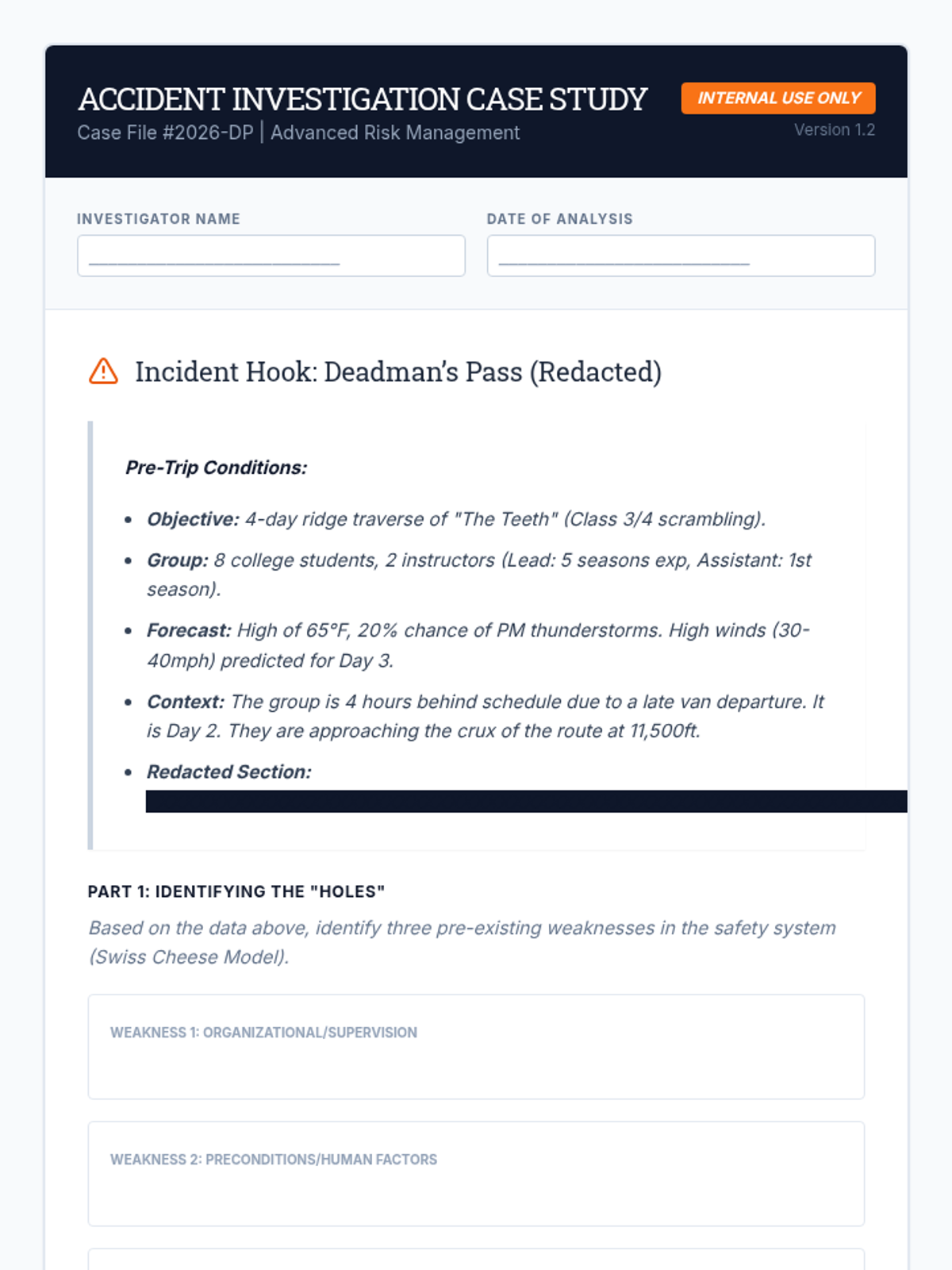 Students analyze case studies and apply the Swiss Cheese Model to understand how environmental hazards and human factors converge to cause accidents.