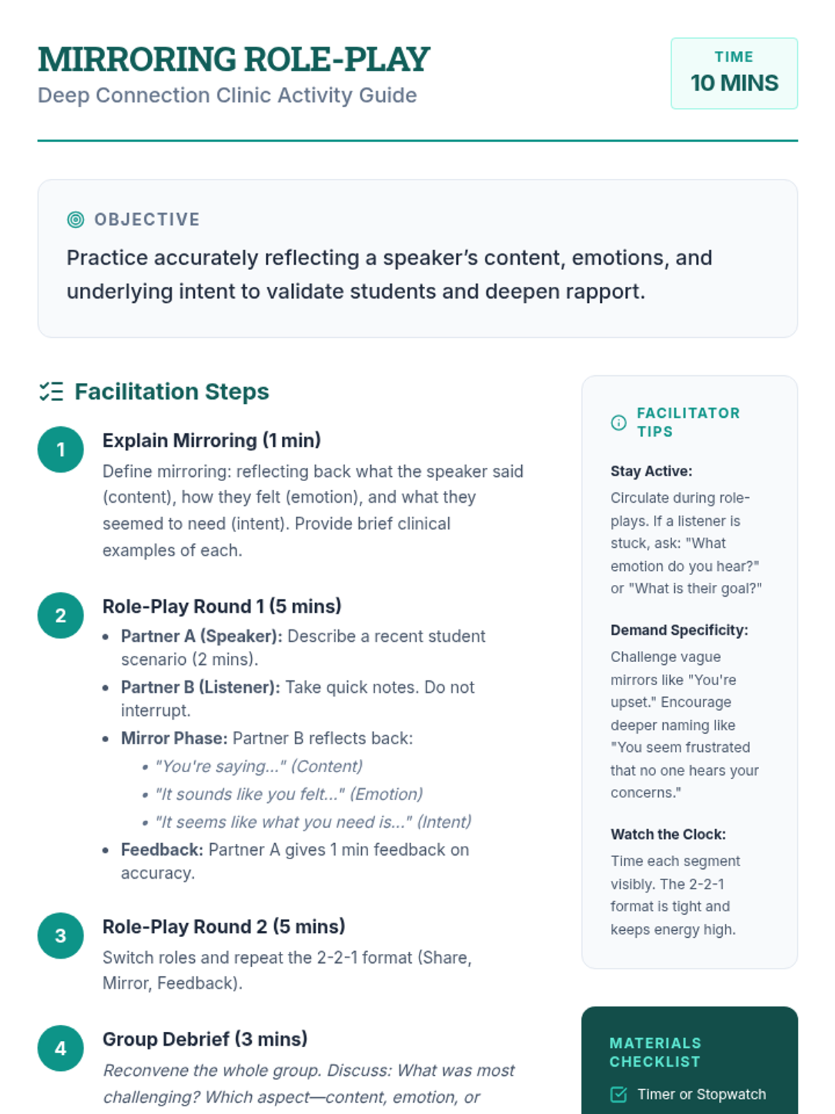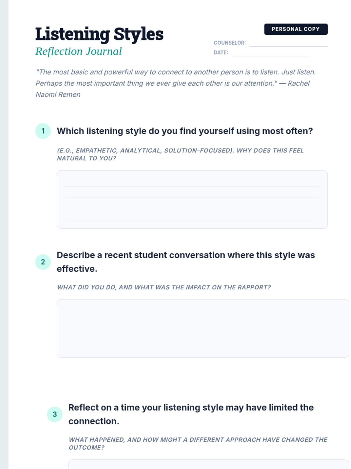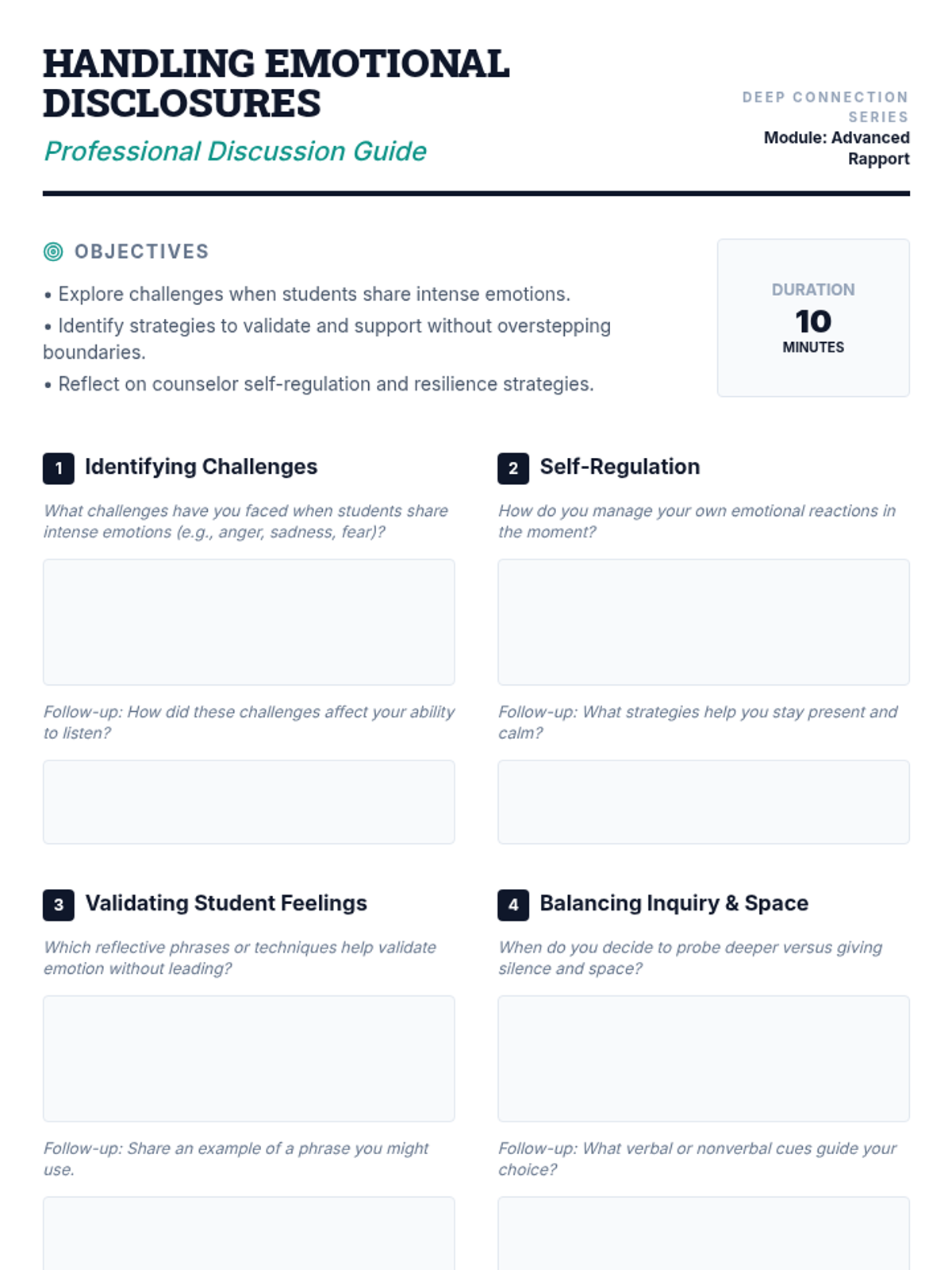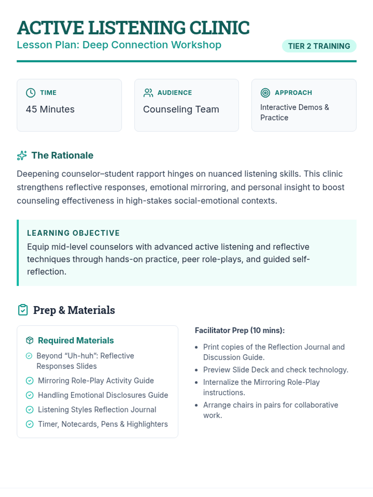 A 45-minute workshop for mid-level counselors to master advanced active listening and reflective techniques, fostering deeper student rapport through hands-on practice.