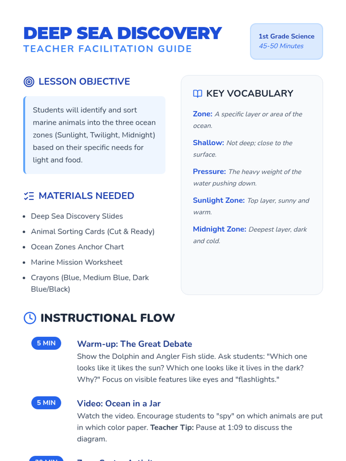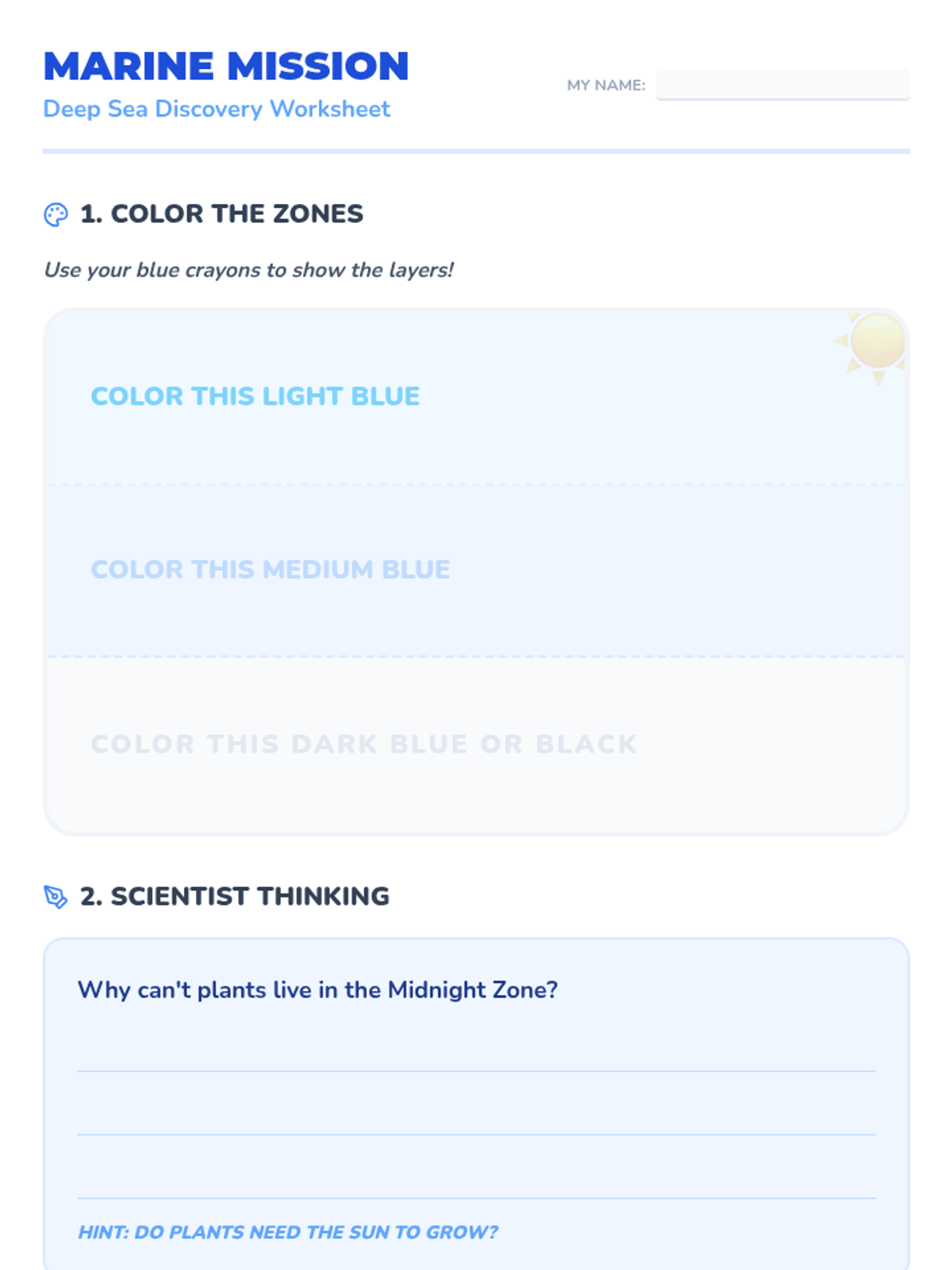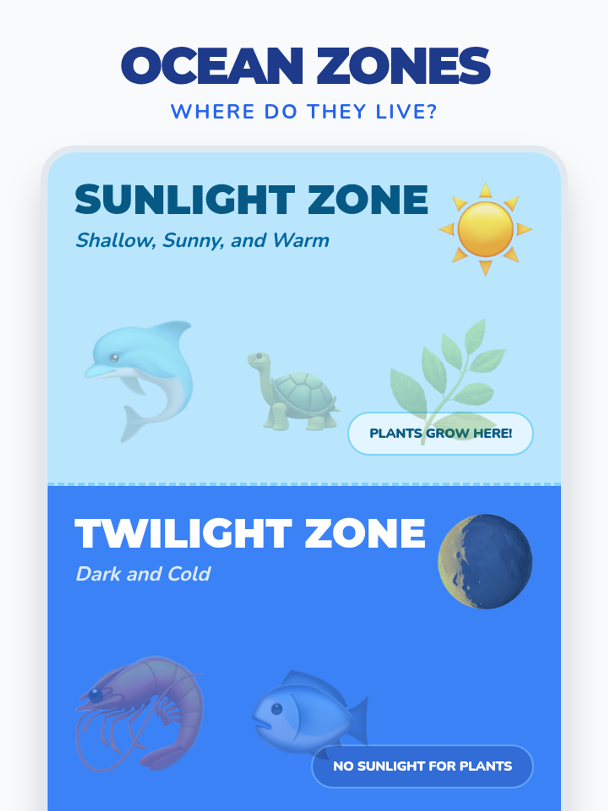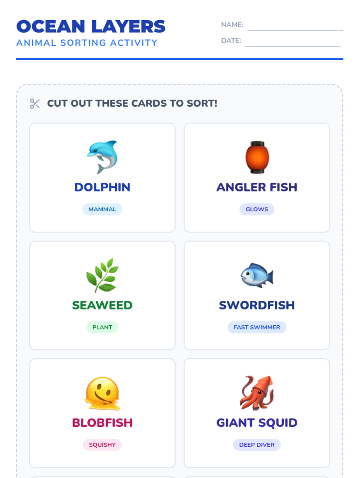 Students will explore the three layers of the ocean—Sunlight, Twilight, and Midnight—to understand how light, pressure, and food availability determine where different marine animals live. The lesson concludes with a hands-on sorting activity and a creative exit ticket.