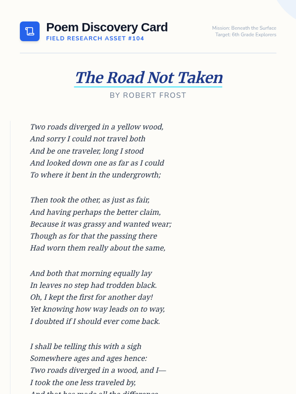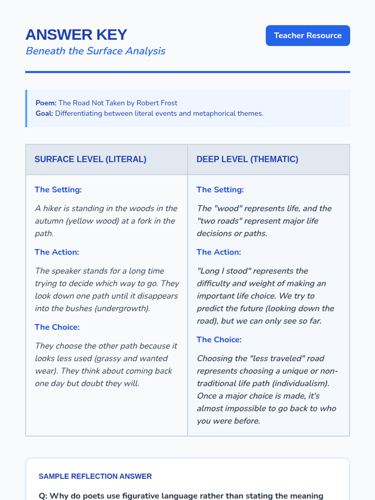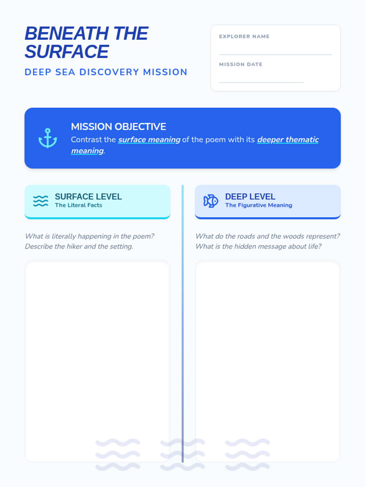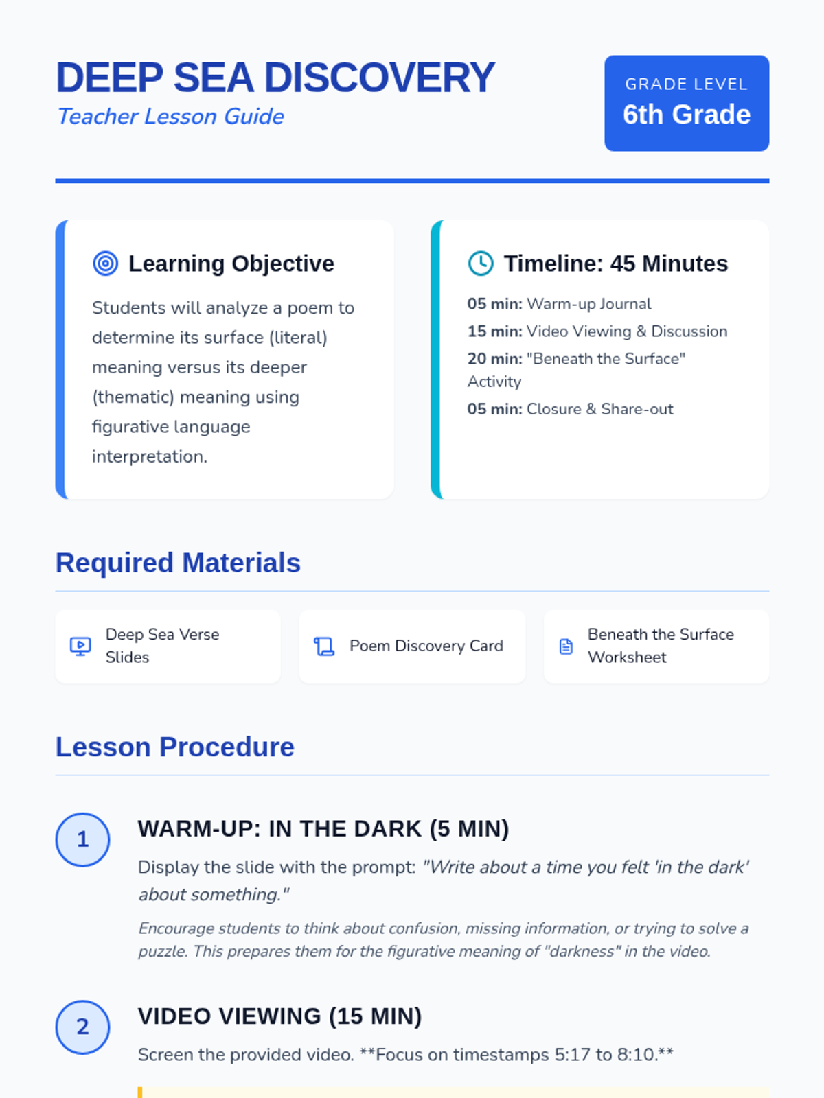 Students will explore the difference between literal surface meaning and figurative deeper meaning in poetry using an ocean exploration theme. The lesson includes a video-based discussion, a journal reflection, and a T-Chart activity using a classic poem.