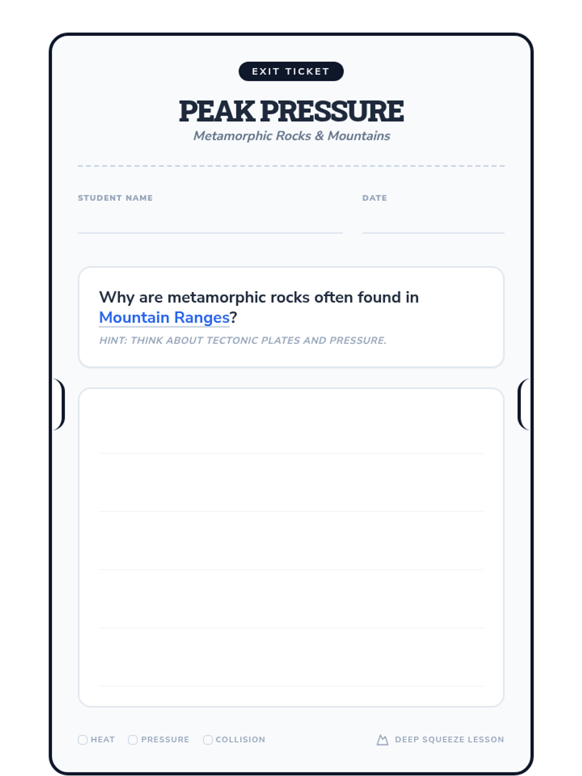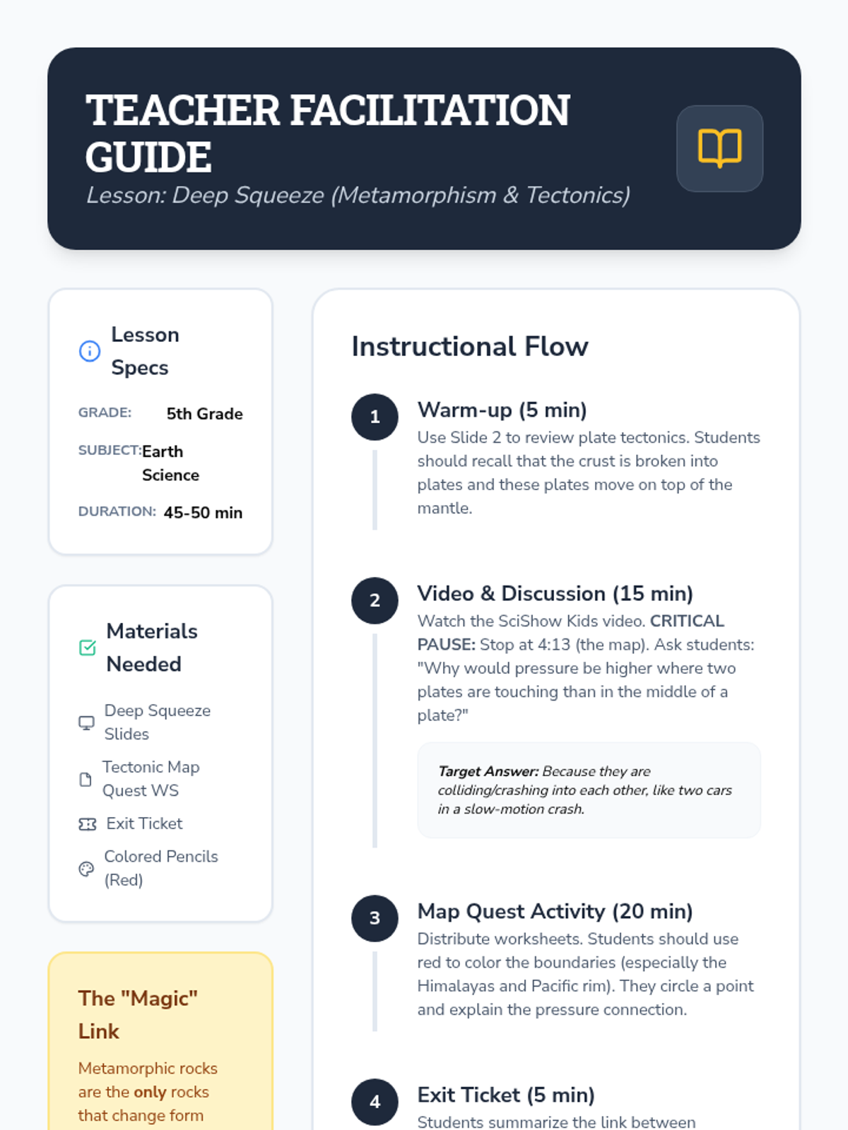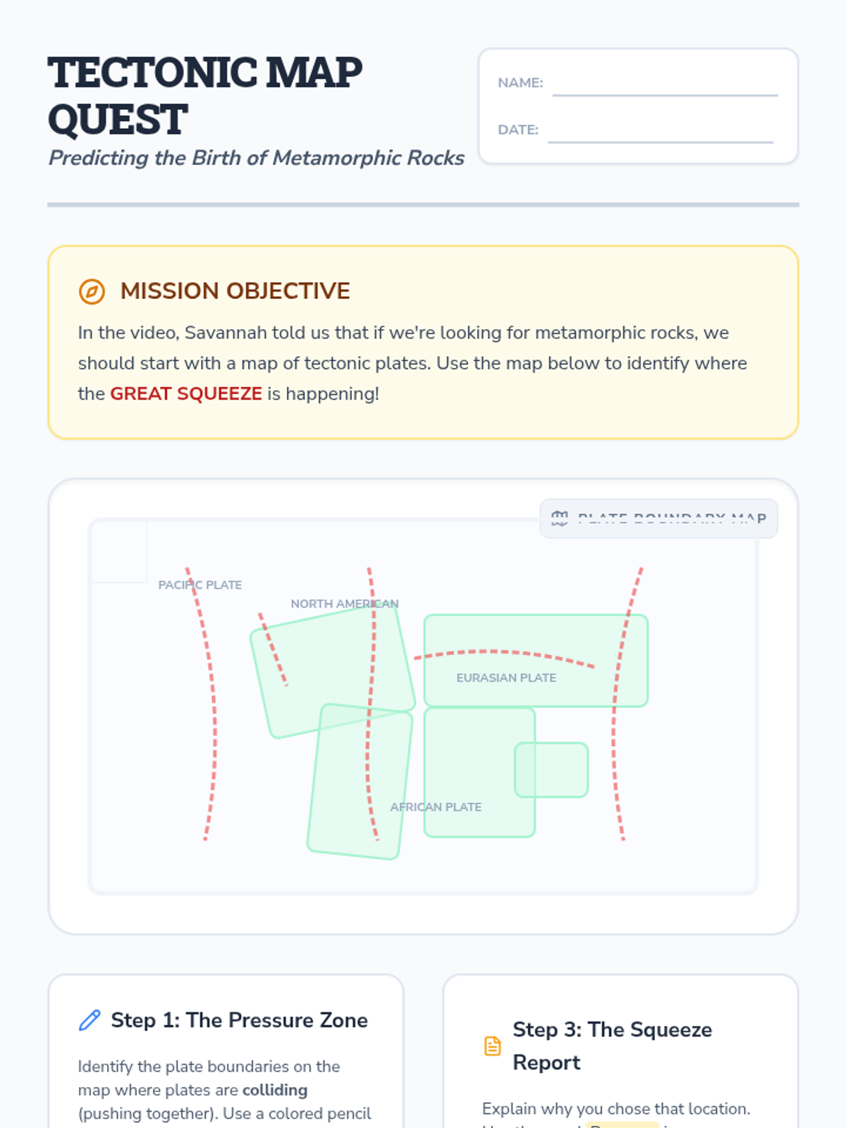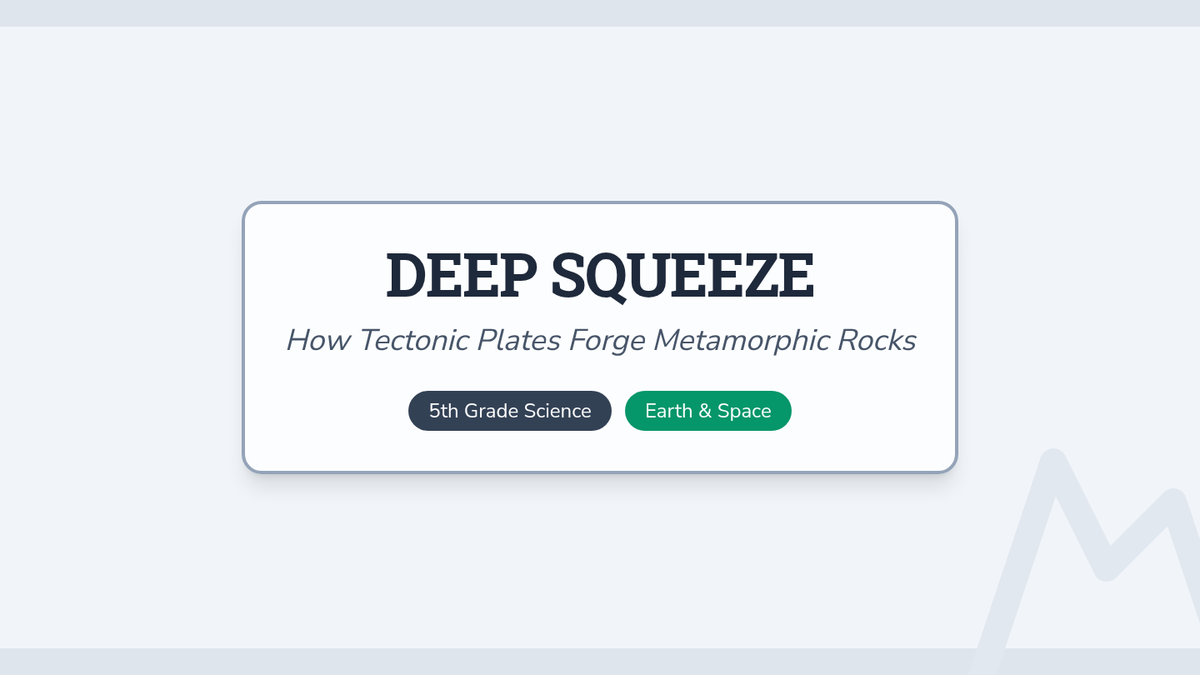 Students explore the intense geological processes at tectonic plate boundaries to understand how heat and pressure transform existing rocks into metamorphic rocks. The lesson uses a butterfly metamorphosis analogy and real-world mapping to connect plate tectonics with rock formation.