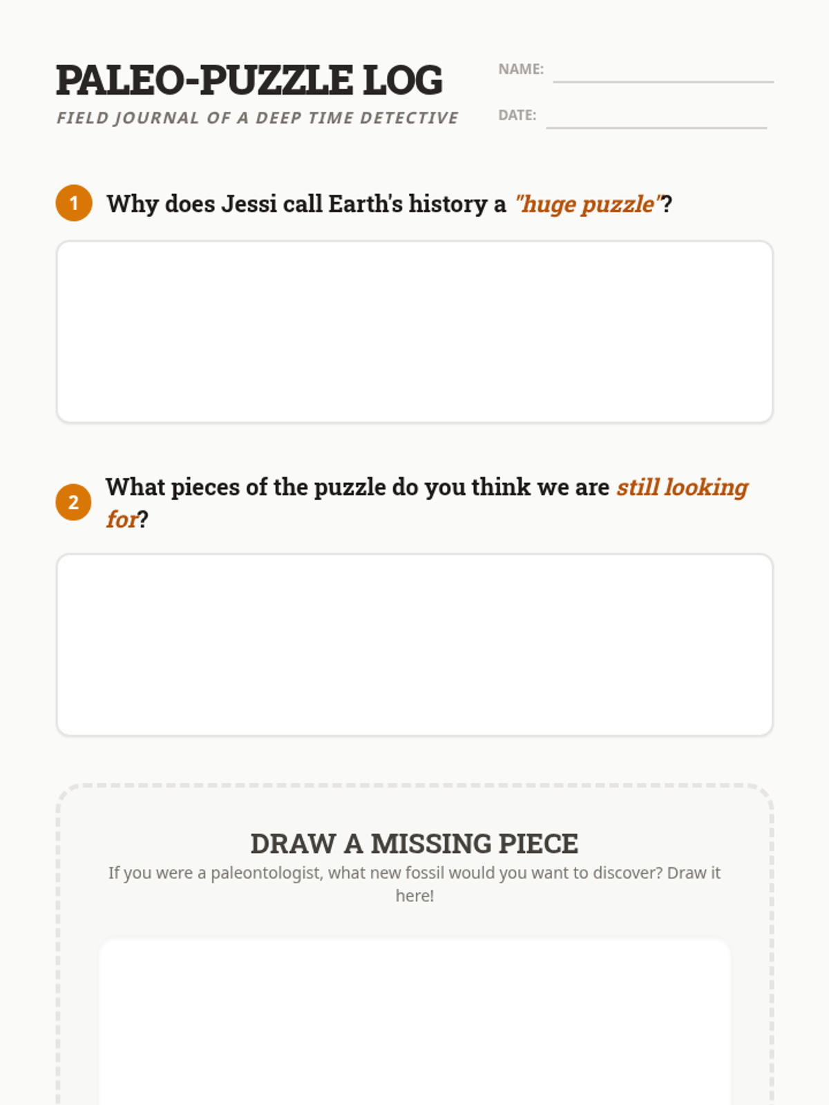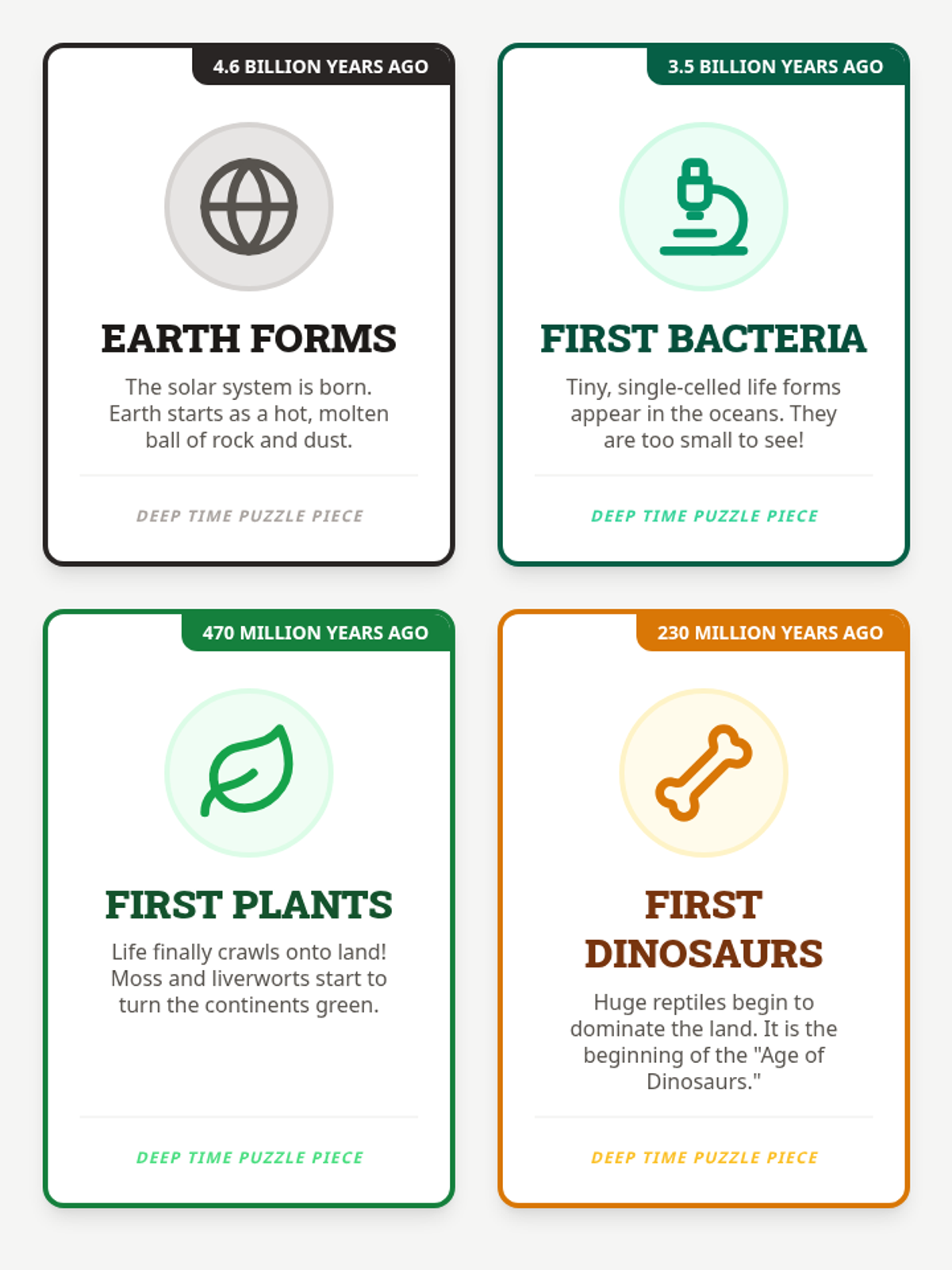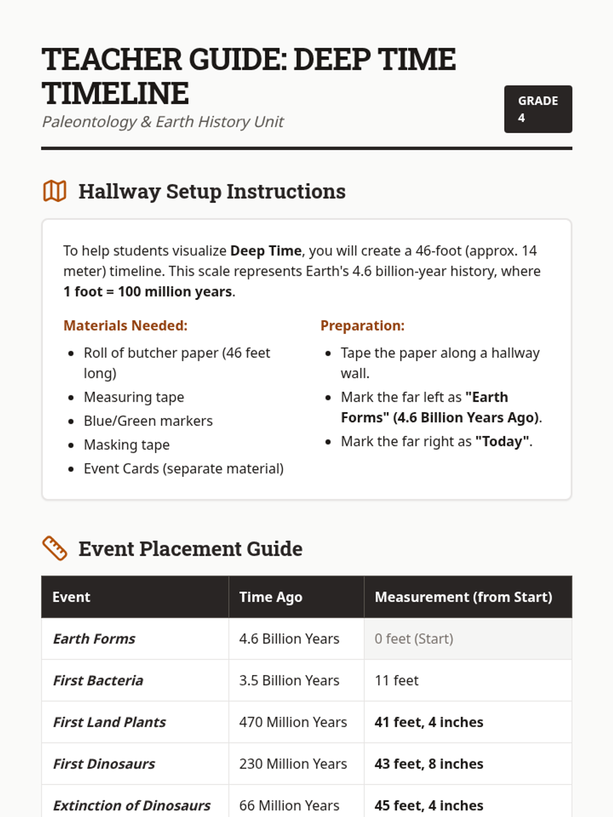 Students explore the concept of Deep Time through a 'puzzle' analogy and a large-scale physical timeline activity, identifying major milestones in Earth's 4.6 billion-year history.
