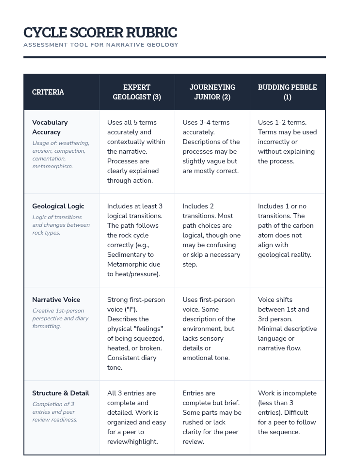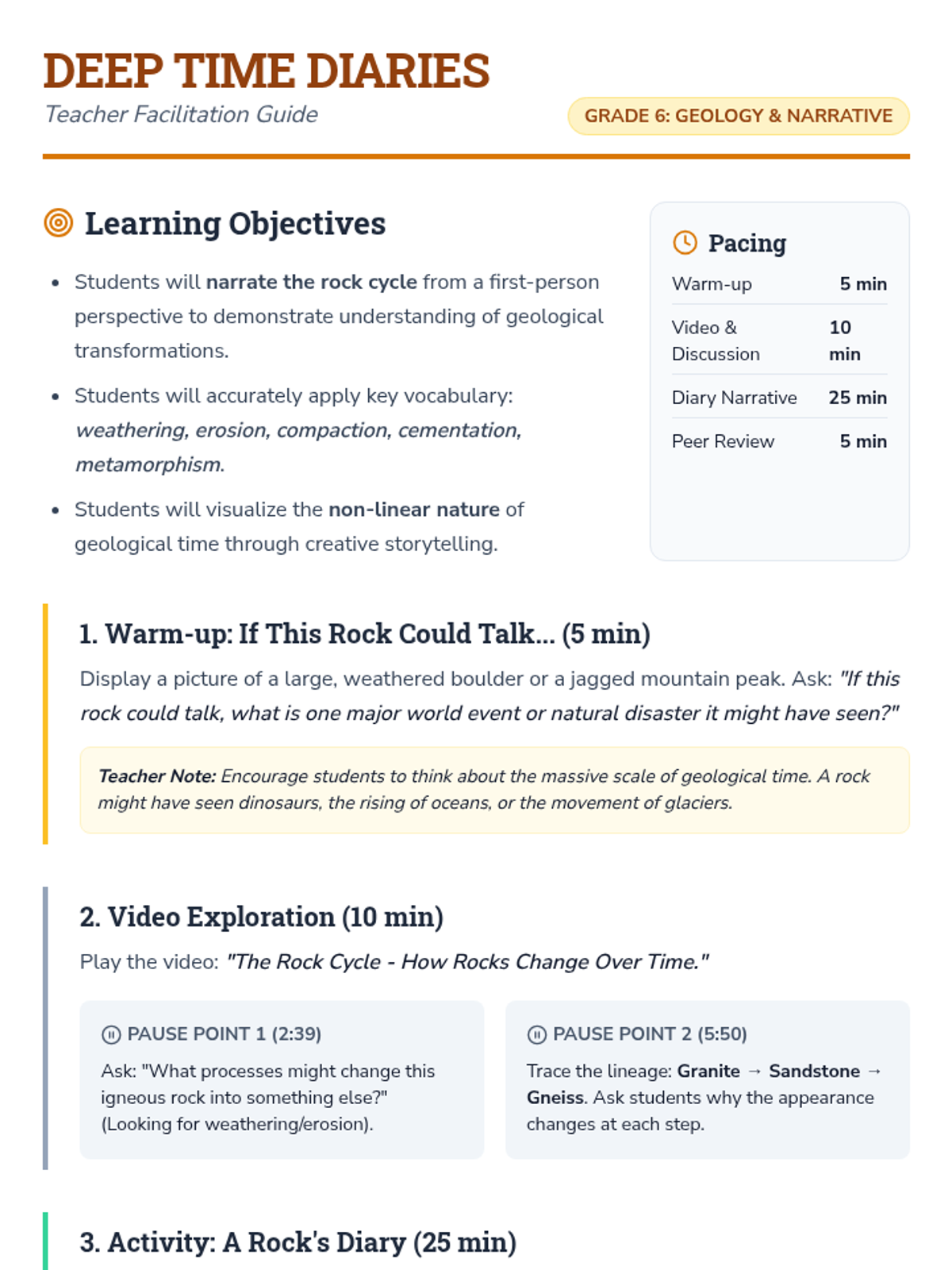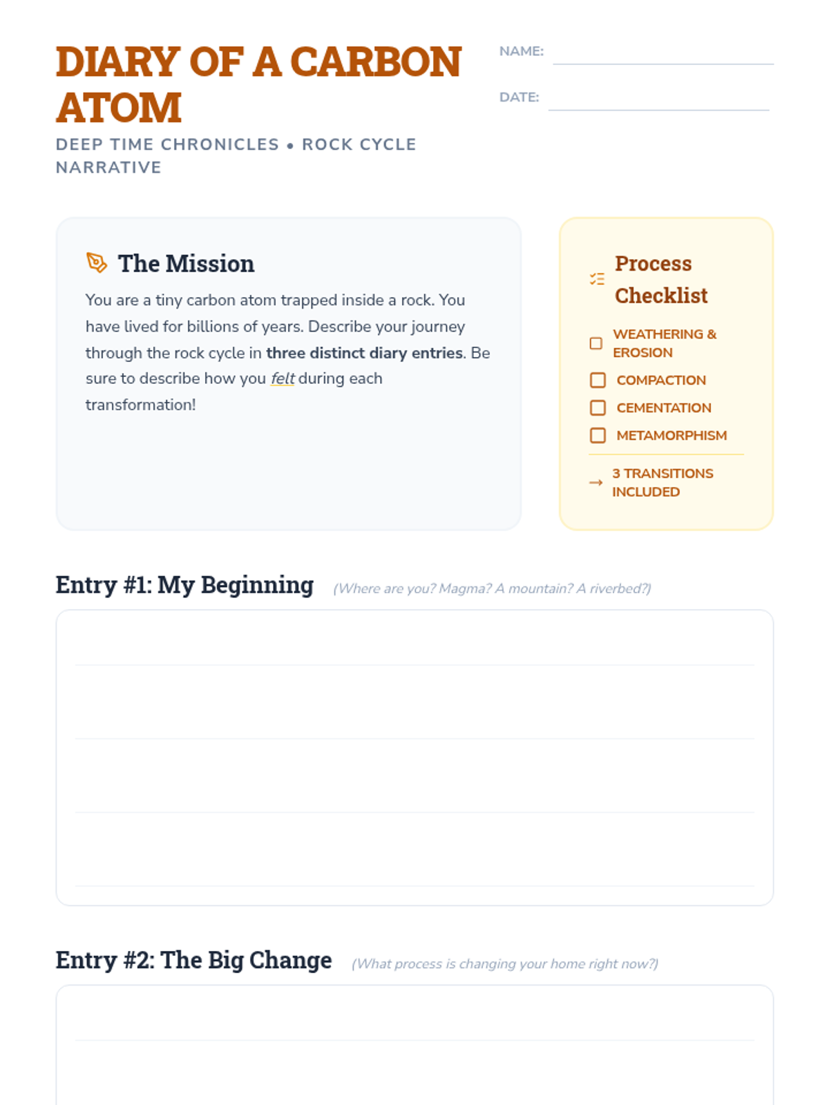 A 6th-grade science and ELA lesson where students write a first-person narrative from the perspective of a carbon atom traveling through the rock cycle, emphasizing geological transformation processes.