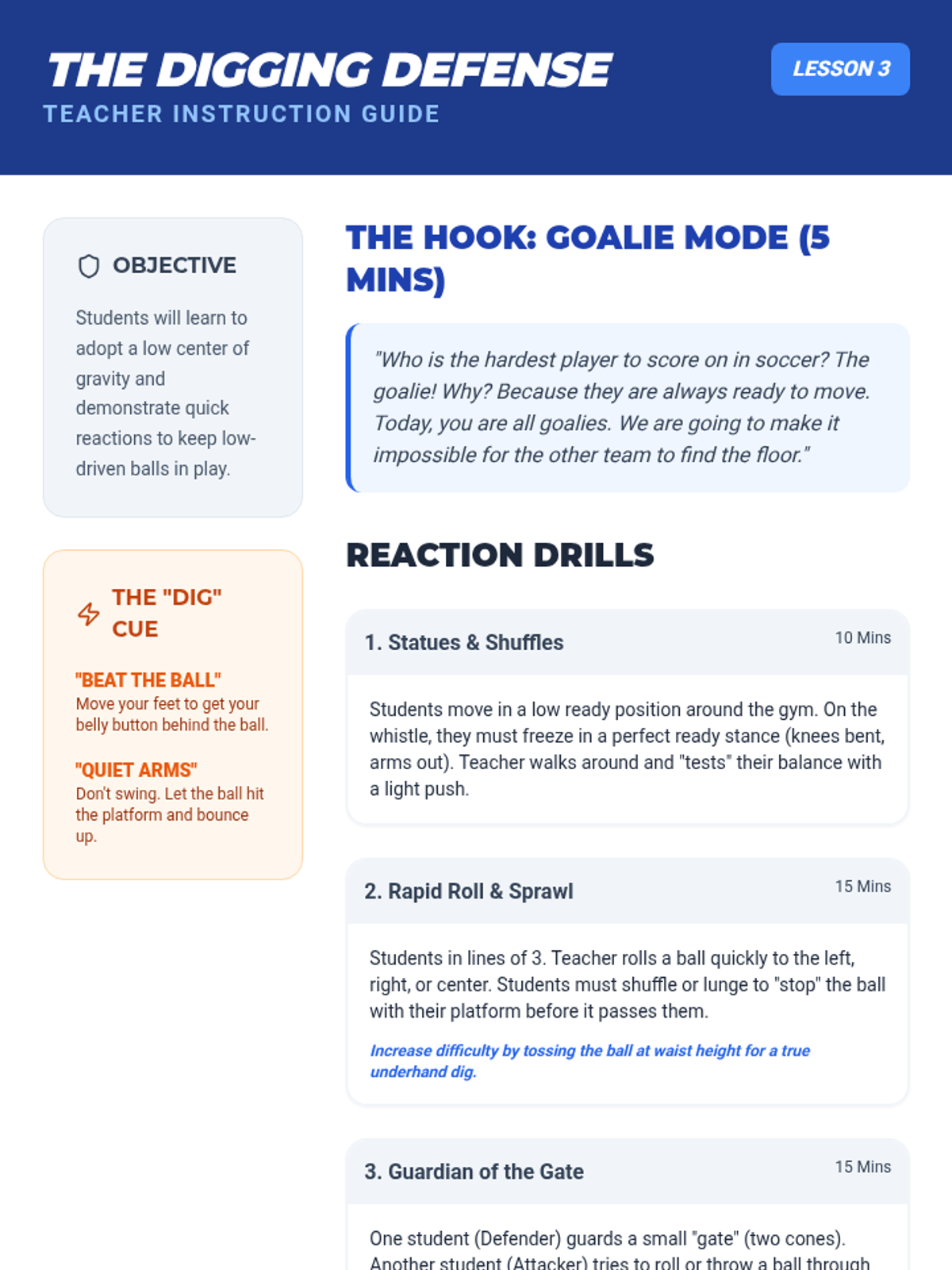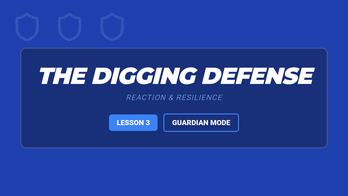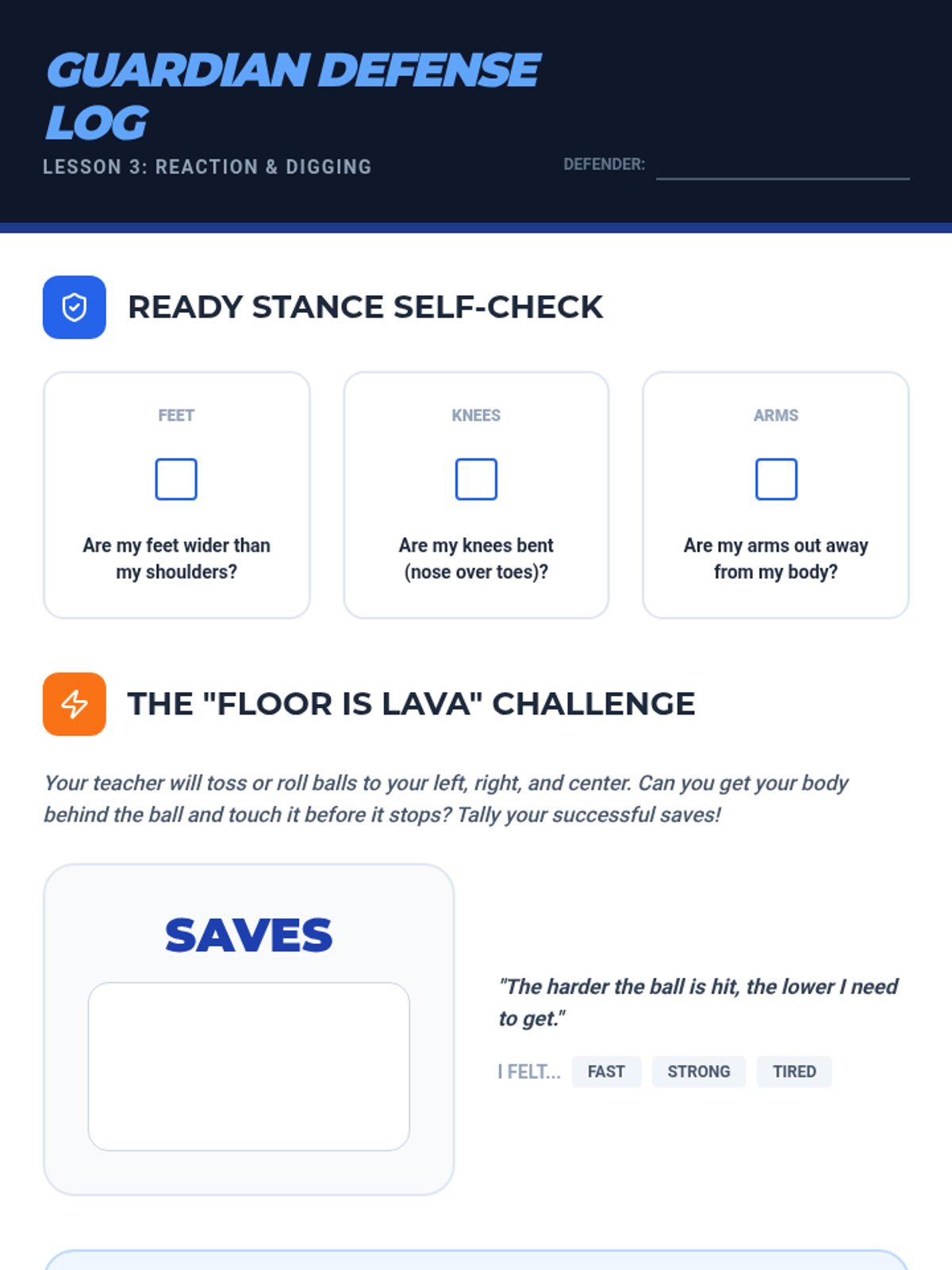 Introduces the low defensive 'ready position' and the fundamentals of digging to keep the ball from hitting the floor.