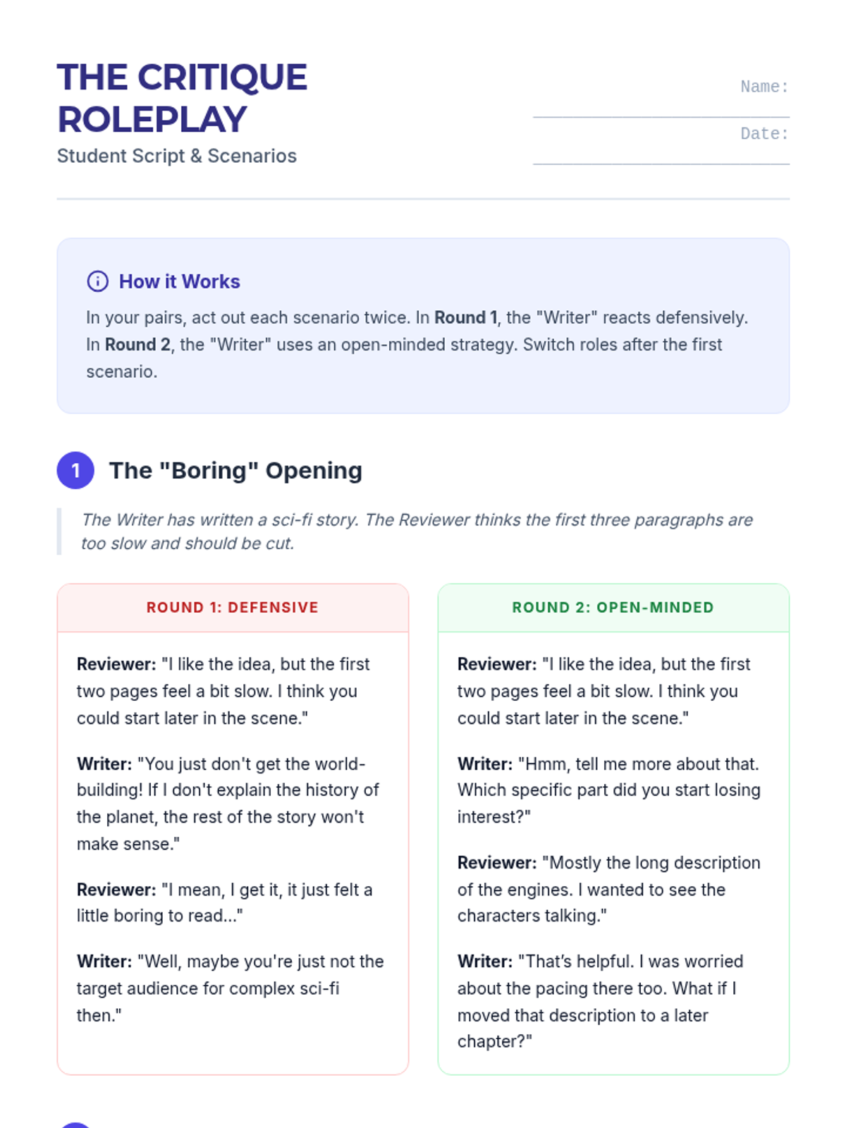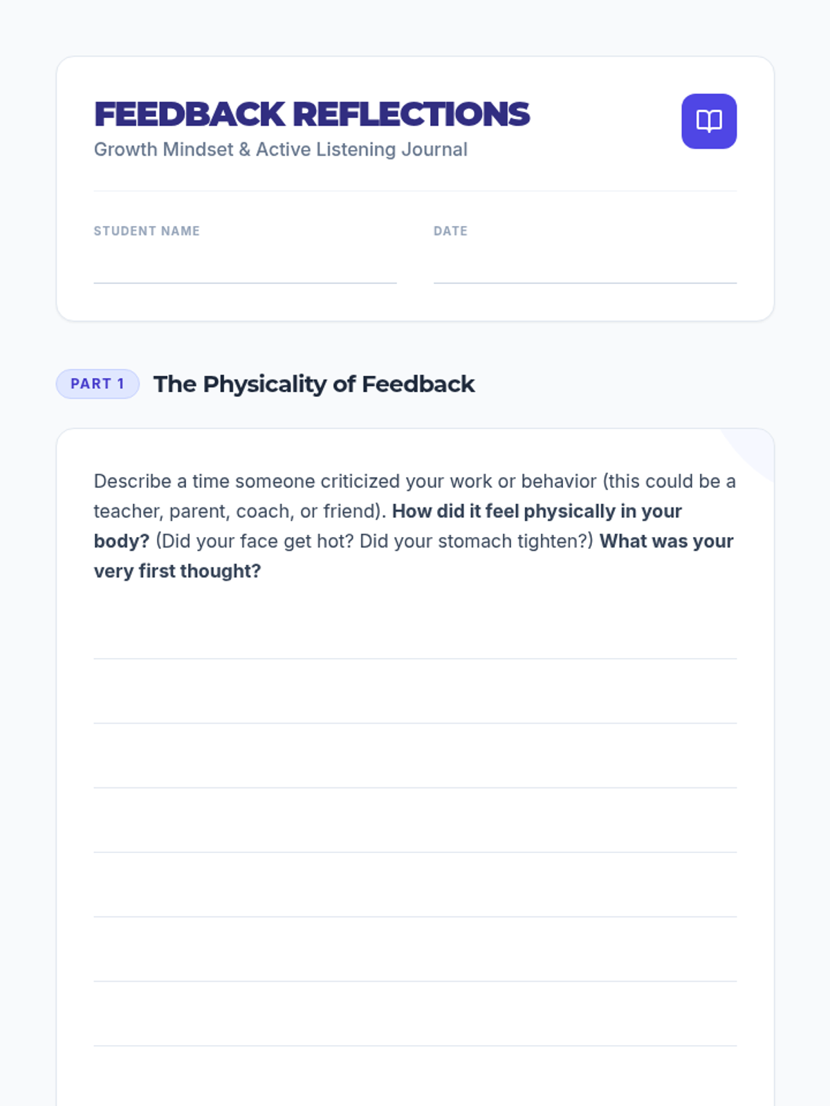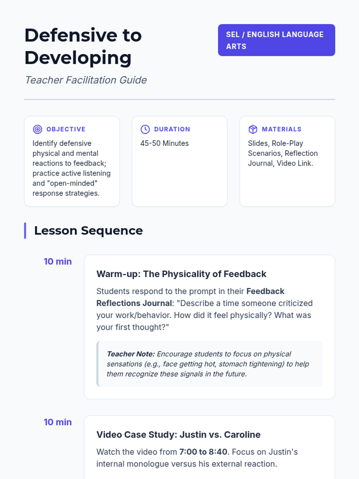 A social-emotional learning lesson focused on identifying defensive reactions to feedback and practicing active listening strategies using a video-based case study and role-play activities.