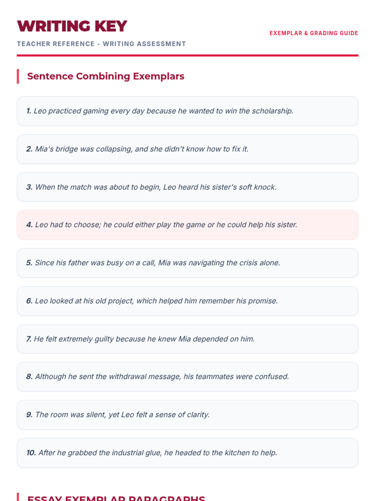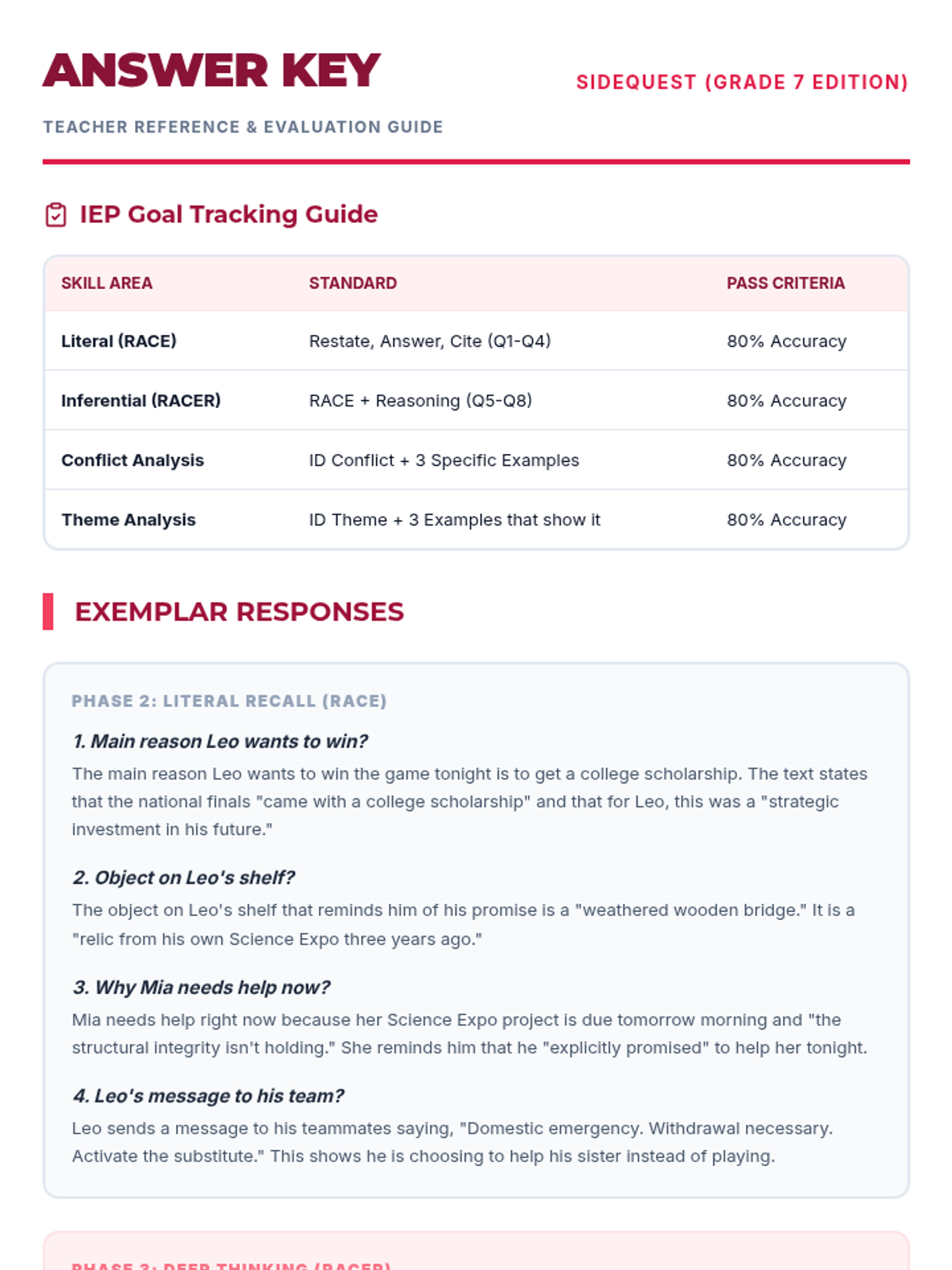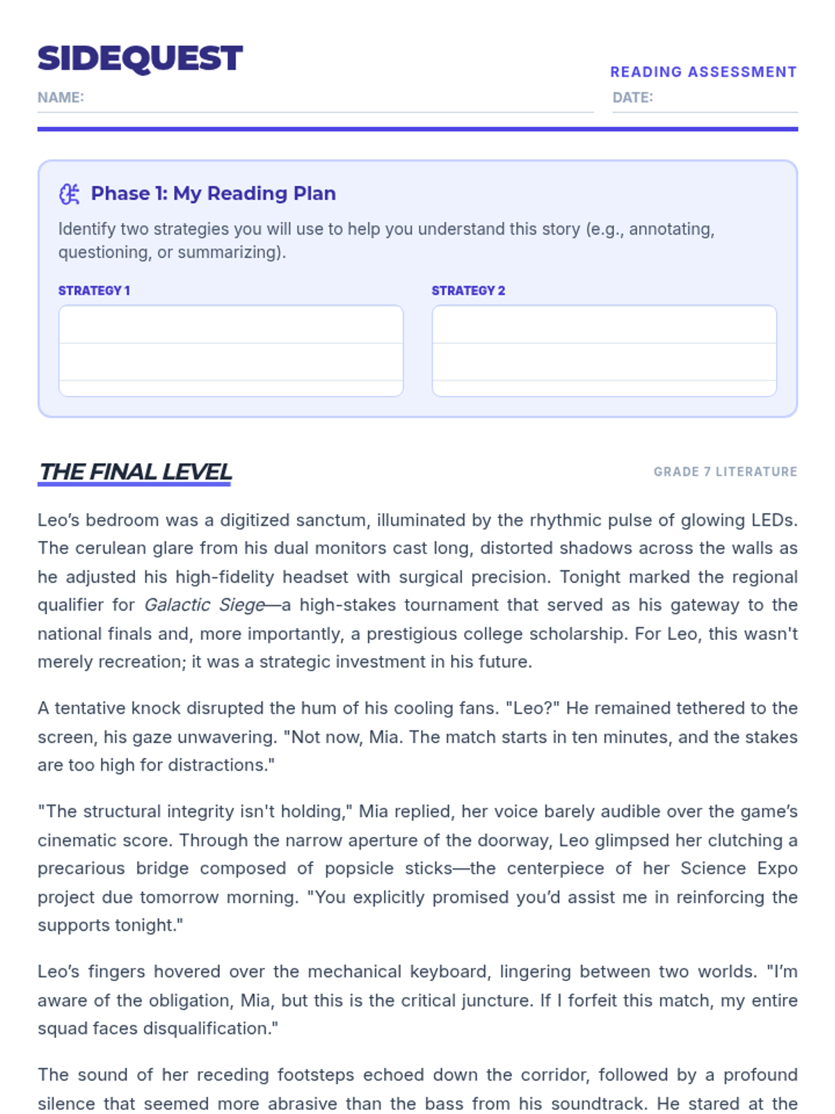 A comprehensive reading assessment based on a high-interest realistic fiction story, designed to measure literal, inferential, and evaluative comprehension through evidence-based responses.