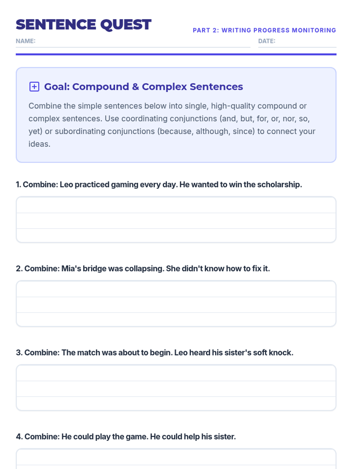 A lesson focused on sentence construction, teaching students to transform fragments and simple sentences into sophisticated compound and complex sentences using a construction-themed framework.