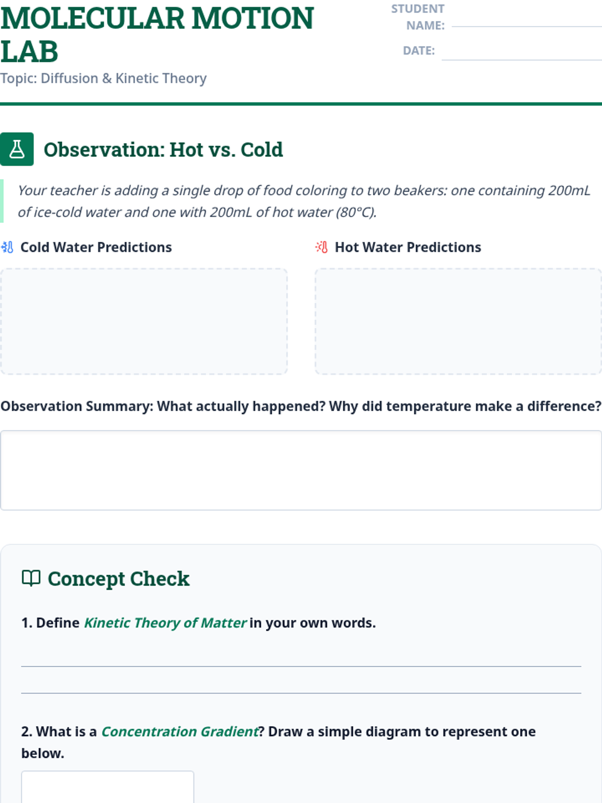 Students explore the kinetic theory of matter to understand concentration gradients and the factors affecting diffusion rates through a food coloring inquiry.