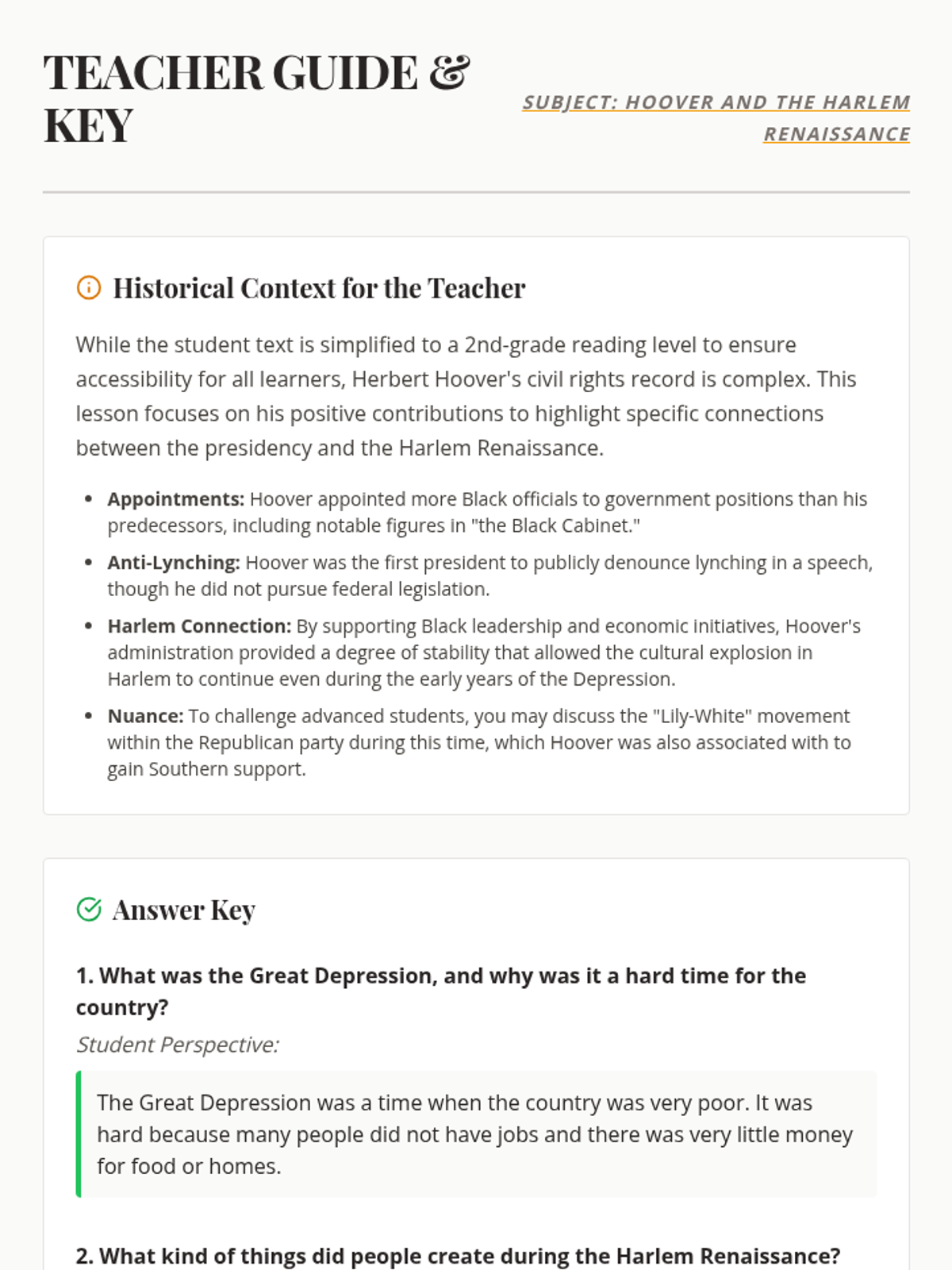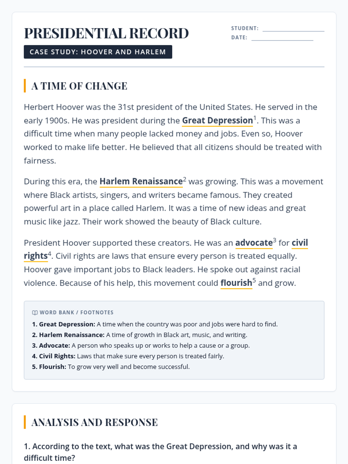 A lesson exploring the presidency of Herbert Hoover and his support for Civil Rights during the Harlem Renaissance, designed for middle school students needing accessible text.