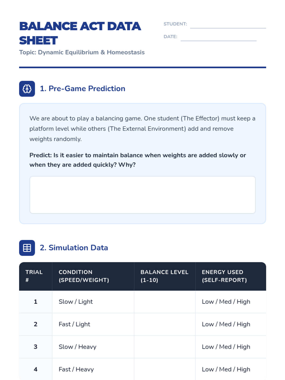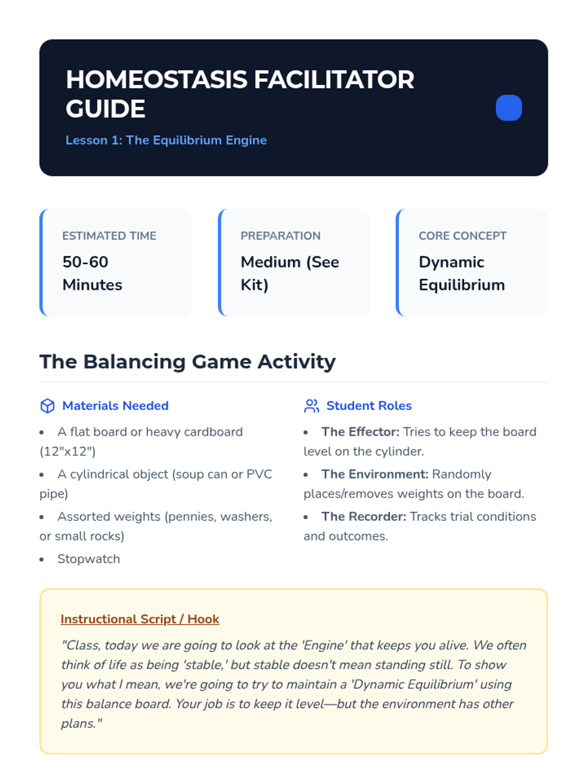 Introduction to the concept of dynamic equilibrium and the energy cost of maintaining homeostasis through a physical balancing simulation.