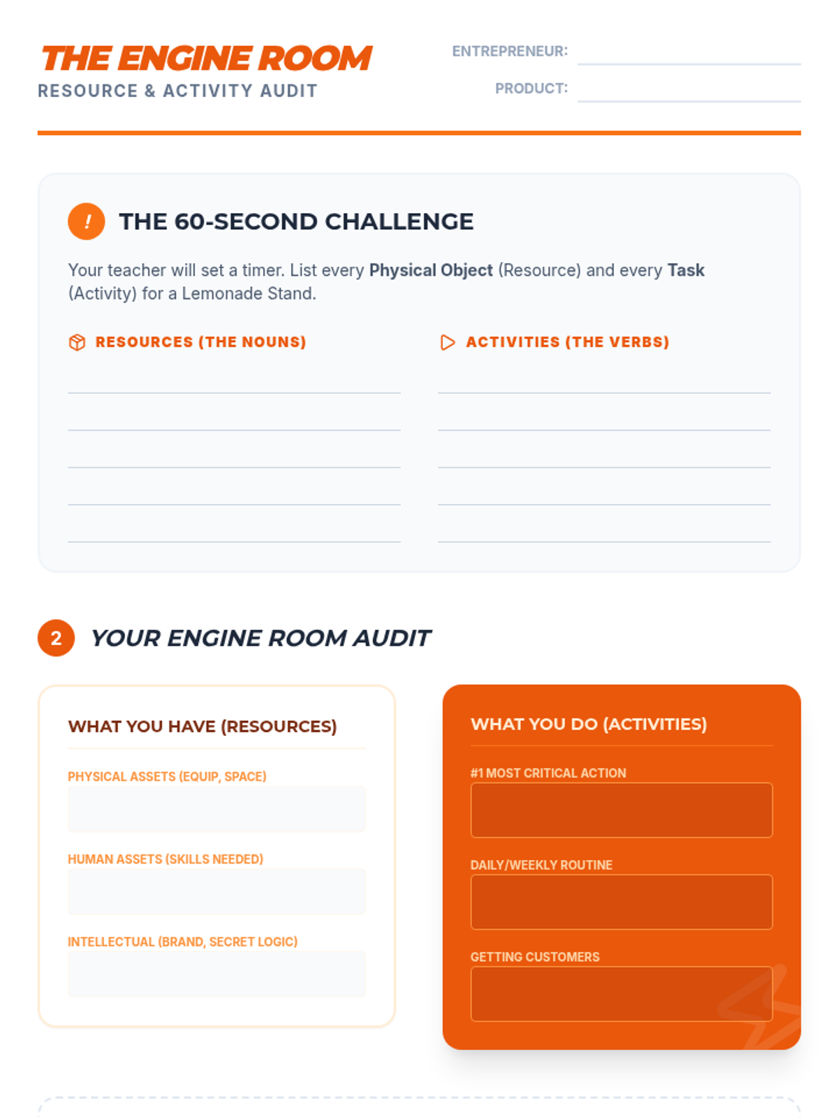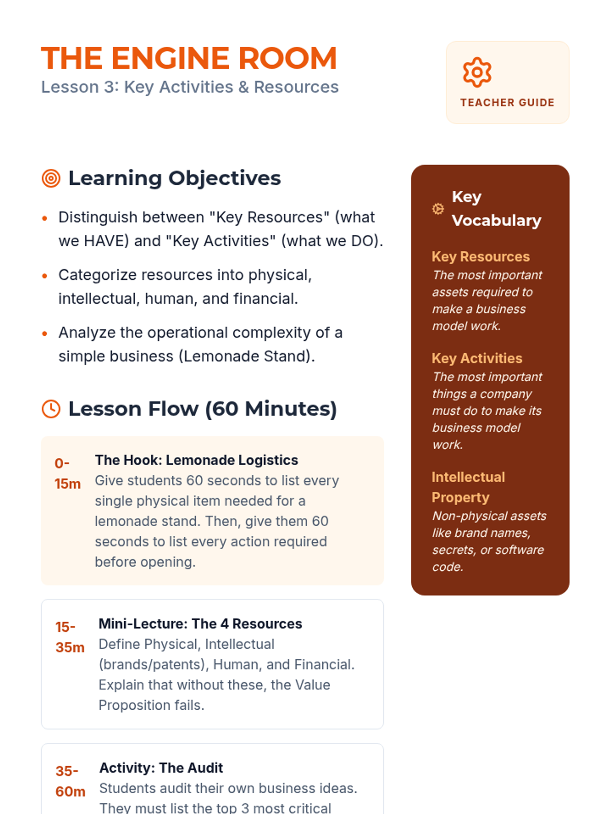 Students analyze the operational side of a business by listing the physical, intellectual, and human resources required. They distinguish between what a business 'has' versus what a business 'does'.
