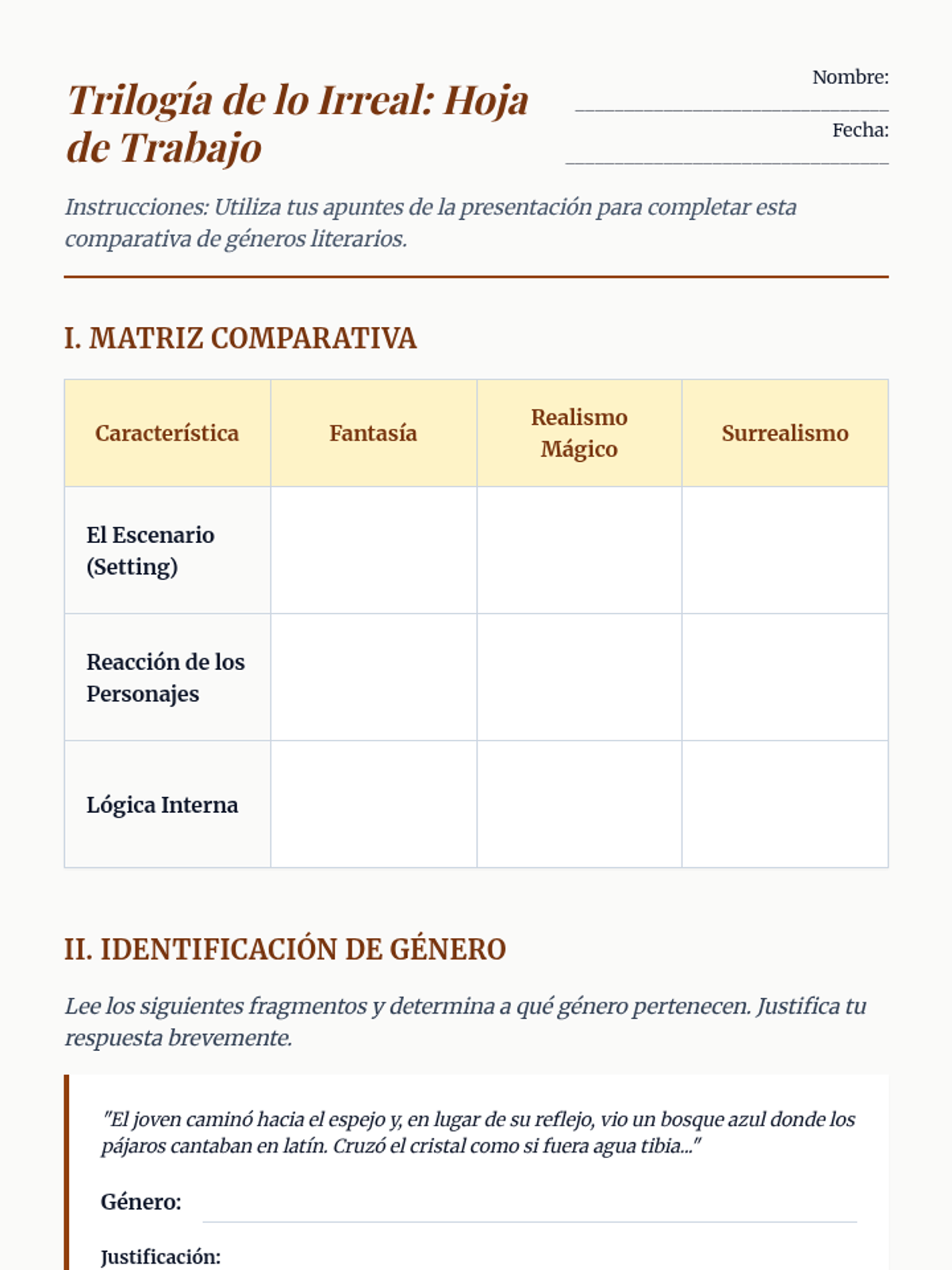 Students define Magical Realism by analyzing surrealist art and short text excerpts, distinguishing the genre from fantasy and surrealism.