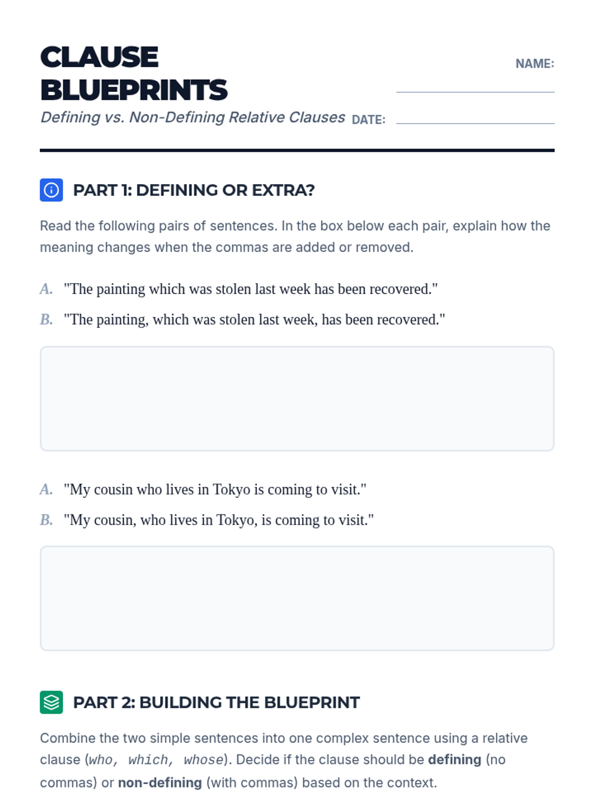Students explore the semantic and structural differences between defining and non-defining relative clauses, focusing on how commas change meaning in formal contexts.