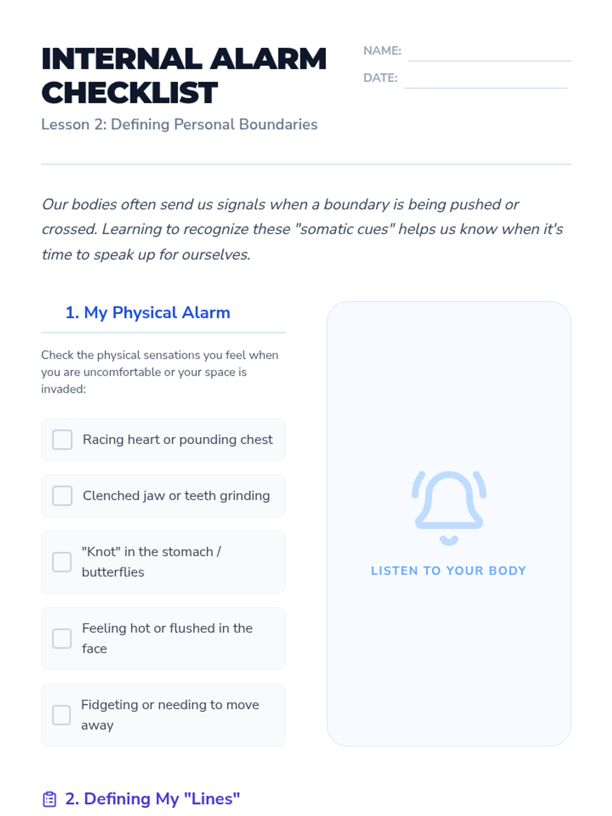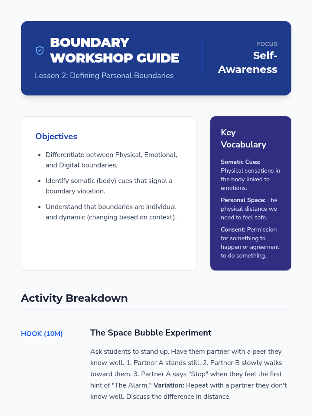 Students define physical, emotional, and digital boundaries while learning to recognize internal somatic cues that signal a boundary violation.