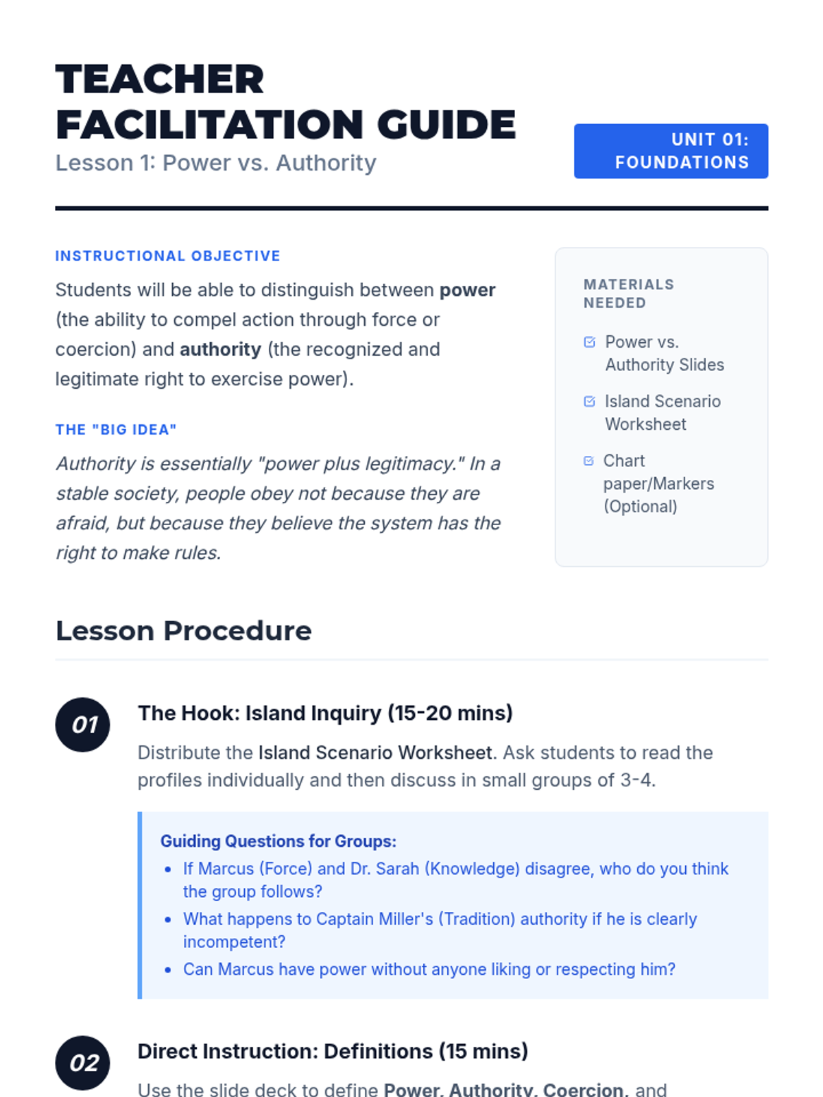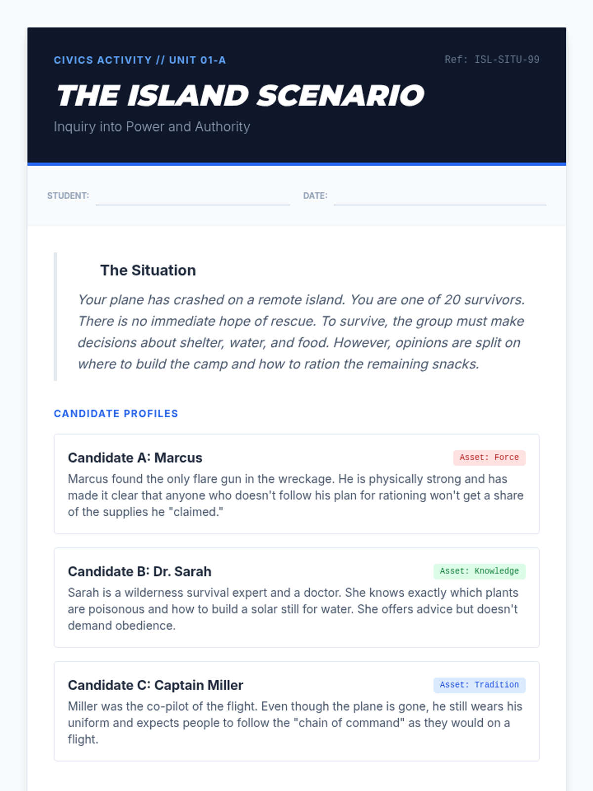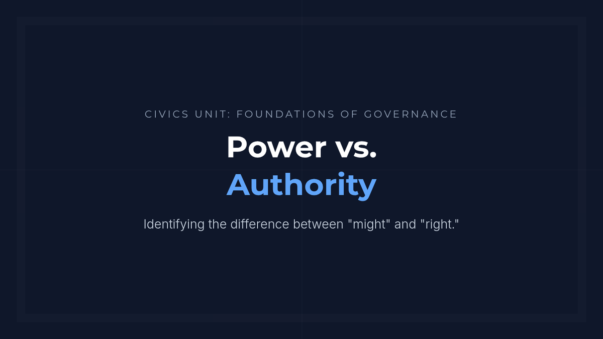Students explore the fundamental distinction between power (the ability to coerce) and authority (the recognized right to lead) through a 'desert island' inquiry scenario and visual analysis.