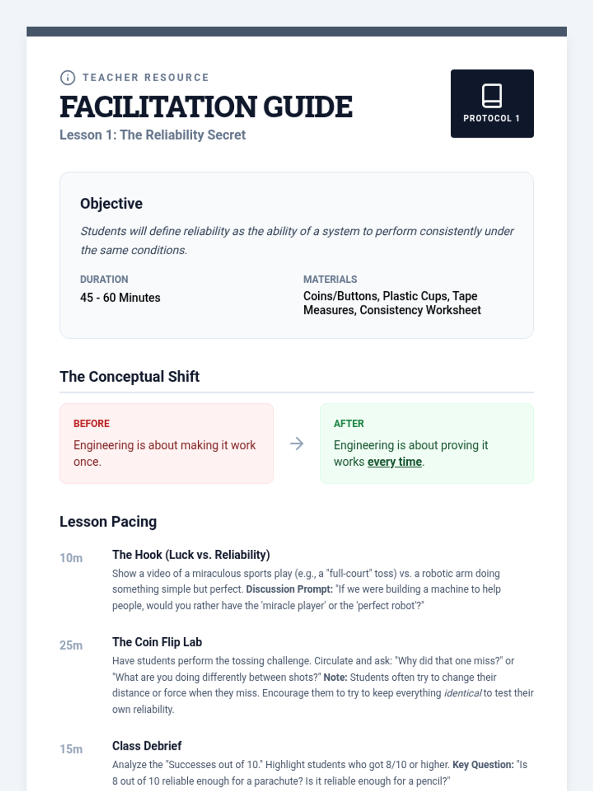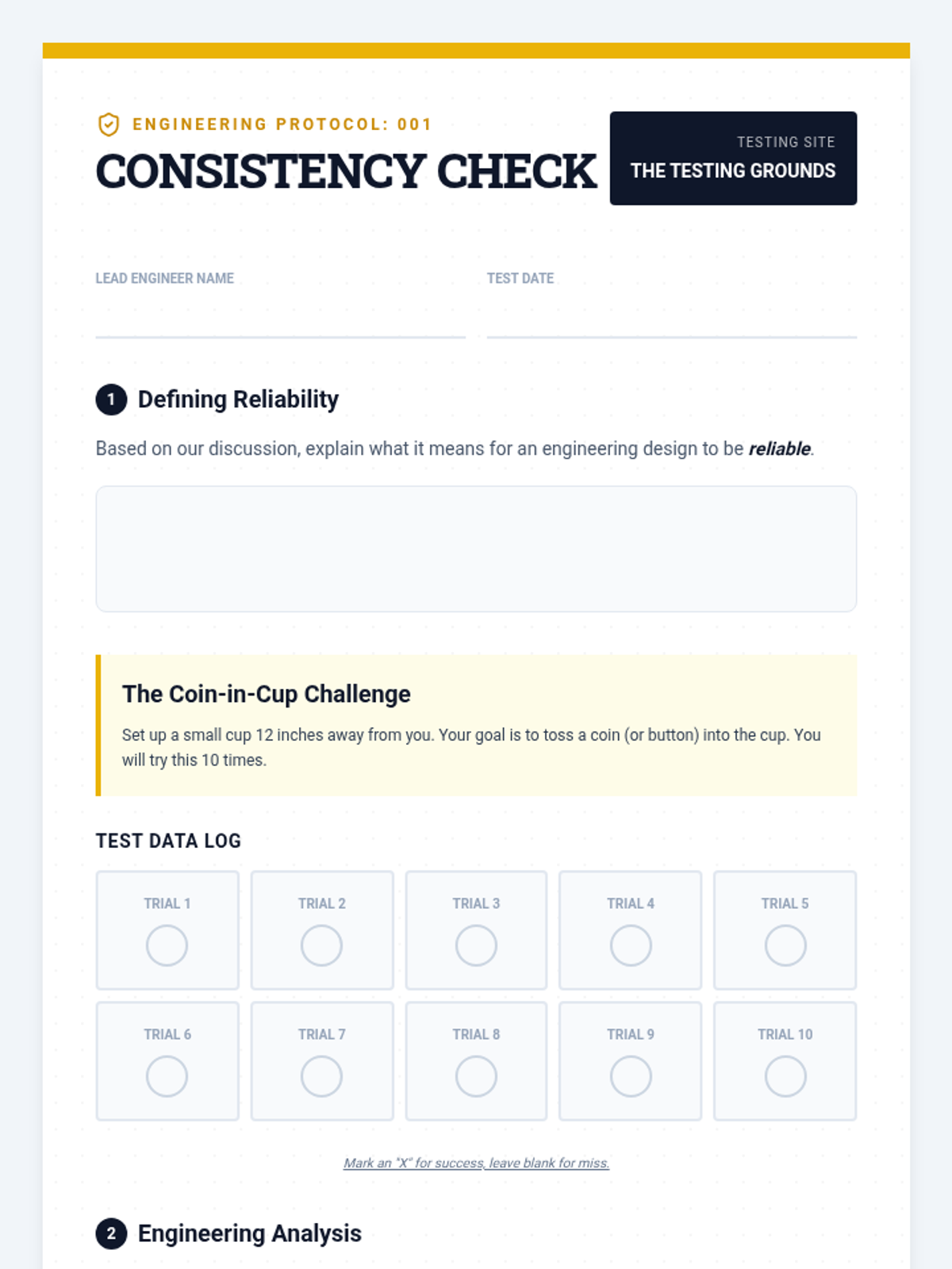 Students explore the difference between a lucky success and a reliable design by performing tasks multiple times to track consistency and defining reliability in engineering.