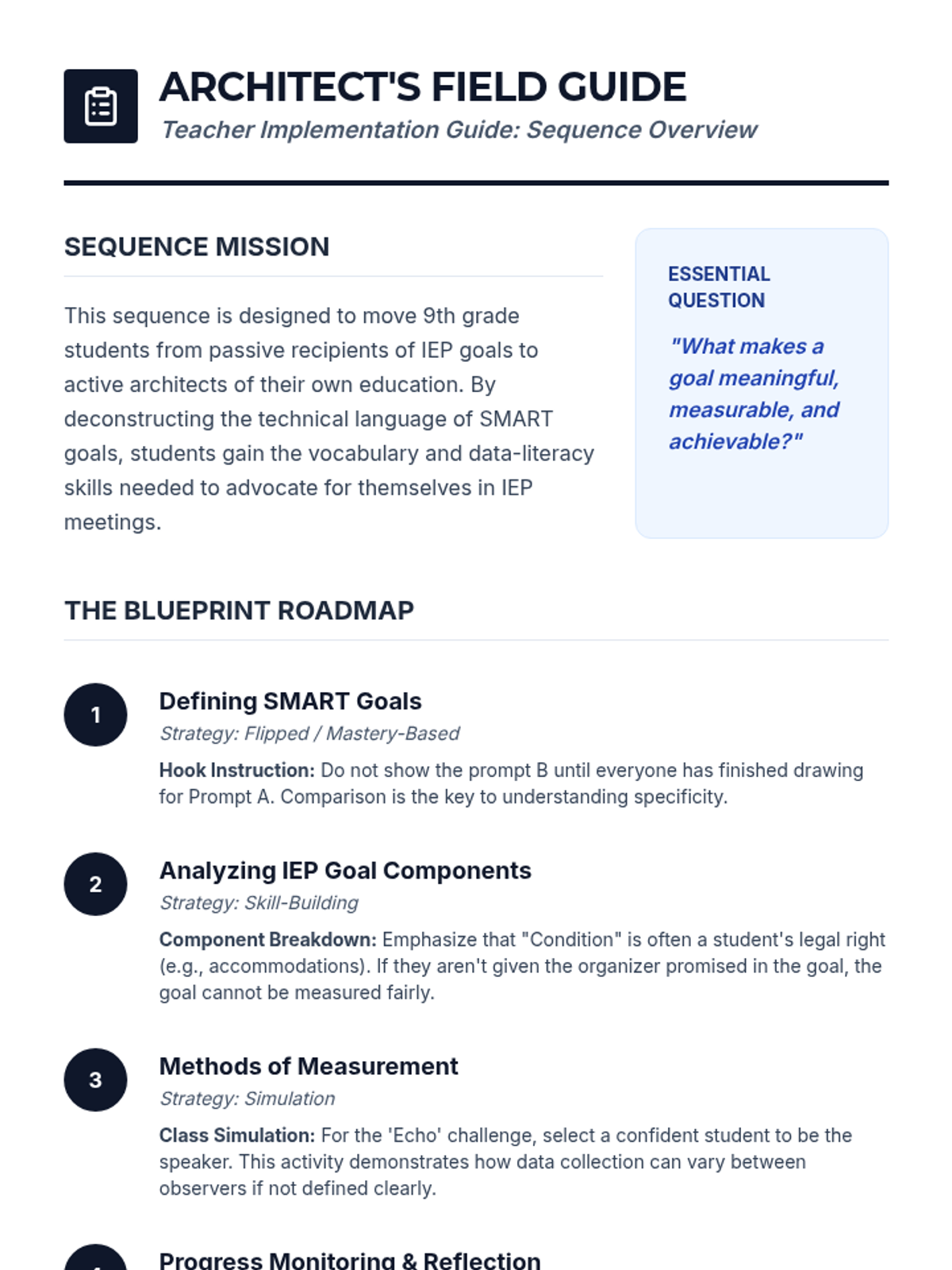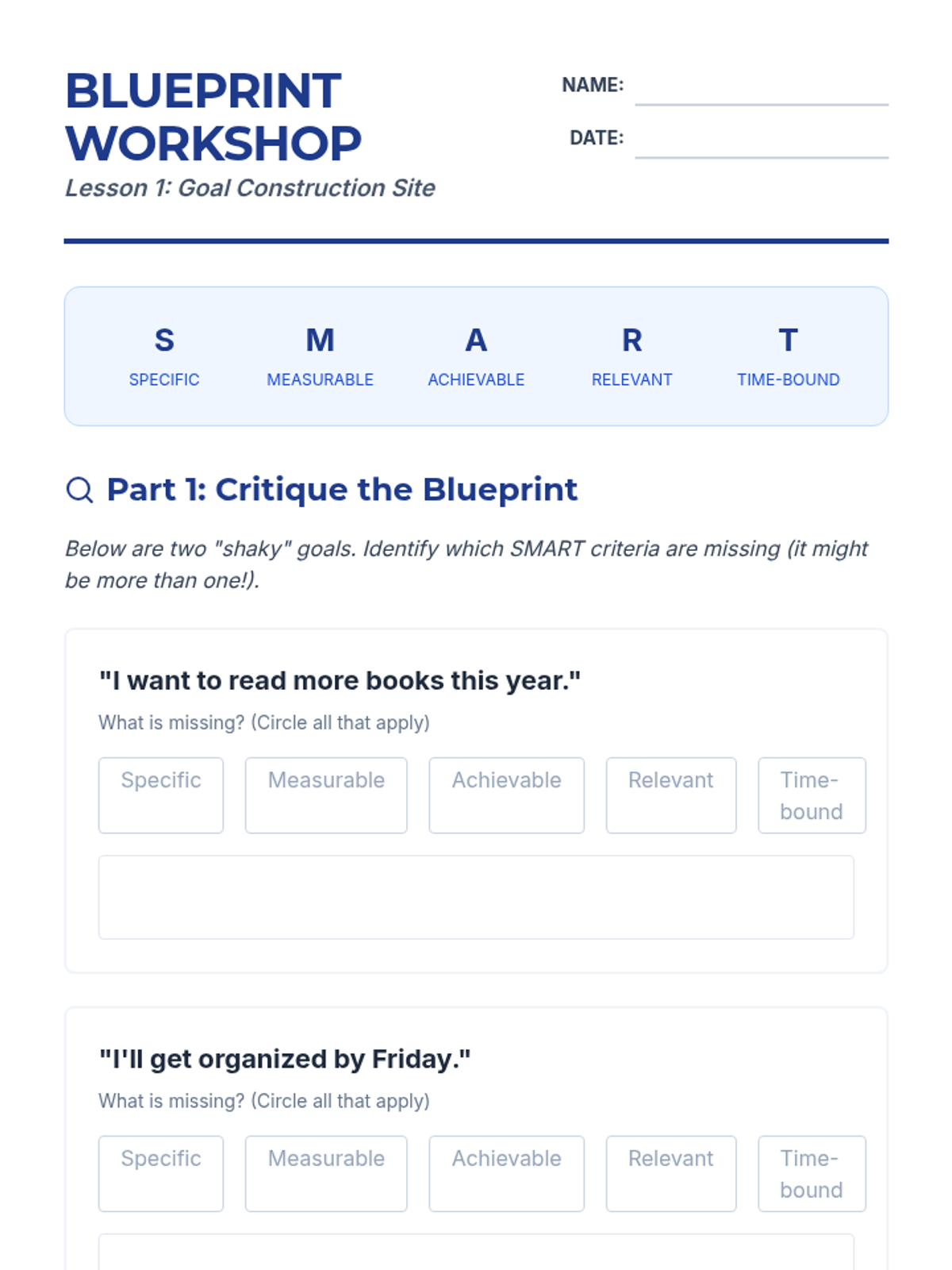 Students learn the SMART criteria through a 'draw a house' hook and practice transforming vague goals into specific, measurable statements.