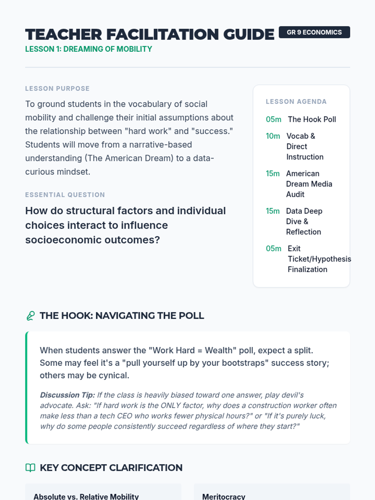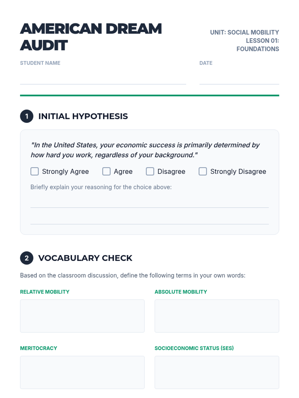Students define key economic terms like absolute vs. relative mobility and meritocracy while contrasting the 'American Dream' narrative with economic data.