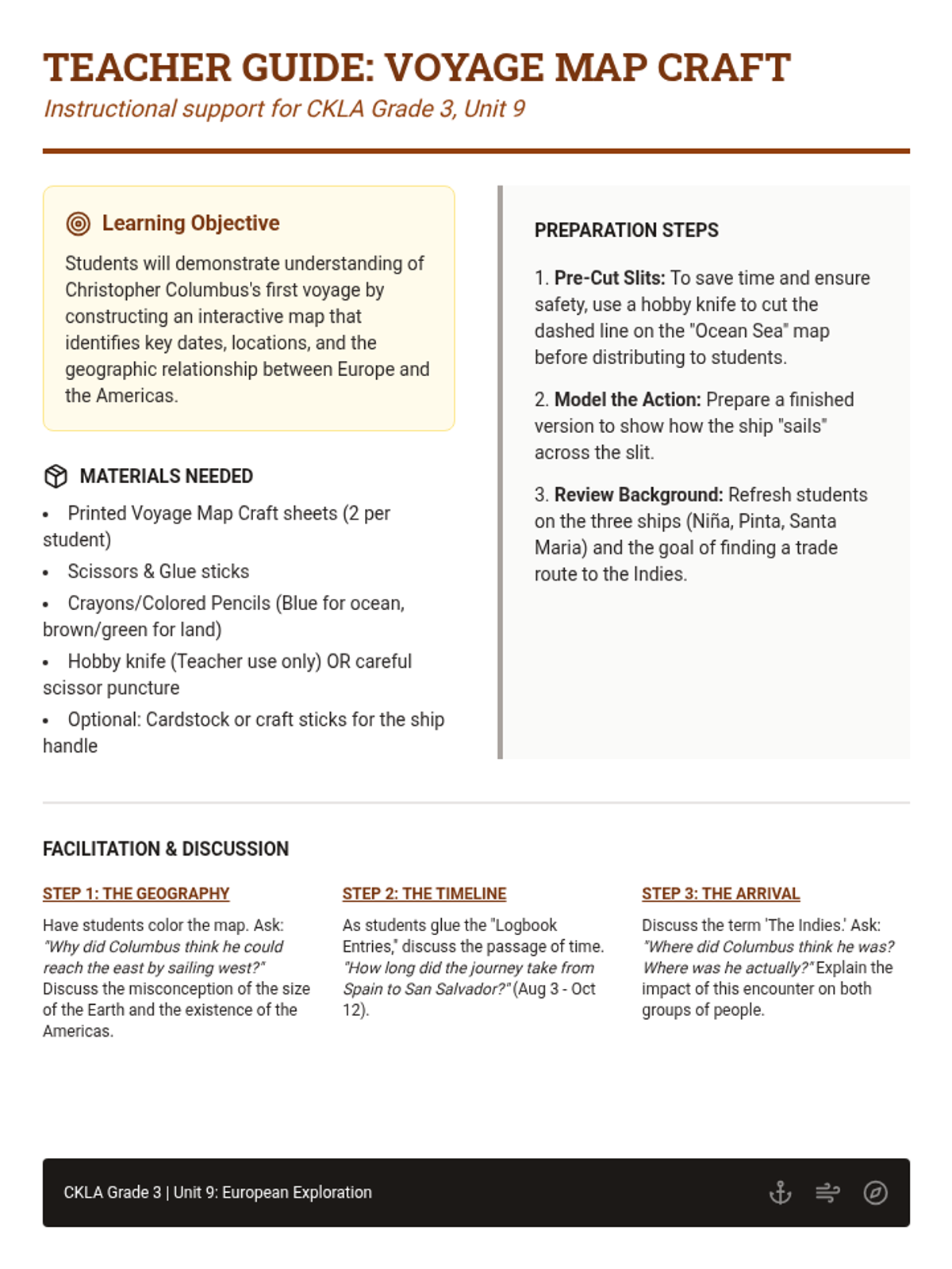 A hands-on crafting lesson where students build an interactive map of Christopher Columbus's first voyage to the Americas. This lesson reinforces CKLA Grade 3 Unit 9 concepts including the motivations for exploration and the geography of the Atlantic crossing.
