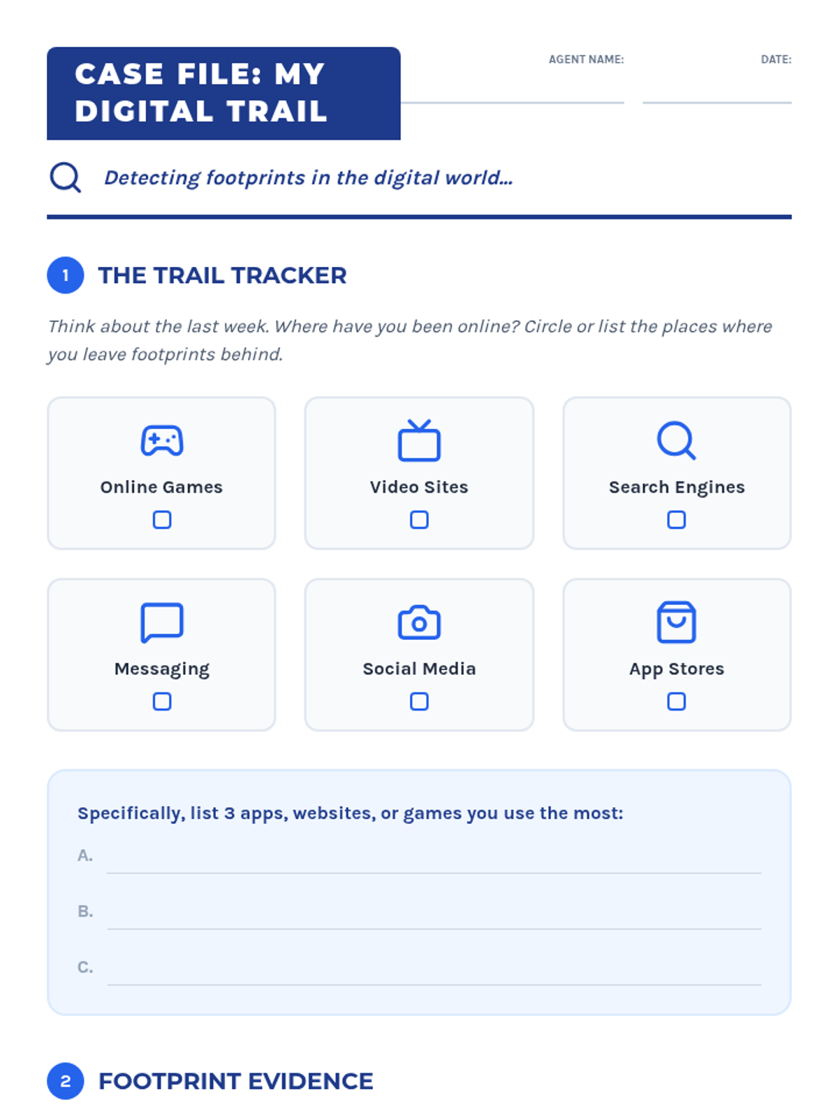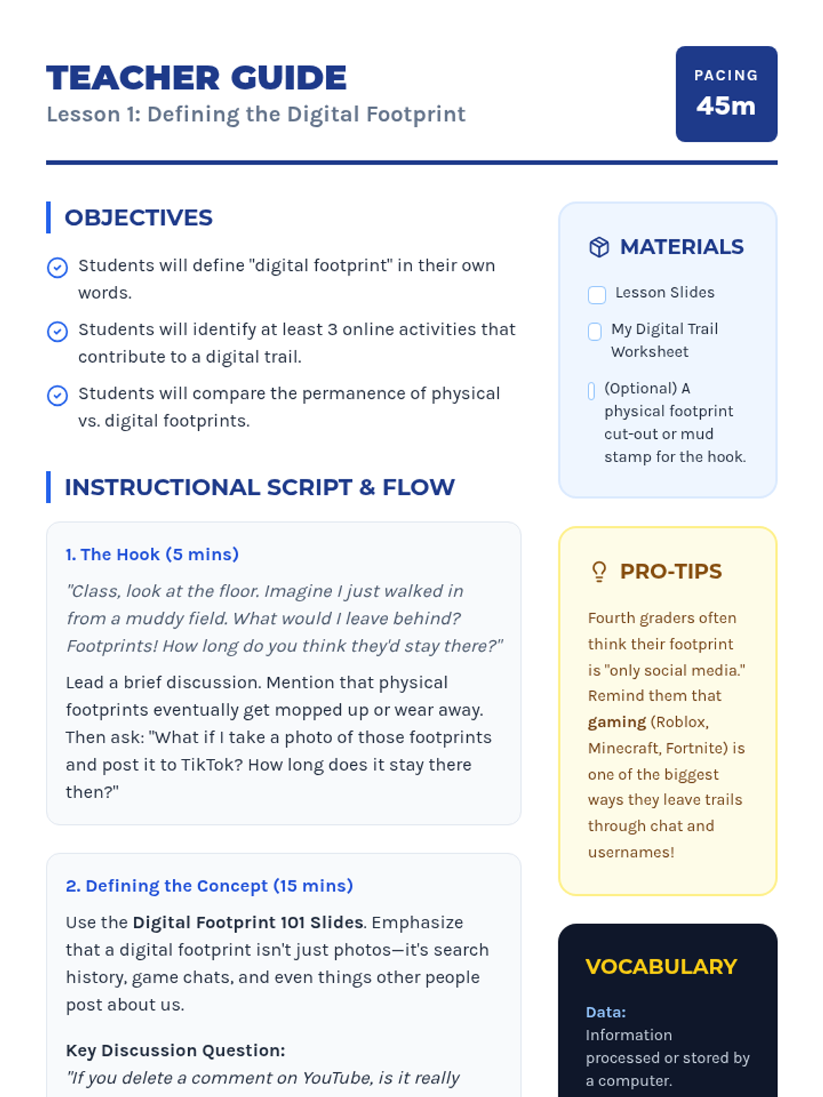 Students define what a digital footprint is by comparing physical trails to online records, identifying activities that contribute to their digital identity.