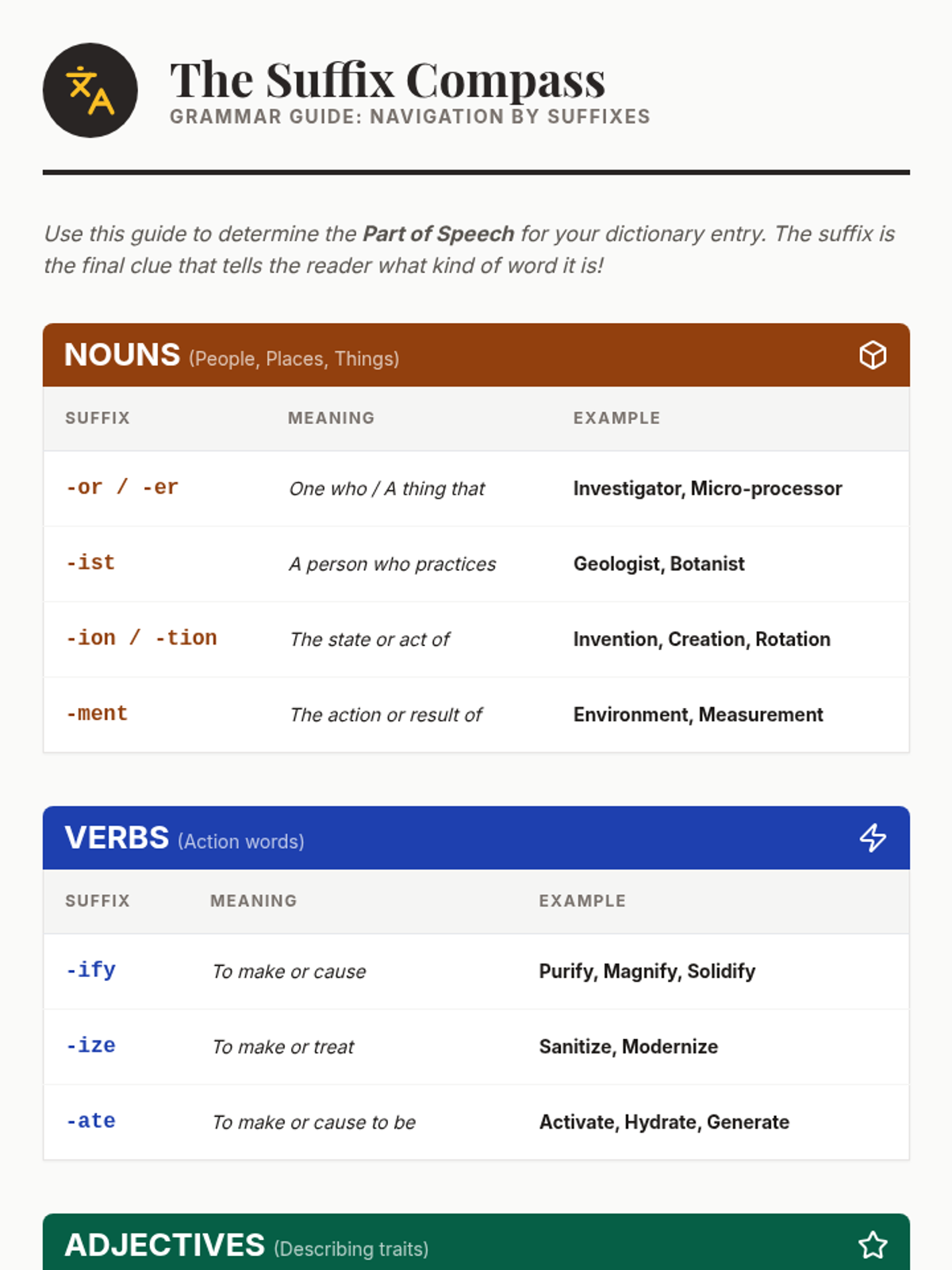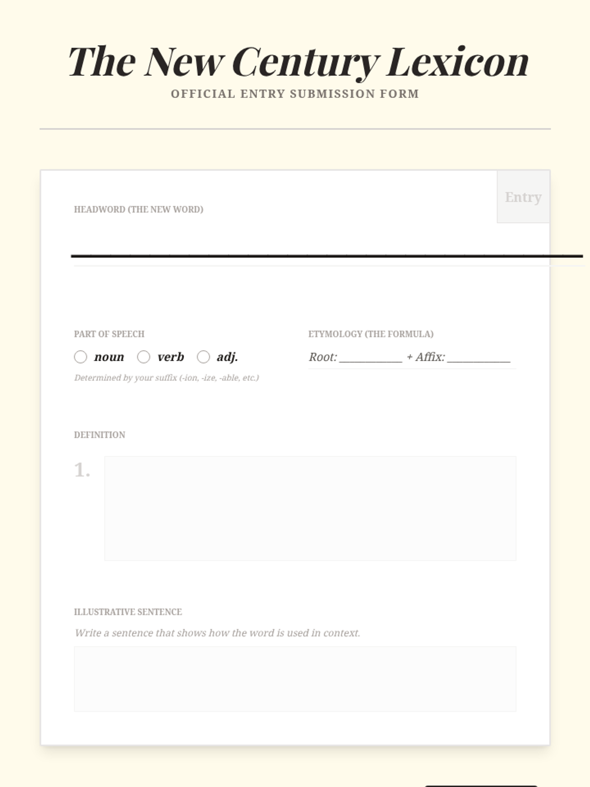 Writing formal dictionary entries for new words, focusing on how suffixes determine parts of speech.