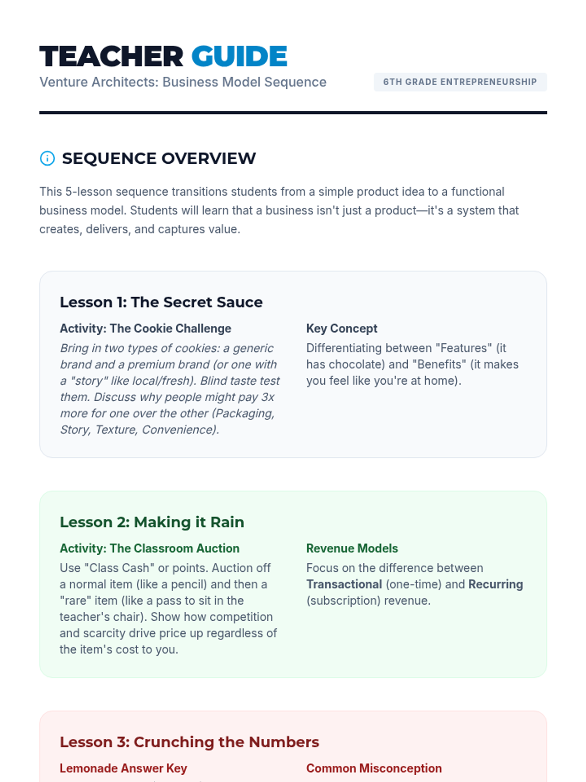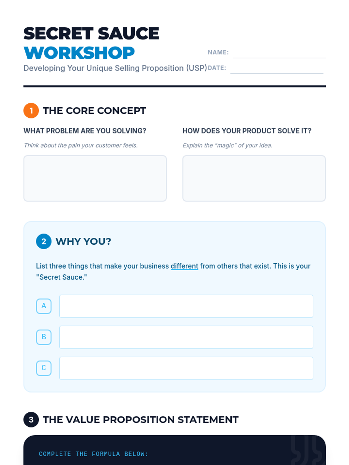 Students identify what makes their product unique and craft a Value Proposition Statement that articulates the benefit their solution provides to the customer.