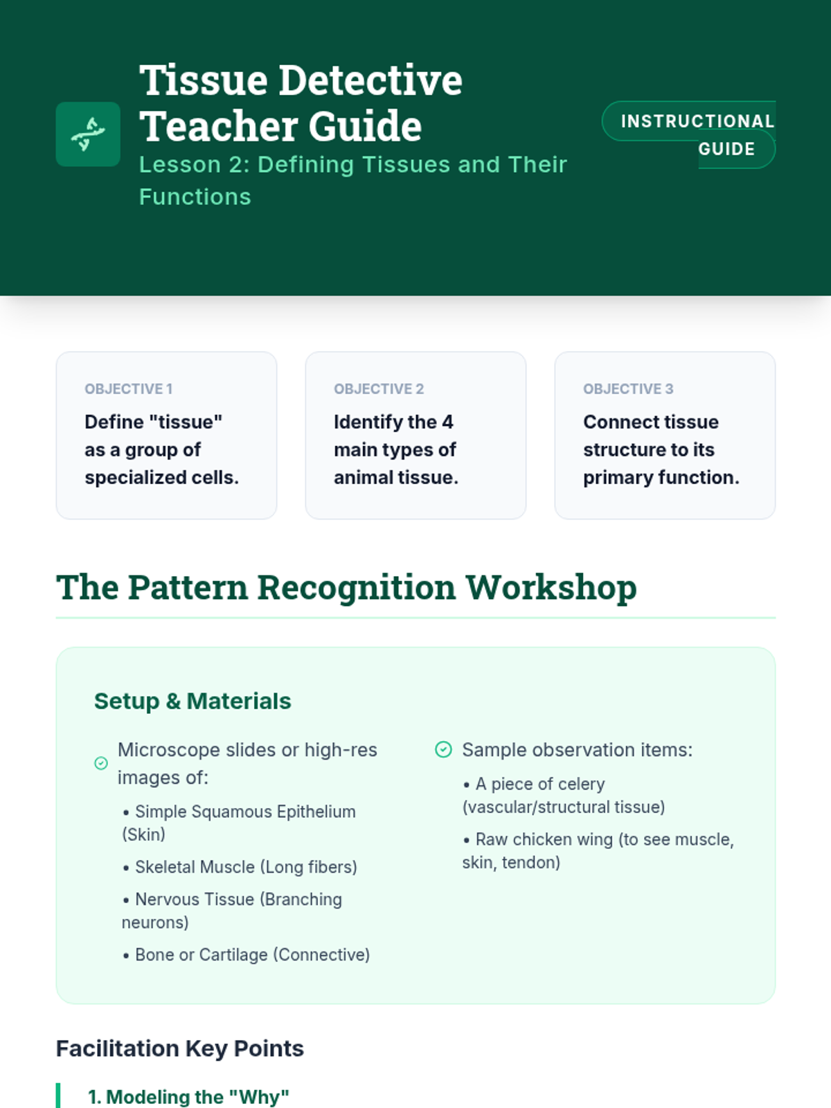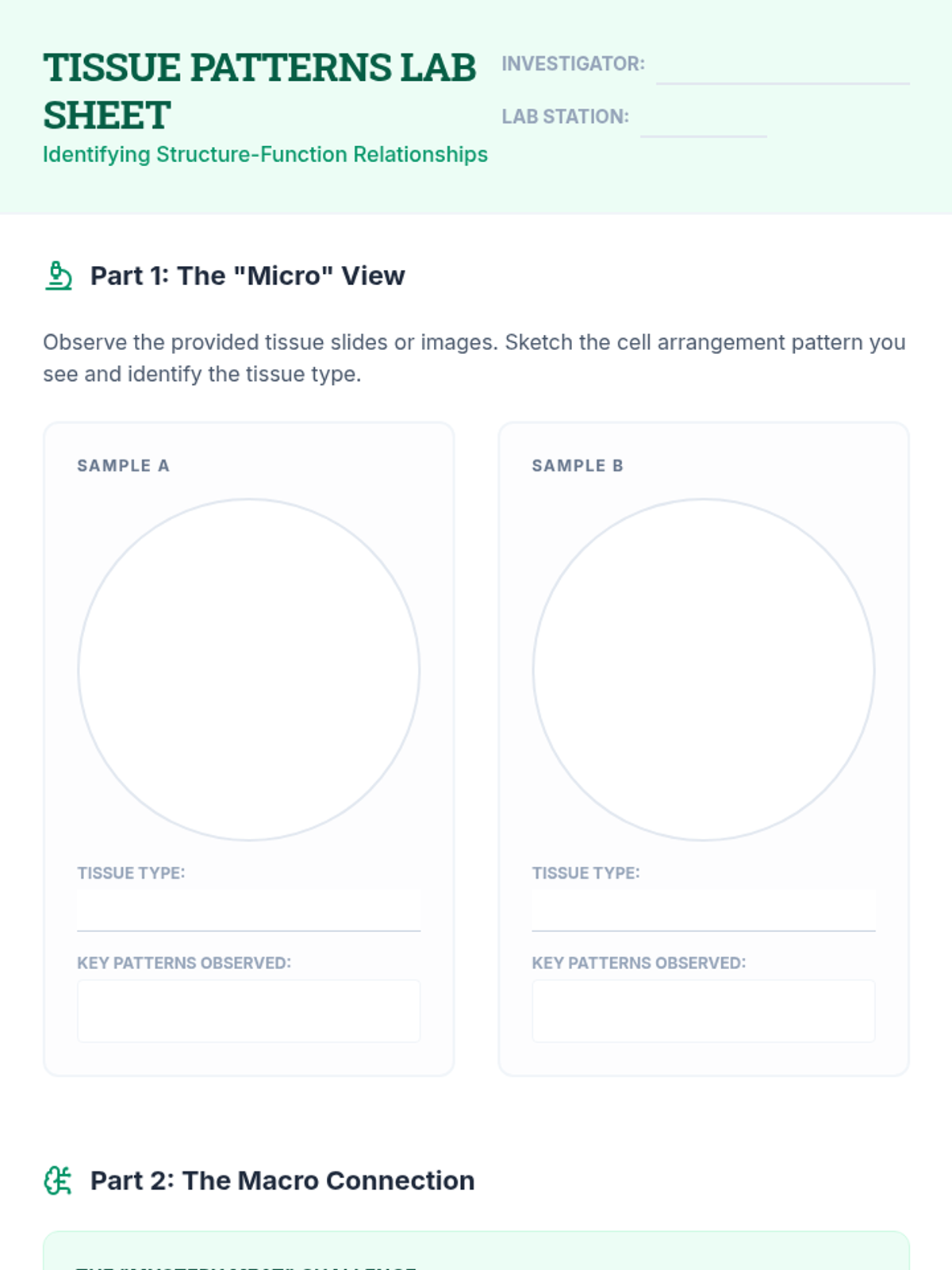 Students explore how similar cells group together to perform specific tasks, focusing on the four main types of animal tissue and their structure-function relationships.