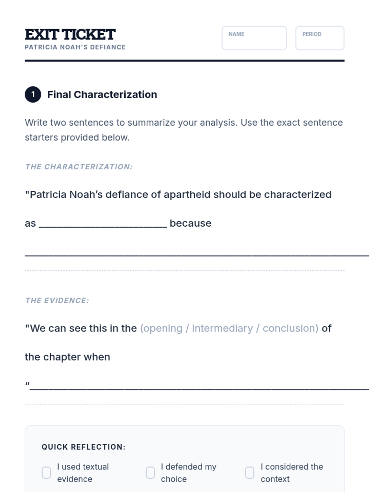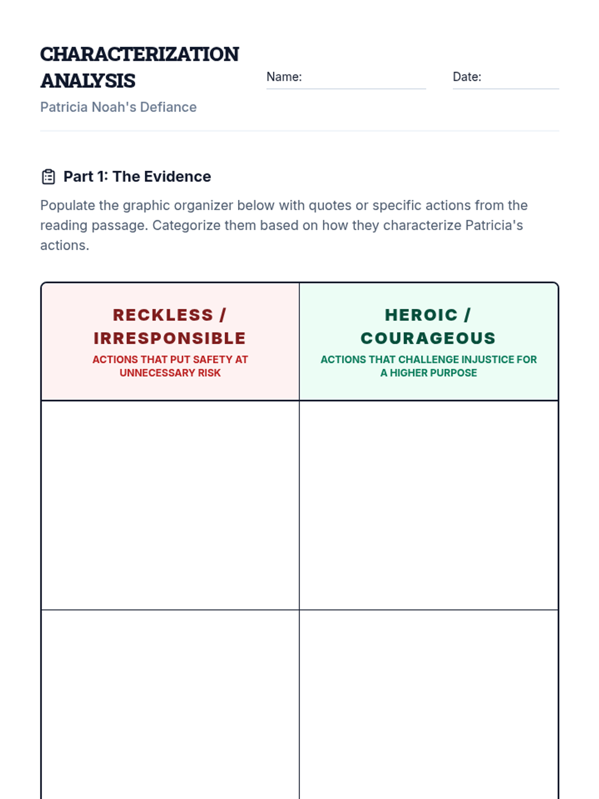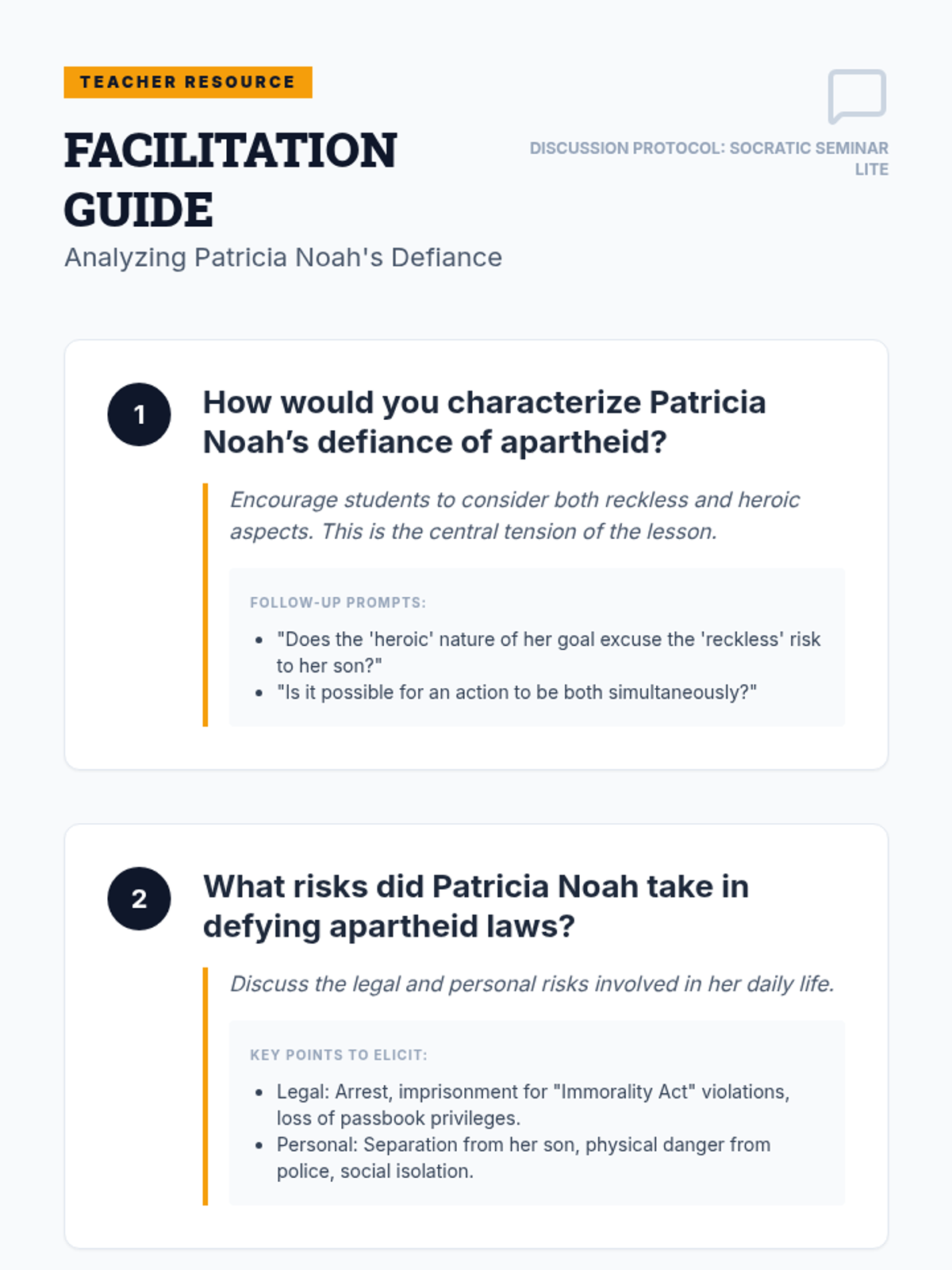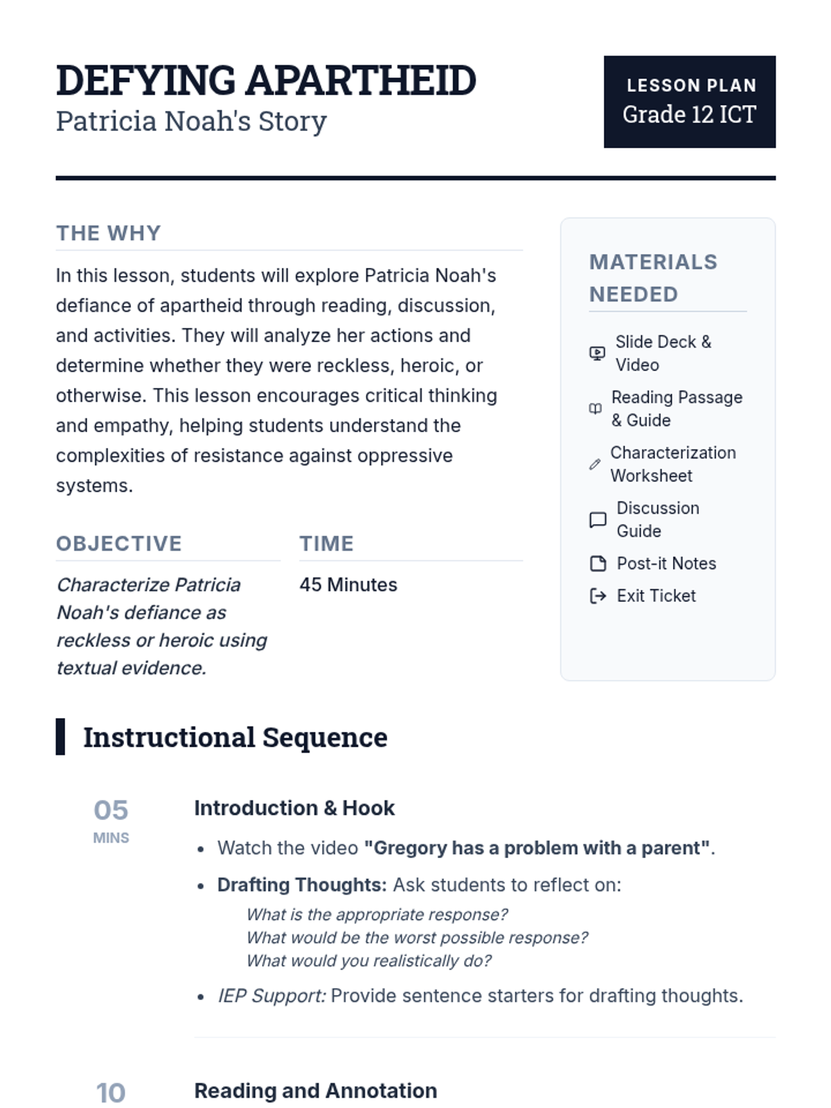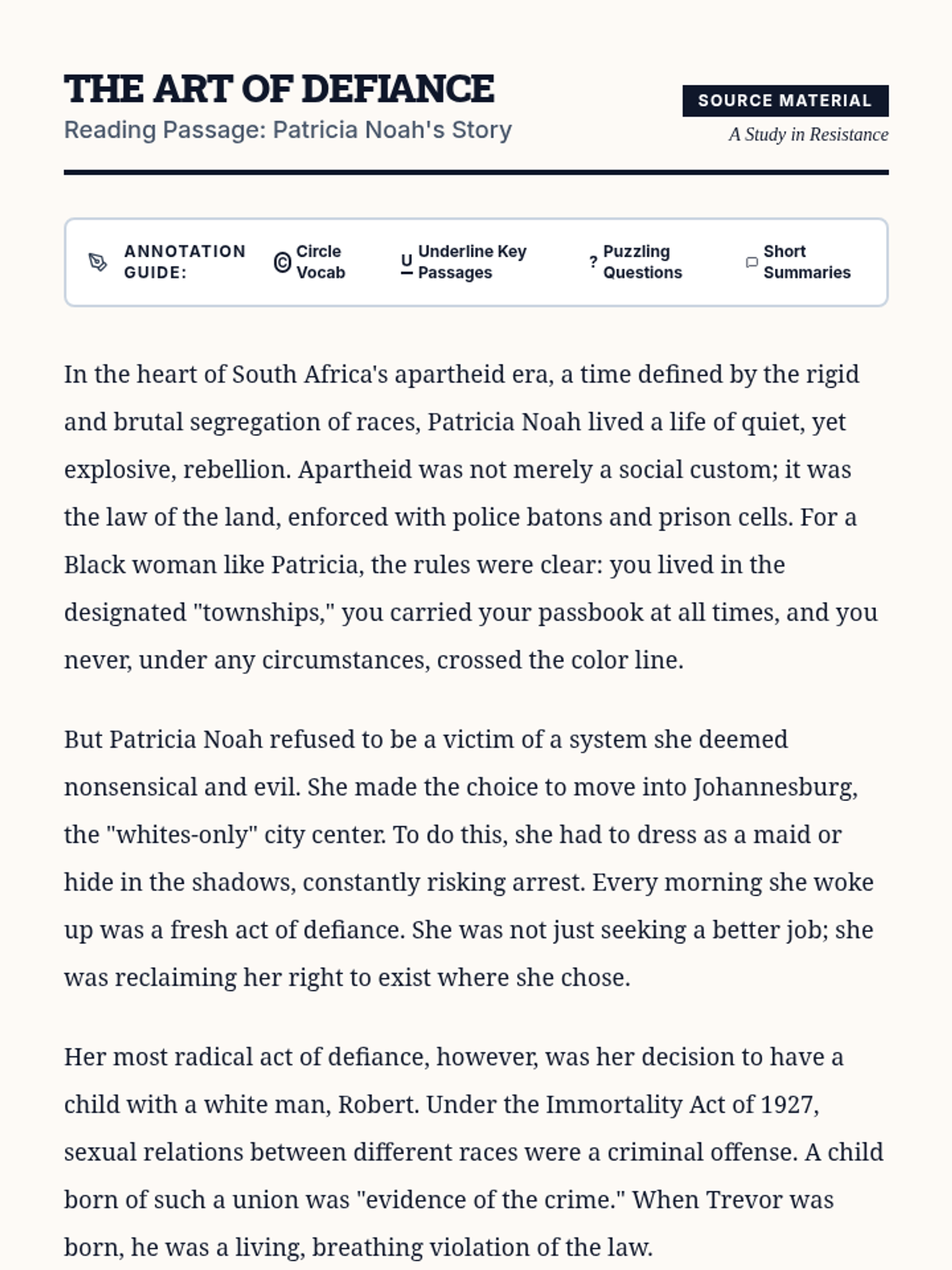 Students explore Patricia Noah's defiance of apartheid through reading, discussion, and analysis of her actions as reckless or heroic. This lesson fosters critical thinking about resistance against oppressive systems through the lens of Trevor Noah's mother.