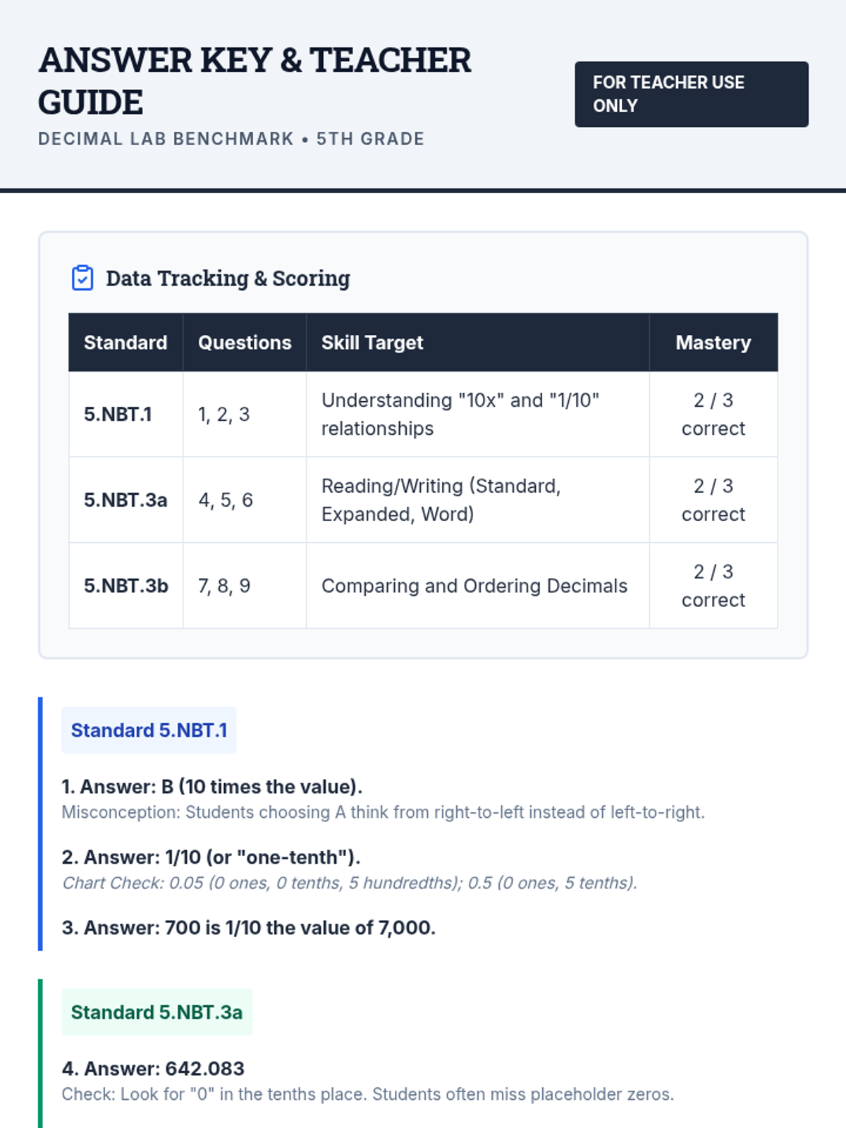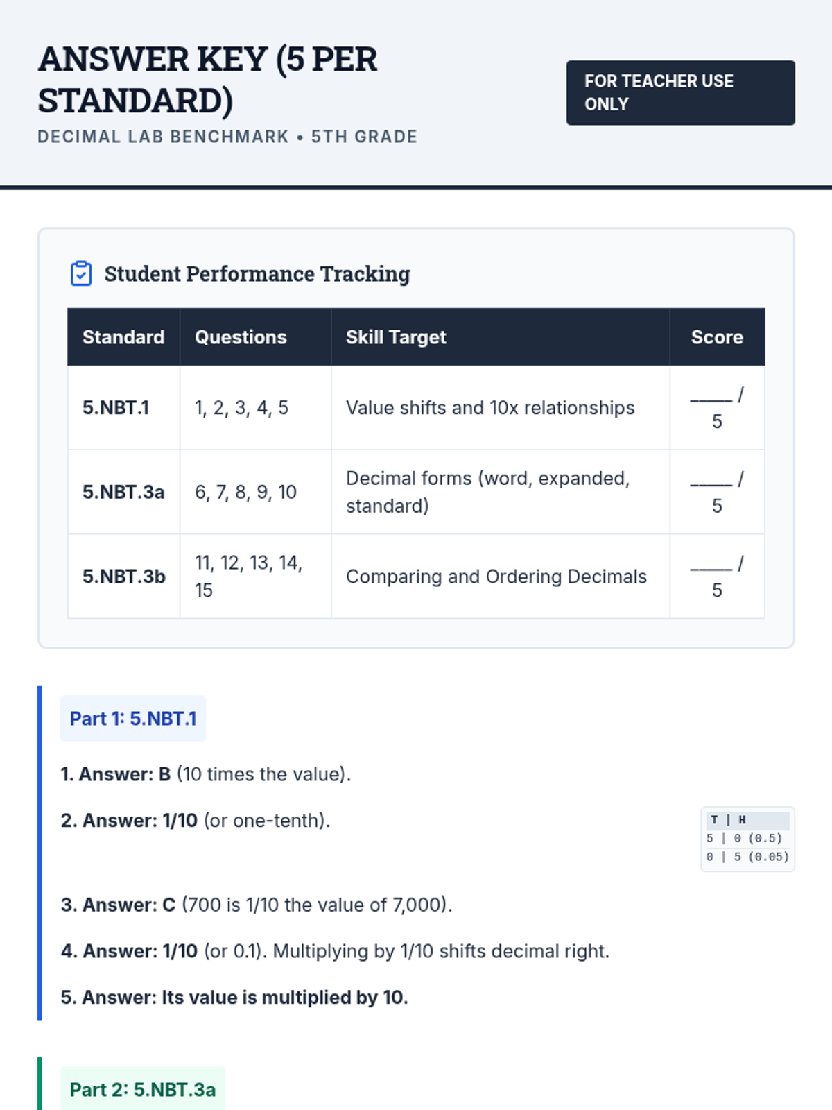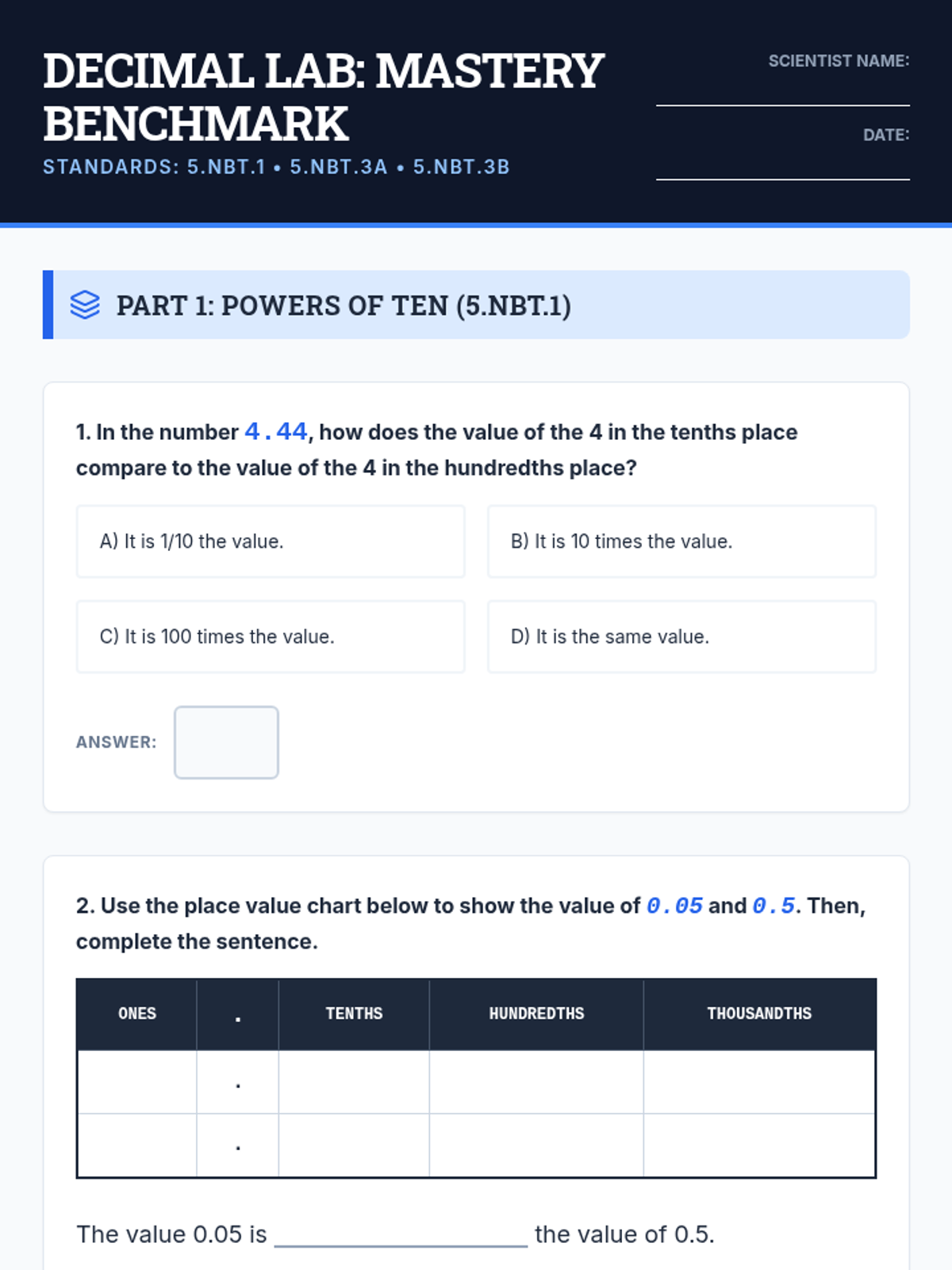 A comprehensive assessment focused on 5th-grade place value and decimal standards (5.NBT.1, 5.NBT.3a, 5.NBT.3b), designed to help teachers pinpoint exactly where students are struggling with multi-digit number relationships and decimal notation.