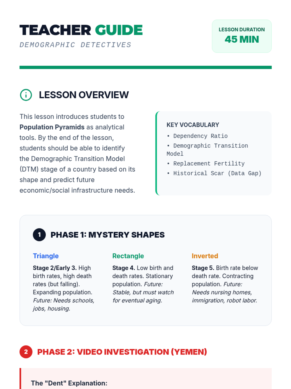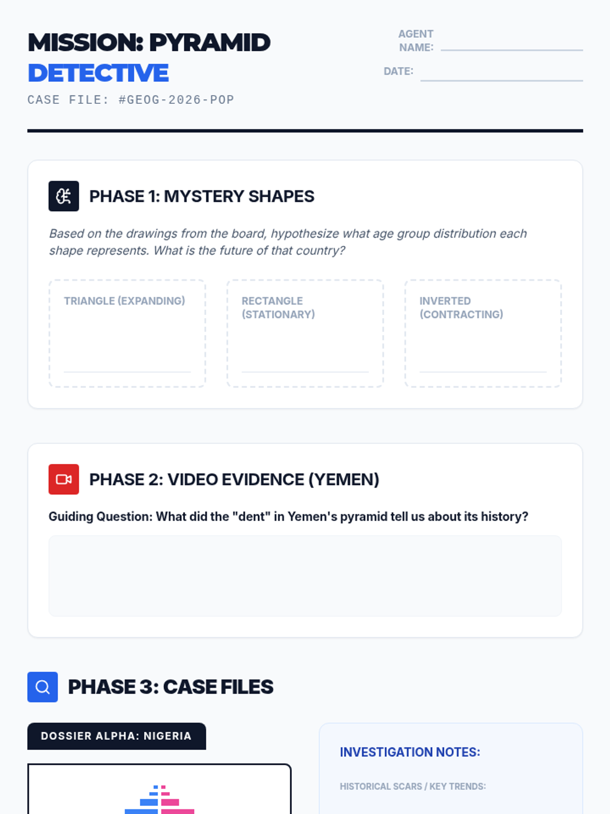 Students will investigate population pyramids as 'demographic detectives' to uncover historical events and predict future societal challenges for three distinct nations.