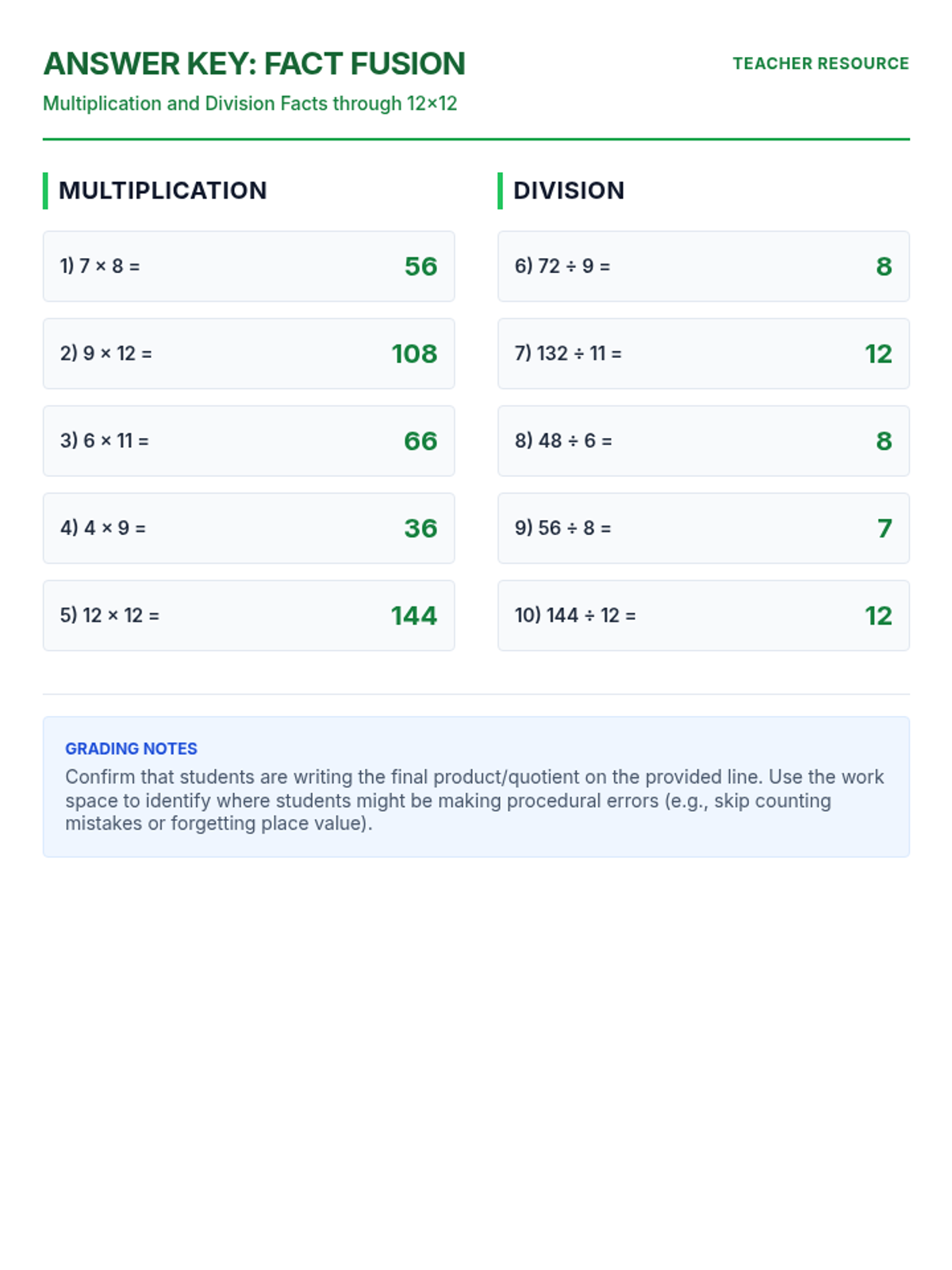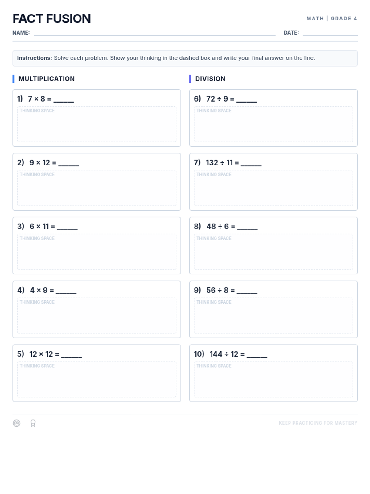 A focused practice session on basic multiplication and division facts up to 12x12. Students will solve five multiplication and five division equations to build fluency.